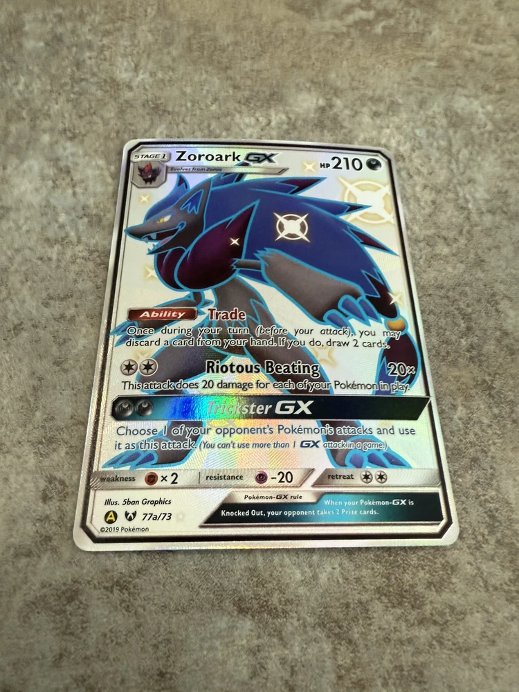 Full art shiny Zoroark GX Promo from Hidden Fates. Near mint card with no damage or wear and never used. Will be adequately protected upon shipment.