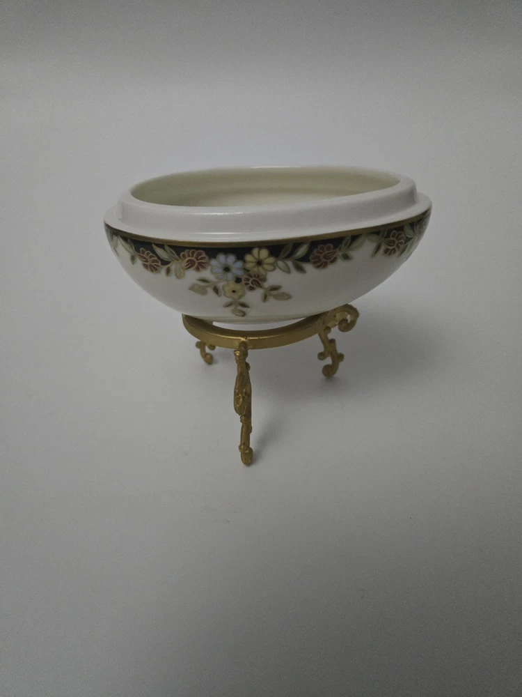 One (1) vintage hand-decorated porcelain egg-shaped trinket box from Zsolnay Porcelain, Hungary, with its original gold-tone filigree stand. Description: This delightful lidded egg-shaped box is a fine example of Zsolnay's craftsmanship, featuring a rich floral garland motif accented in 24K gold detailing. Resting on an ornate, Rococo-style tripod stand, it makes an elegant statement for any curio cabinet, vanity, or Easter display. Marked on the base with the green Zsolnay Pécs 5-tower shield stamp and "Made in Hungary", used post-WWII. The painted production numbers date 1955. Highlights: Maker: Zsolnay Porcelain Manufacture, Pécs, Hungary Pattern: Hand-painted floral garland with gold highlights Era: Mid-century (dated “9/55”) Style: Rococo Revival / European Decorative Material: Fine glazed porcelain with gilt brass metal stand Mark: Zsolnay 5-tower green underglaze stamp with “Made in Hungary” Condition: Excellent vintage condition. No chips, cracks, or repairs. Lid fits securely. Gilt is vibrant with only minimal vintage wear to the metal stand. --- Shipping & Handling: Item will be professionally packed, double-boxed, and shipped insured for full value via USPS Priority or UPS Ground. Local pickup available upon request.
