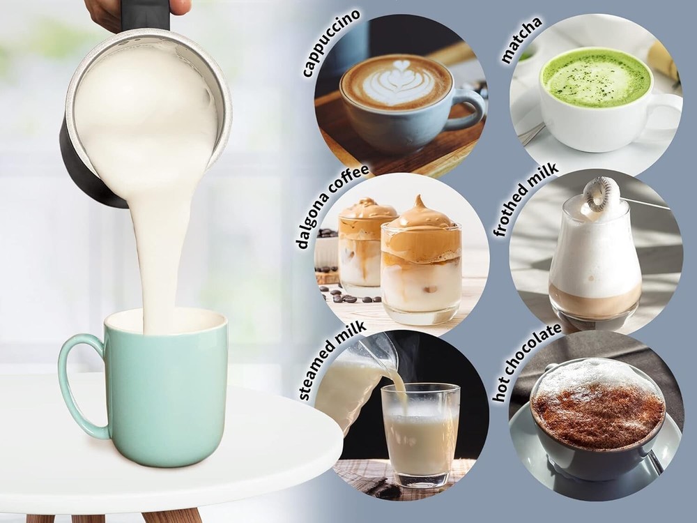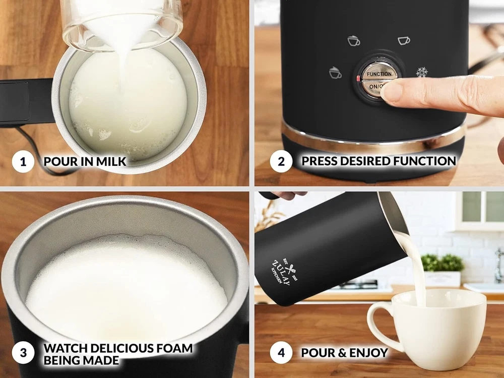 Zulay Kitchen 4-in-1 Milk Steamer - Automatic Milk Frother Electric (10oz/300ml) - Milk Frother and Steamer - Stainless Steel Electric Milk Frother For Latte, Cappuccino, Hot Chocolate (Turbo Black) Brand Zulay Kitchen Special Feature Bpa Free Color Black Material PP, Stainless Steel Product Dimensions 4.21"W x 8"H About this item 4-in-1 MILK FROTHER AND STEAMER: Achieve the desired milk texture with the one-button control functionality of this electric frother. Press once for warm and thick milk froth, twice for warm and less froth, thrice for hot milk with less froth, and four times for cold froth. It can also melt chocolate for hot cocoa or heat up milk for your coffee creations. YOUR OWN COFFEE SHOP AT HOME: Experiment with your coffee creations using our milk steamer. Use it to foam dairy and nondairy milk for lattes, cappuccinos, matcha, hot chocolate, iced coffee, and much more. It has a total capacity of 300ml, and is recommended to fill it up to 150ml when frothing milk. QUICK AND QUIET: Make deliciously creamy froth or heat milk for hot cocoa in seconds without waking anybody up in the morning using our low-noise milk heater. It comes with a transparent lid that provides a secure fit to prevent any spillage. EASY TO CLEAN: This electric frother is designed with a non-stick interior coating that can be rinsed under water easily to get rid of any milk residue. You can use a damp towel to wipe the exterior. Avoid letting any water run down the side near the power base. DURABLE AND SAFE TO USE: This electric milk frother is constructed with a food-grade stainless steel rust-resistant interior and a shatterproof Tritan lid, making it fit for everyday use. The exterior and handle remain cool to keep your hand from burning. This milk frother and warmer is designed to turn off automatically to prevent overheating. HASSLE-FREE, ZULAY GUARANTEE: We are a family owned USA business that believes in providing customers with best-quality products. Our milk foamer is backed with a lifetime warranty. If there are any issues, contact us, and we will always be available to make it right.