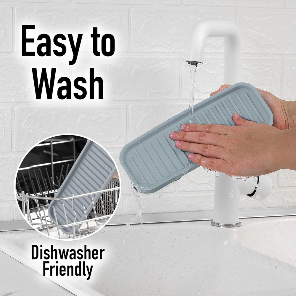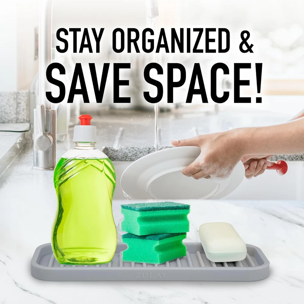 MESS-FREE KITCHEN: Effortlessly keep your sink and kitchen countertop free from soapy residue with our sponge holder. With a size of 3.5 x 9 inches, this silicone tray is ideal for holding a cleaning sponge, brush, scrubbers, dish soap bottle, hand soap bar, and silverware. You can also use it in your utility rooms, bathroom, laundry area, and even your vanity. DURABLE AND HEAT RESISTANT: Built with non-scratch silicone, this dish soap holder is thick, durable, and made to last. Our kitchen sponge holder can withstand heat up to 570°F, making it ideal for hot tools like cooking spoons, curling irons, or straighteners. ANTI-SLIP SILICONE: We have conveniently designed this sink tray with 18 raised ridges and elevated edges that prevent the overflow of water, helping to air-dry wet items better. Your dish sponges will last longer without that strong, musty odor with our silicone soap dish. EASY TO CLEAN: Cleaning the goopy, sticky, and discolored soap residue off this dish scrubber holder is a breeze. Hand wash it with warm water or toss it in the dishwasher to get it ready for keeping your sink organized, protected, and clutter-free. HASSLE-FREE, ZULAY GUARANTEE: We love and take pride in our sponge holder and back it with a lifetime guarantee. If there are any issues, just contact us, and we will make it right. Keep everything in place with this sink tray! Product Description
