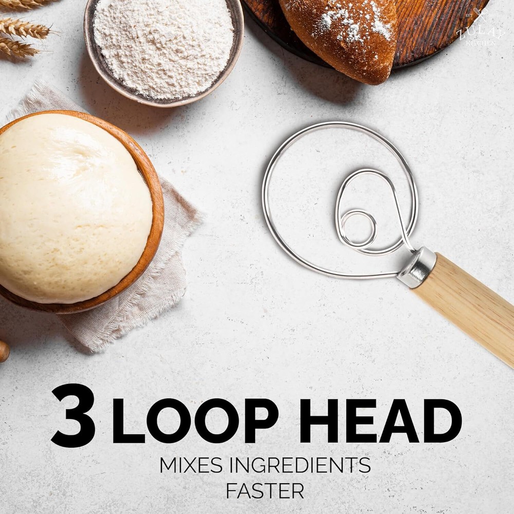 Zulay Kitchen 13-Inch Danish Dough Whisk - Wooden 1 Pack, Rubberwood Product Details Color: Rubberwood Brand: Zulay Kitchen Style: Danish Product Dimensions: 13"L x 3.1"W Is Dishwasher Safe: No Head Material: Stainless Steel Manufacturer: Zulay Kitchen Item Weight: 5.6 ounces Item model number: Danish Dough Whisk Is Discontinued By Manufacturer: No WHISKING MADE EASY: This Danish dough whisk is a must-have for anyone looking to achieve perfectly mixed dough and batter. With this baking tool, you can mix ingredients quickly without the need for a heavy-duty mixer. The high-quality, rust-resistant stainless steel ring is durable enough to stir and remove clumps from light and stiff dough. FLOW THROUGH DESIGN: Aerate high-moisture doughs like sourdough effortlessly with this brodpisker. The three-loop design can cut through and combine ingredients like butter or eggs without overmixing the dough. This flexible whisking tool is great for scraping the dough from the corners of a bowl and also helps get the sticky dough off the whisk easily. EASY TO HOLD: Mix thick dough without worrying about hand fatigue with this lightweight kitchen whisk. The long ergonomic wooden handle helps mix up dough with ease and comfort. Unlike a wooden spoon, this dough mixer is perfect for getting that smooth texture a lot quicker. From bread and cake batters to pancakes and muffins, this stainless steel whisk is ideal for baking like a pro. EFFORTLESS CLEANUP: After baking a delicious recipe, dealing with a messy and sticky whisk is the last thing you want to do, and this dough hook takes all your worries away. The flexible wire construction prevents clumps from getting stuck; simply run the whisk under water and use your fingers or a brush to get any dough out of the loops or crevices.