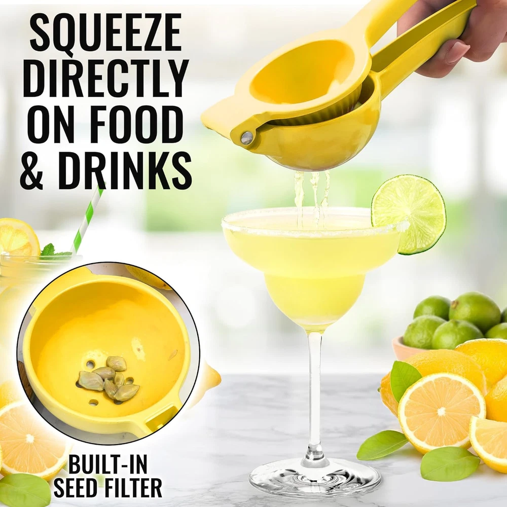 Zulay Kitchen Metal Lemon Squeezer - Handheld Single Bowl, Bright Yellow Product Details Brand: Zulay Kitchen Color: Bright Yellow Special Feature: Manual Product Dimensions: 2.9"D x 8.7"W x 2.1"H Finish Type: Clear Cut Recommended Uses For Product: Lemon Product Care Instructions: Dishwasher Safe Capacity: 0.5 Liters Power Source: Manual Blade Material: Plastic Controller Type: Manual Manufacturer: Zulay Kitchen Model Name: Single Bowl Lemon Squeezer Item Weight: 6.7 ounces Item model number: sqeeze-001 Is Discontinued By Manufacturer: No MaterialIs Dishwasher Safe: AluminumYes GET EVERY LAST DROP OF JUICE: Our lemon squeezer won’t waste even a single drop from your favorite fruit! Watch limes, lemons, and small oranges beg for mercy, even with a soft squeeze. The holes at the bottom of the citrus juicer serve as a built-in strainer. SAVE TIME AND EFFORT: You no longer have to worry about power, replacing batteries, or bulky juicers crowding your kitchen counter with our manual citrus squeezer. Quench your thirst by making a citrusy lemonade or margarita; simply place a half cut lemon/lime in the bowl and watch the citrusy goodness add flavor to your drink or meal. STURDY AND EFFORTLESS: This durable manual juicer is made from aluminum and is finished off with a food-grade coating, making it a perfect addition to your cocktail accessories. The ergonomic handle makes the lime squeezer super comfortable for even kids to use. CLEANS IN SECONDS: After making a delicious recipe, simply toss the citrus press in the dishwasher for a quick clean up. Our juice press can also be cleaned by running it under water.