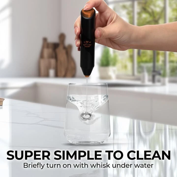 Zulay Powerful Milk Frother Wand - Mini Handheld Black & Copper Product Details Brand: Zulay Kitchen Special Feature: Powerful Motor Color: Black & Copper Material: Stainless Steel Recommended Uses For Product: All Types Model Name: FrothMate Milk Frother Included Components: Stand Not Included Product Care Instructions: Hand Wash Only Style: Mighty Frother Number of Batteries: 2 Number of settings: 2 Power Source: Battery Powered Wattage: 800 watts Manufacturer: Zulay Kitchen Package Dimensions: 9.06 x 1.65 x 1.3 inches Item Weight: 2.89 ounces Country of Origin: China Item model number: FrothMate Milk Frother POWERFUL FROTHING EXPERIENCE: Skip the coffee shop run and enjoy lattes, cappuccinos, matcha, hot chocolate, powdered drinks, or iced coffee at home with this milk frother. With a 13,000 RPM motor and 26 spiral rings, this coffee foam maker turns ordinary milk to frothy perfection in seconds. MATCHA, COFFEE, & MORE: This matcha whisk works better than a manual bamboo whisk for making matcha tea and works just as well for coffee. It is designed to work on all types of milk, such as half and half, soy, almond, oat, cashew, hazelnut, whole milk, low-fat, skim milk, and other dairy items like butter or cream. This also works great as a powder mixer and can even whisk eggs. EASY TO CLEAN AND STORE: This hand frother can be cleaned by placing the whisk under running water and briefly turning it on; wipe the handle with a damp cloth. The compact size of this milk foamer allows it to be stored in kitchen drawers without taking up too much space. SIMPLE TO USE: All it takes is pressing the on/off button to make a cup of frothy latte, mix protein powder, or even whisk up some eggs for a perfect omelet with this electric whisk. Make this drink mixer an addition to your coffee bar, or take it anywhere for a caffeine boost.