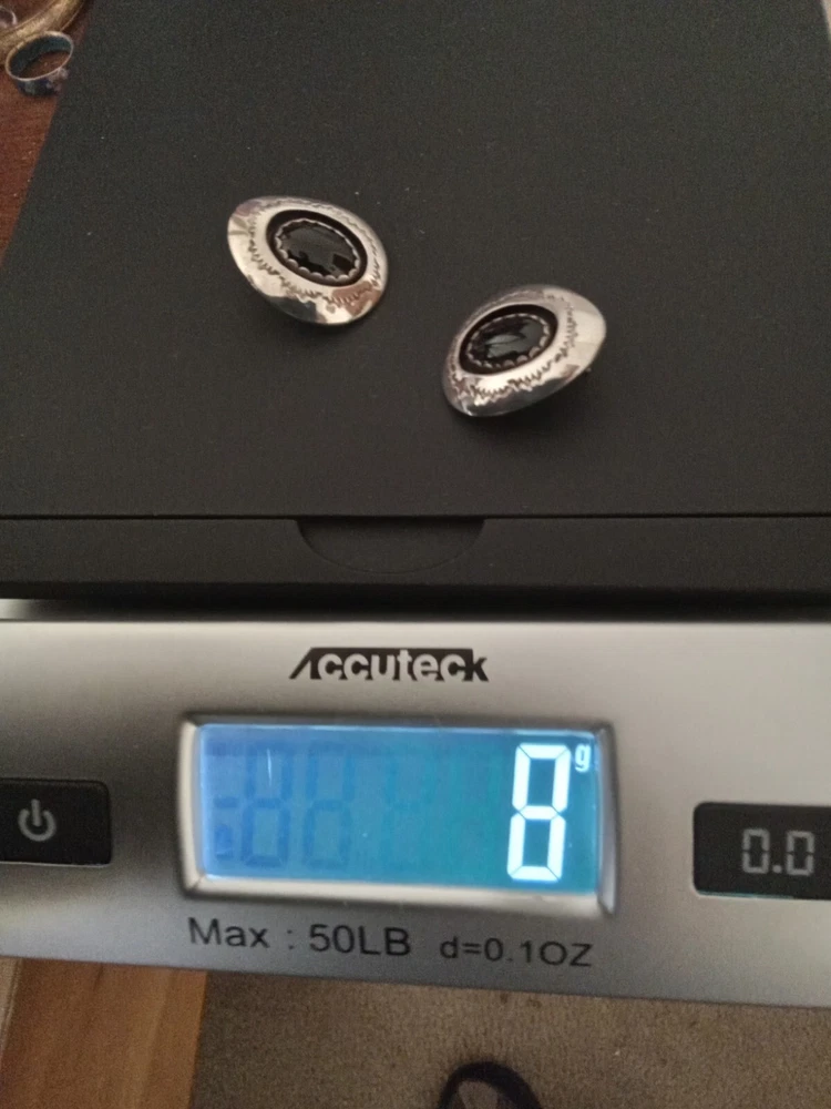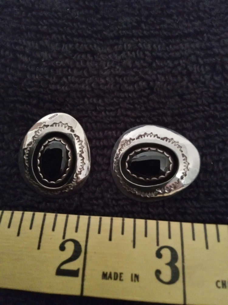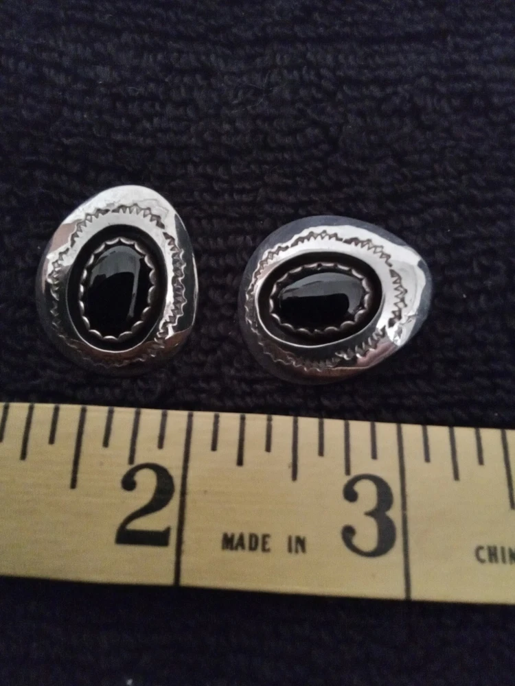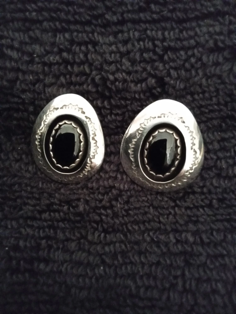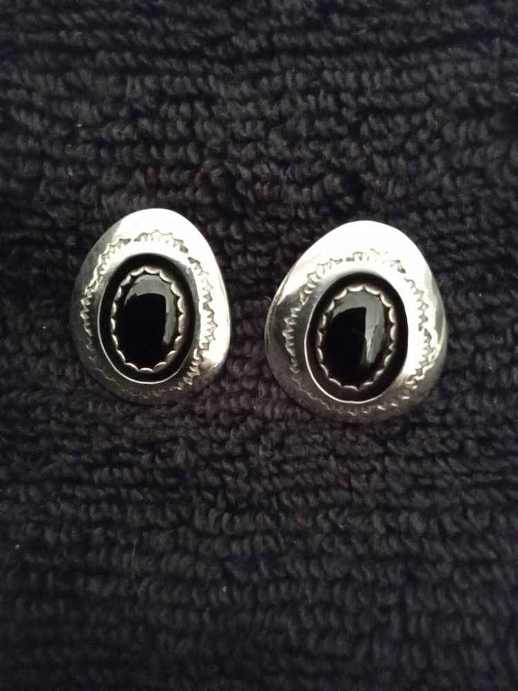 These Zuni Native American earrings feature black onyx stones set in sterling silver. They are earrings for the lobe. The earrings are vintage and signed by the maker. The style is handmade with a bezel setting, showcasing the oval black onyx stones. This authentic Native American jewelry is a stunning addition to any collection.