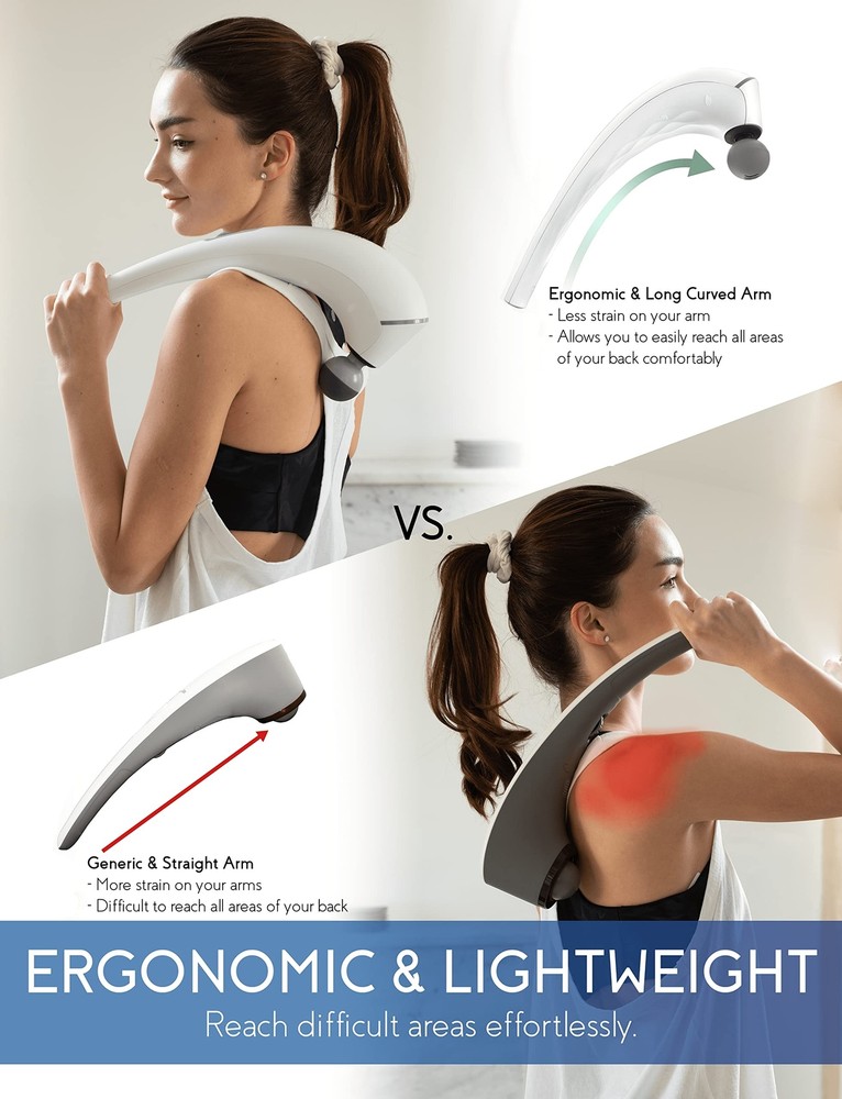 Zyllion Handheld Back and Neck Massager - Cordless Rechargeable Electric Vibrating Deep Tissue Massage with Heat for Athletes, Recovery and Muscle Pain Relief - White (ZMA-27-WT) Product Details Color: White Brand: Zyllion MPN: ZMA-27 UPC: 850001290173 EAN: 0850001290173 Use for: Whole Body Power Source: Battery Powered Material: Silicone Item Weight: 2.2 Pounds Brand: Zyllion Product Dimensions : 8.5 x 1 x 16 inches; 2.2 Pounds Item model number : ZMA-27 Department : unisex-adult Batteries : 1 Lithium Polymer batteries required. (included) Date First Available : November 10, 2020 Manufacturer : Zyllion POWERFUL 5,000 RPM PERCUSSION MOTOR: is the most powerful handheld massager in the market that gets real deep into the muscle tissue to help ease and relax muscle cramps, knots, tensions and strains. This high intensity massager effectively increases blood flow to relieve muscle pain in seconds. ERGONOMIC, CORDLESS AND RECHARGEABLE DESIGN: features a curved shape that allows you to easily reach behind your back and massage hard to reach areas, getting both your upper and lower back. The 2200mah battery capacity last up to 180+ minutes (at full charge). Versatile and powerful enough for any professional athlete and for in-home use, muscle therapy and recovery. INTUITIVE LED INDICATOR AND USER-FRIENDLY SCROLL WHEEL: helps you find the perfect intensity. The led lights changes different colors from blue, green, orange and red (lowest to highest intensity). To turn on, simply scroll up and choose between intensities by scrolling further up or down. No need to press or hold any buttons. SOFT SILICONE HEADS AND BALL ATTACHMENT WITH HEAT: comes with 5 different node attachments specialized for different parts your body. The ball node attachment features a soothing heat function unlike other cordless handheld massagers to help with blood circulation by transferring warmth to the muscles to ease fatigue. LIFETIME CUSTOMER SERVICE SUPPORT: our products are covered by a 1-year warranty (2 years with registration). 100% satisfaction means the world to us and if anything happens to your device within a 1-year period, well send you a replacement at no cost to you. Our mission is to help you unwind and regain balance in your life, which is why we strive to bring the most therapeutic and innovative health and personal care products. Zyllion ZMA-27 Handheld Cordless Rechargeable Percussion Massager From Zyllion, Relaxation Meets Innovation! Unlike other handheld massagers, our advanced and intuitive features include: Powerful 5,000 RPM motor, most powerful in the market.Ergonomic curved shape, easily reach behind your back.Softer silicone head attachments for a more comfortable massage.Ball attachment with heat for better blood flow and circulation.LED intensity indicator to easily switch between low and high intensity levels. 5 Interchangeable Massage Nodes Each massage head is easy to remove and install: Round "Ball" Head - General point massage.1-Point Head - Focused trigger acu- point massage.2-Point "Fork" Head - Double trigger acu-point massage.6-Intensive Head - Large area soft contact massage.Curved Head - Focused arm and leg massage. Rechargeable 2200mAh Battery Capacity Recharges to full in only 2 hours, allowing you to use the massager for up to 180+ minutes. 4 white LED lights = Full, 1 White LED = Low. Ball Attachment with Heat Function The heating function only works if the ball massage head is attached. After turning on the massager, press the heating button to start heating, and press again to stop heating. Versatile, Lightweight & Portable Weighs 2.2 lbs.Used to massage all body parts from back, neck, shoulders, arms, legs, thighs, foot and more.Includes a travel bag to store the handheld massager and attachments and carry everywhere you go. What’s in the Box: 1x ZMA-27 Massager5x Massage Heads1x Travel Bag1x Charging Cord1x User Manual With thousands of satisfied users and counting, thanks a Zyllion!