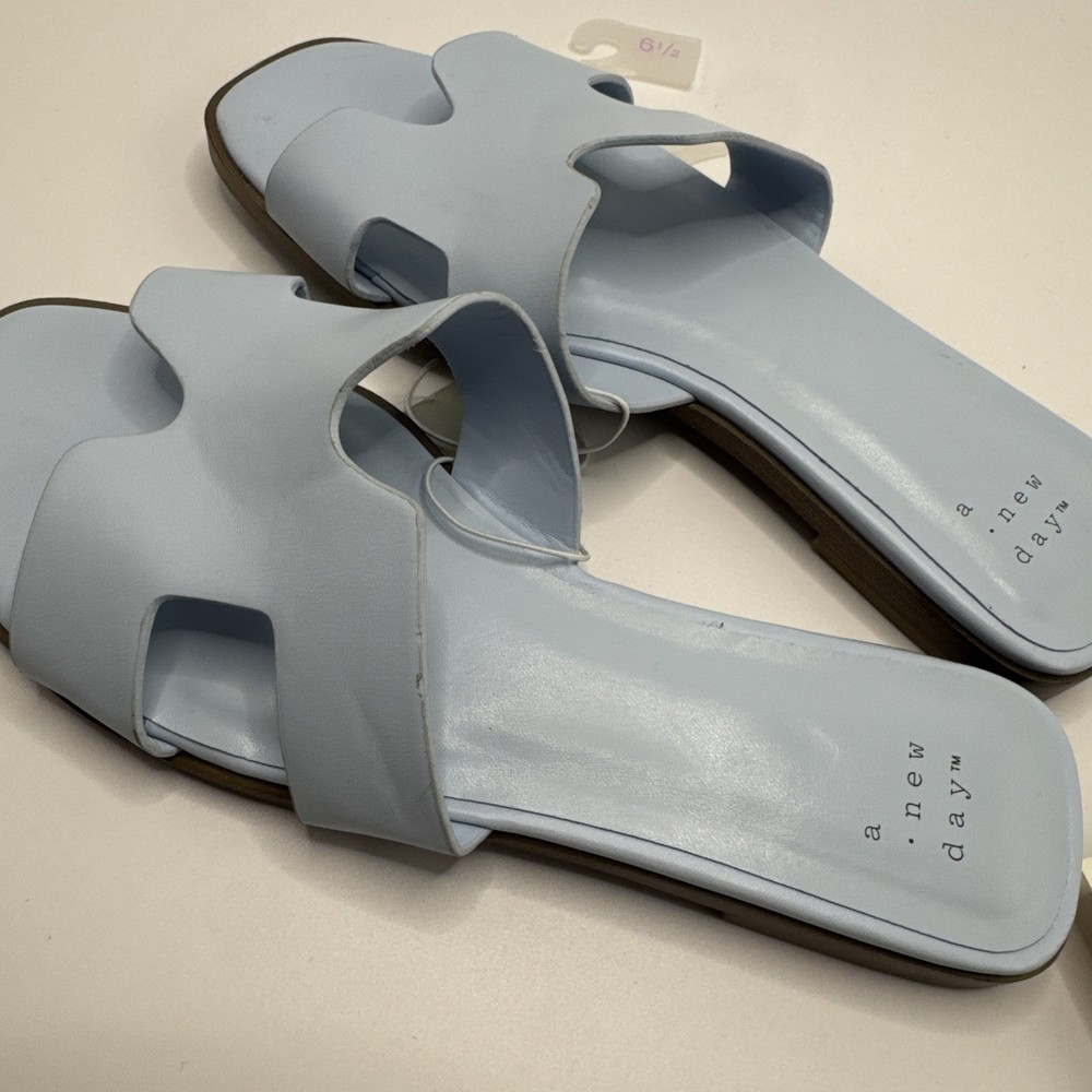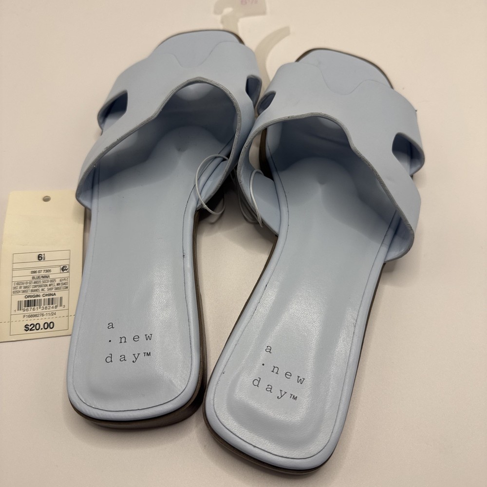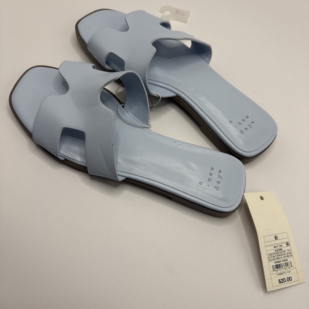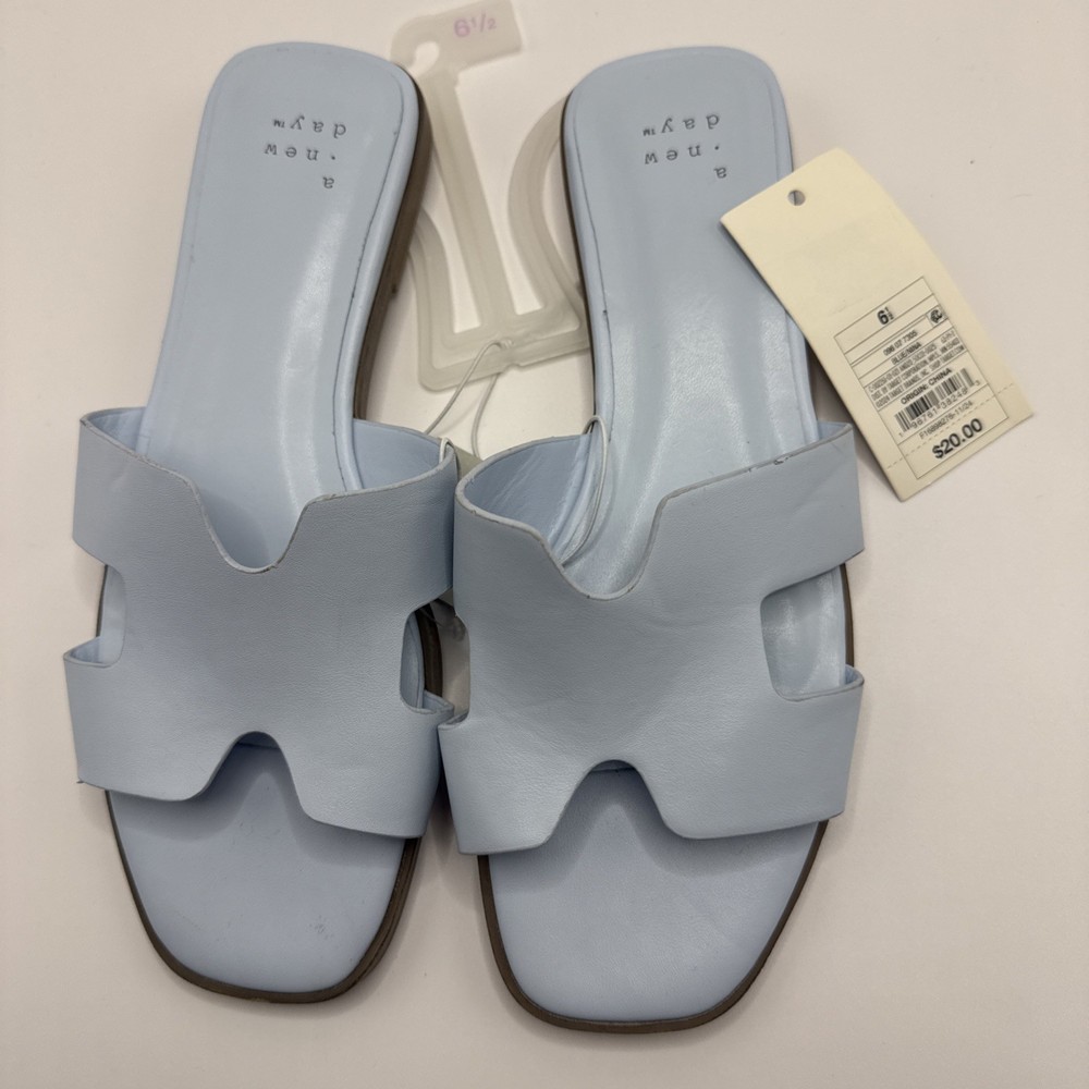 The product is a pair of A New Day women's flat shoes in a size 6.5. The shoes are blue in color with a synthetic upper material. The style is a basic flat, suitable for everyday wear. With a comfortable design and stylish look, these shoes are perfect for women looking for a versatile and practical footwear option. A2T4 0387