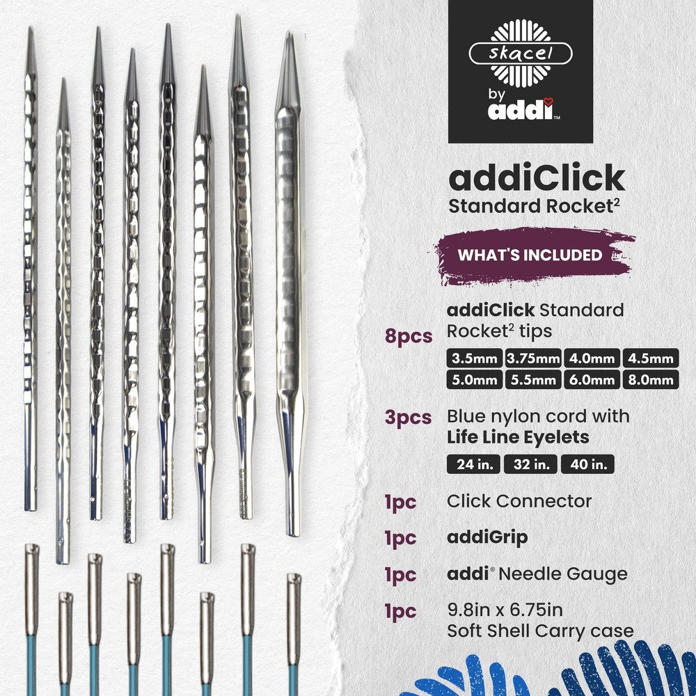 Seamlessly combining convenience and precision, the addiClick Standard Rocket2 (Squared) Interchangeable Knitting Needles Set is perfect for a variety of knitting projects for both beginners and seasoned knitters! Whether crafting cozy sweaters, socks, blankets, or intricate lace patterns, our circular knitting needles for adults are designed to offer smooth transitions and a comfortable grip, enhancing your overall knitting experience. Our single point needles provide a collection of interchangeable needle tips in different sizes, allowing you to construct a wide range of circular needles of varying length and thickness, so that you will always have the right size and length when you need it. The pliable nylon cords ensure your knitting flow remains uninterrrupted. Our addiClick tips require no tools to change; simply insert the cord deep into the tip, twist and release! Our addiClick knitting kits include8 sizes of mixed addiClick Standard Rocket2 (Squared) Tips (approx. US 4, 5, 6, 7, 8, 9, 10 and 11), 3 Pliable Blue Nylon Cords ( 24, 32, and 40 Inch), 1 Click Connector which helps to either store stitches or combine cords, and 1 addiGrip to make changing tips even easier. These knitting sticks are constructed with durable plated brass and ergonomic patented slightly rounded standard square tips, providing long-lasting reliability and reducing hand fatigue while knitting for long periods of time. Our yarn needles fit snugly in a convenient color-coded soft organizer case to provide storage for your knitting supplies while you travel. Explore your creativity and expand your knitting skills with confidence and efficiency with the addiClick Interchangeable Circular Knitting Needle Set! KNITTING NEEDLES KIT: Transform your knitting projects and enhance your creativity with the skacel addiClick Interchangeable Knitting Needles Set! Our knitting sets feature a collection of different size interchangeable needle tips, and pliable nylon cords which ensure your knitting flow remains uninterrrupted; addiClick tips require no tools to change; simply insert the cord deep into the tip, twist and release WHAT IS INCLUDED: The addiClick knitting kit includes 8 sizes of mixed addiClick Standard Rocket2 (Squared) Tips (approx. US 4, 5, 6, 7, 8, 9, 10 and 11), 3 Pliable Blue Nylon Cords ( 24, 32, and 40 Inch), 1 Click Connector which helps to either store stitches or combine cords, and 1 addiGrip to make changing tips even easier EASILY INTERCHANGEABLE: Our knitting needles provide a collection of needle tips in different sizes which are easily interchangeable, allowing the knitter to construct a wide range of circular needles of varying length and thickness; if your gauge calls for a needle one size larger or smaller than you anticipated, you just switch needle tips and you are ready to knit, which means you will always have the right size and length when you need it GREAT FOR ON-THE-GO KNITTING: Our knit needles and accessories fit snugly in a convenient color-coded soft carry case which can be easily packed in a purse, backpack, or suitcase, allowing you to easily take your knitting supplies with you for travel SUPERIOR CRAFTMANSHIP: Our circle knitting needles are constructed with durable plated brass and ergonomic patented square tips, ensuring long-lasting reliability and allowing for hours of knitting without discomfort
