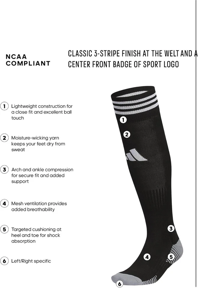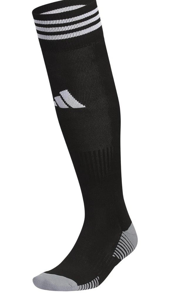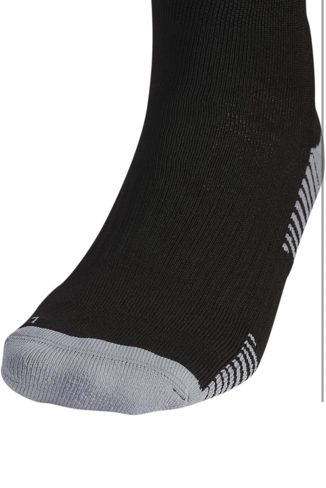 About this item • Moisture-wicking yarn keeps your feet dry from sweat • Classic 3-Stripe finish at the welt and a center front Badge of Sport logo • Targeted cushioning at heel and toe for shock absorption • Arch and ankle compression for secure fit and added support • Lightweight construction for a close fit and excellent ball touch • Mesh ventilation provides added breathability Description Before you head out on the pitch, pull on these adidas soccer socks. The 3-Stripes are the last thing the competition will see just before you score. Airy mesh in key areas, moisture-wicking yarn and the over-the-calf length keep you ready for action.