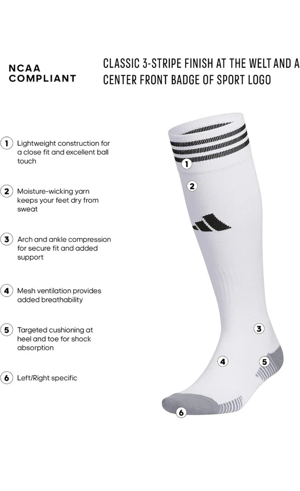 About this item • Moisture-wicking yarn keeps your feet dry from sweat • Classic 3-Stripe finish at the welt and a center front Badge of Sport logo • Targeted cushioning at heel and toe for shock absorption • Arch and ankle compression for secure fit and added support • Lightweight construction for a close fit and excellent ball touch • Mesh ventilation provides added breathability Description Before you head out on the pitch, pull on these adidas soccer socks. The 3-Stripes are the last thing the competition will see just before you score. Airy mesh in key areas, moisture-wicking yarn and the over-the-calf length keep you ready for action.