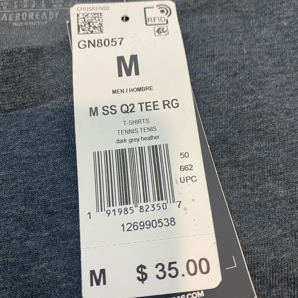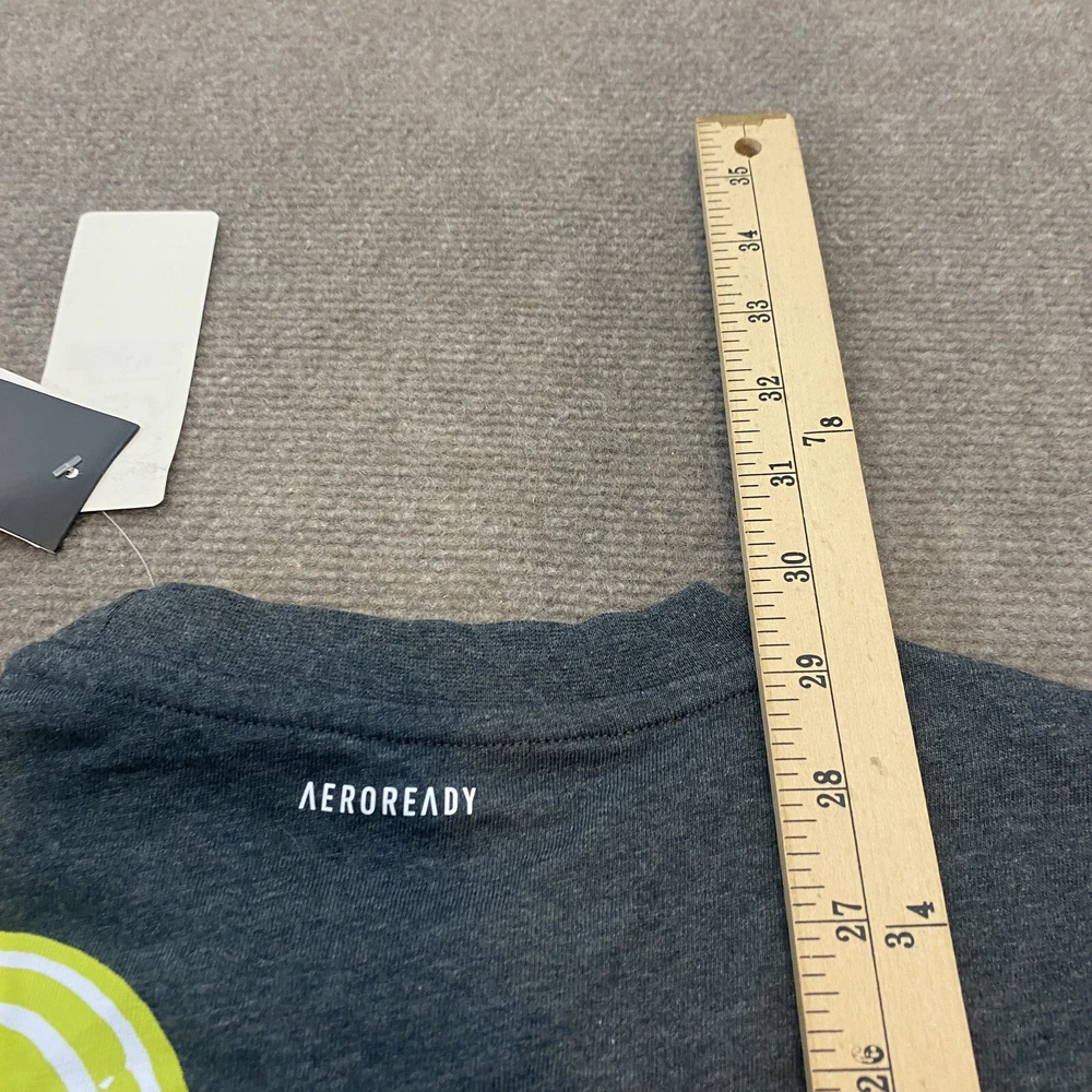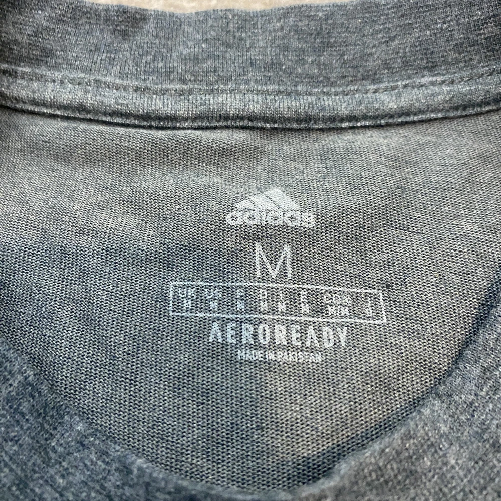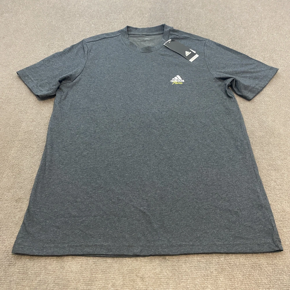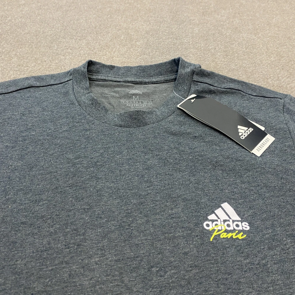 Neckline: Crew Neck Sleeve Length: Short Sleeve Vintage: No Color: Gray Size Type: Regular Accents: Logo Product Line: adidas Performance Tee Department: Men Pattern: Solid Fit: Regular Material: Cotton Blend Size: M Features: Breathable, Collarless, Contrasting Trim Type: T-Shirt Theme: Paris Brand: adidas