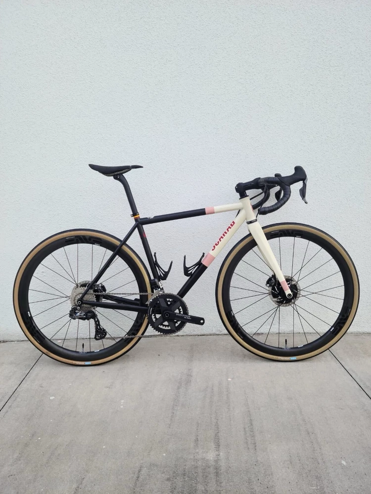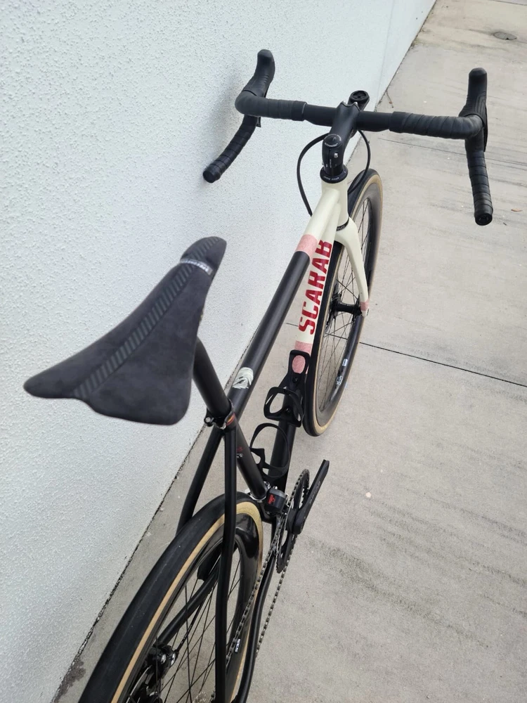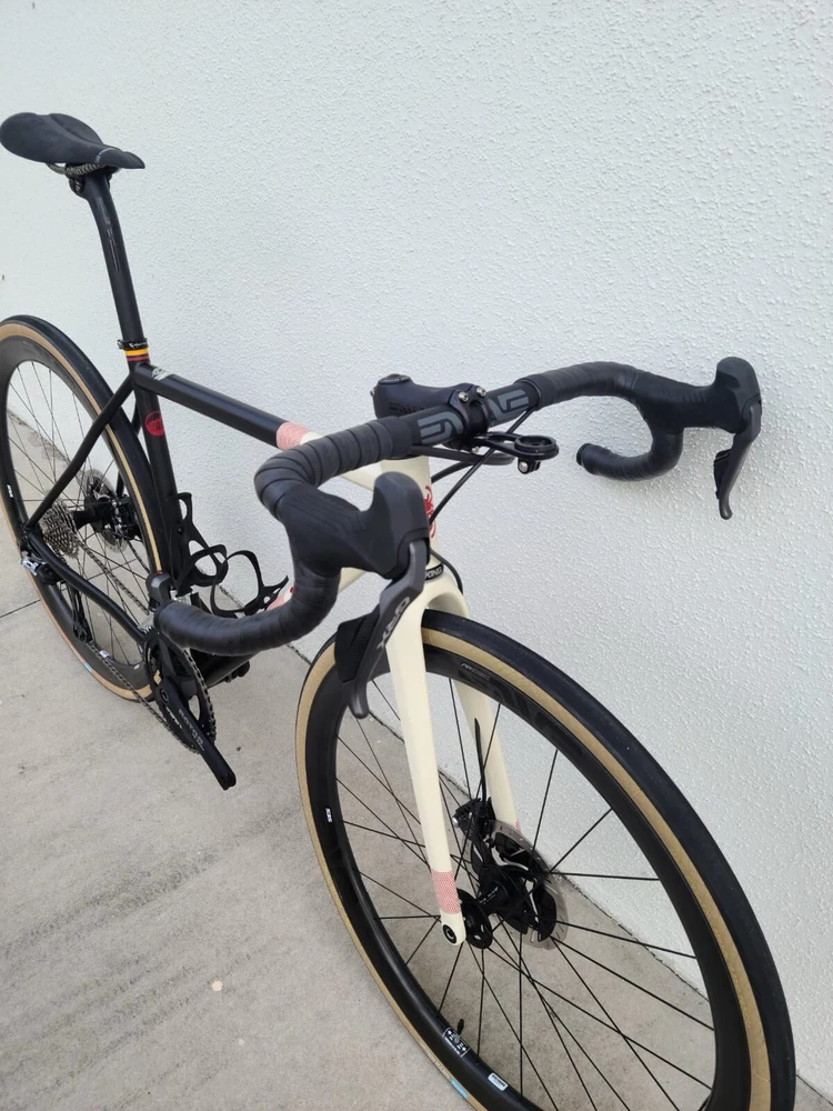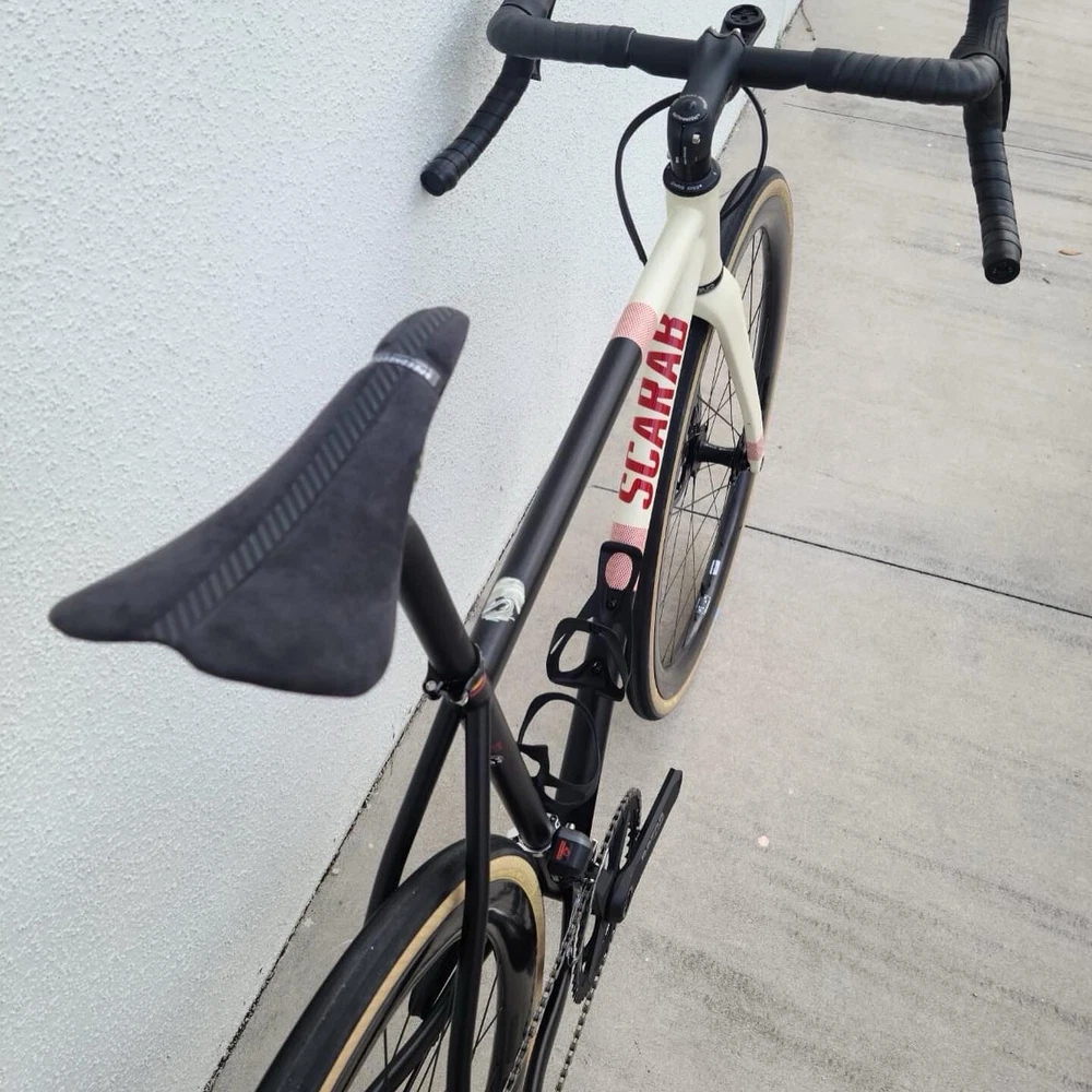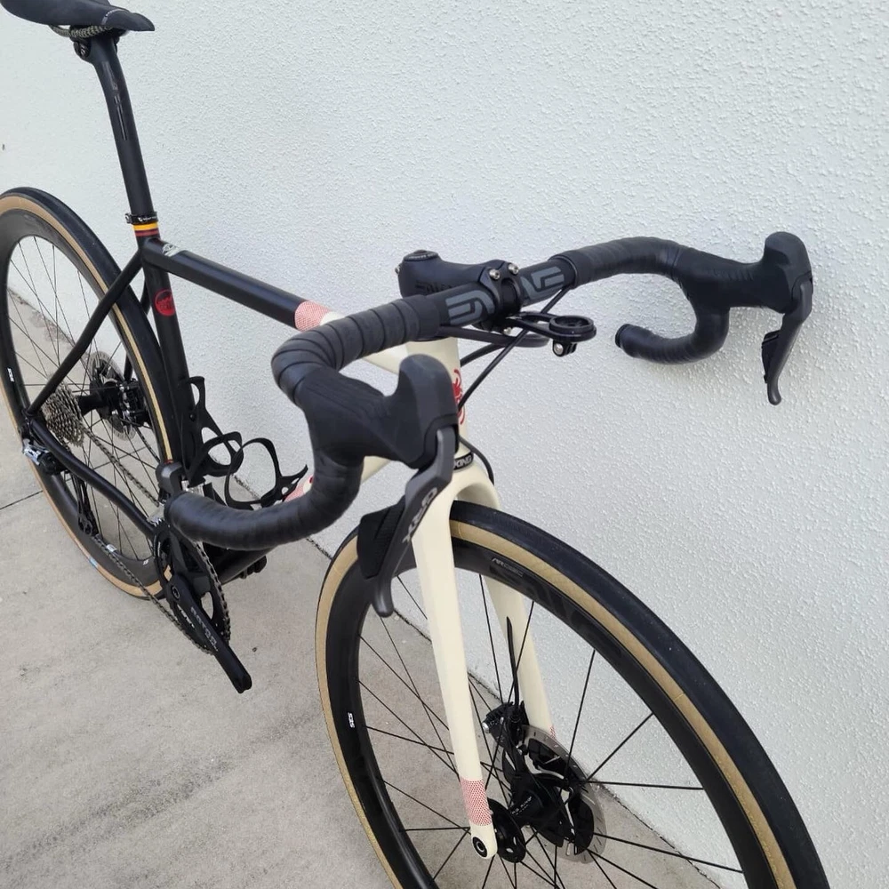 Scarab size 52 Custom bike Columbus steel Frameset Santa Rosa All-road Groupset Shimano di2 x2 GRX Rotor Aldhu Cranks 2x no power meter 170mm cranks Wheelset ENVE SES AR 3.4 (chris king hubs) Tires Enve ses 29 Cockpit ENVE Cockpit Gravel Handlebar 42cm. Pedals Garmin PM Saddle Sworks 3D printed. https://youtu.be/KEjsBLl0Rb0?si=Wb1hYHkx4UFLUteA