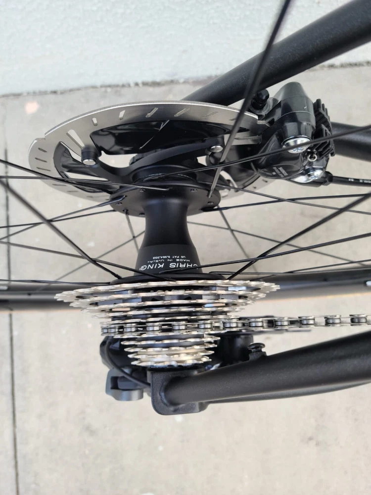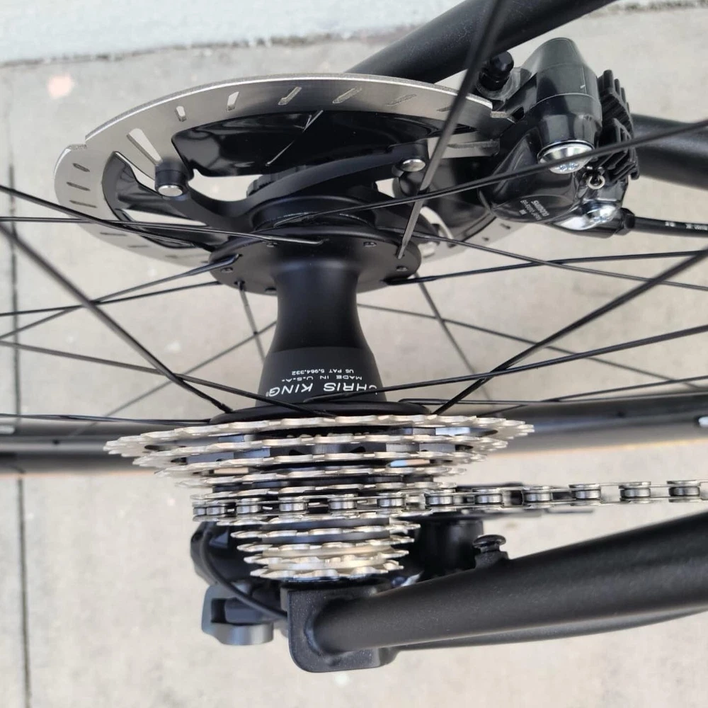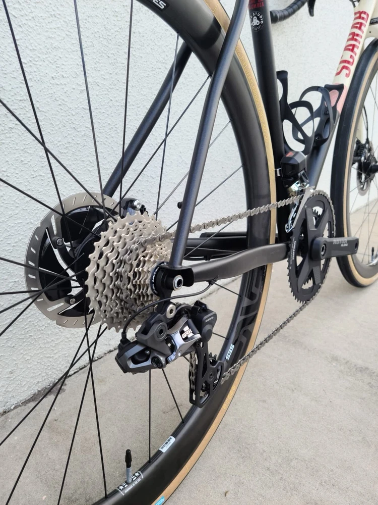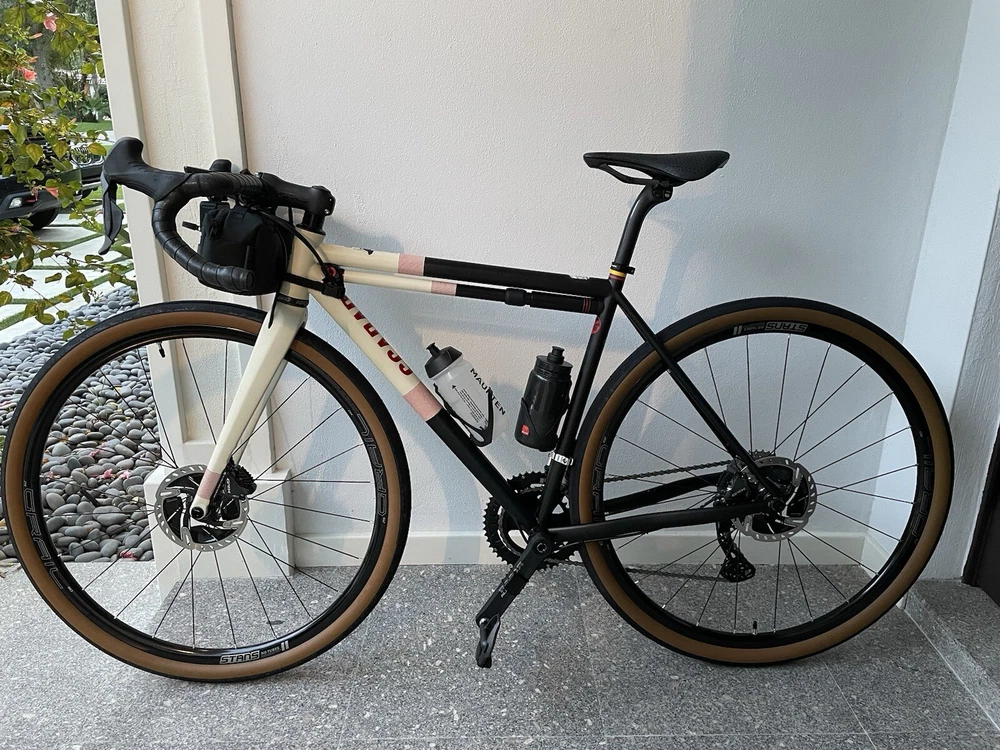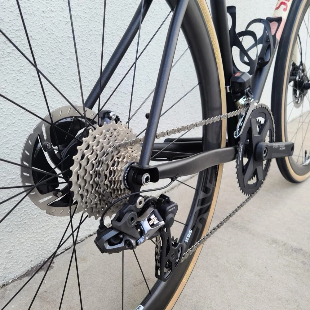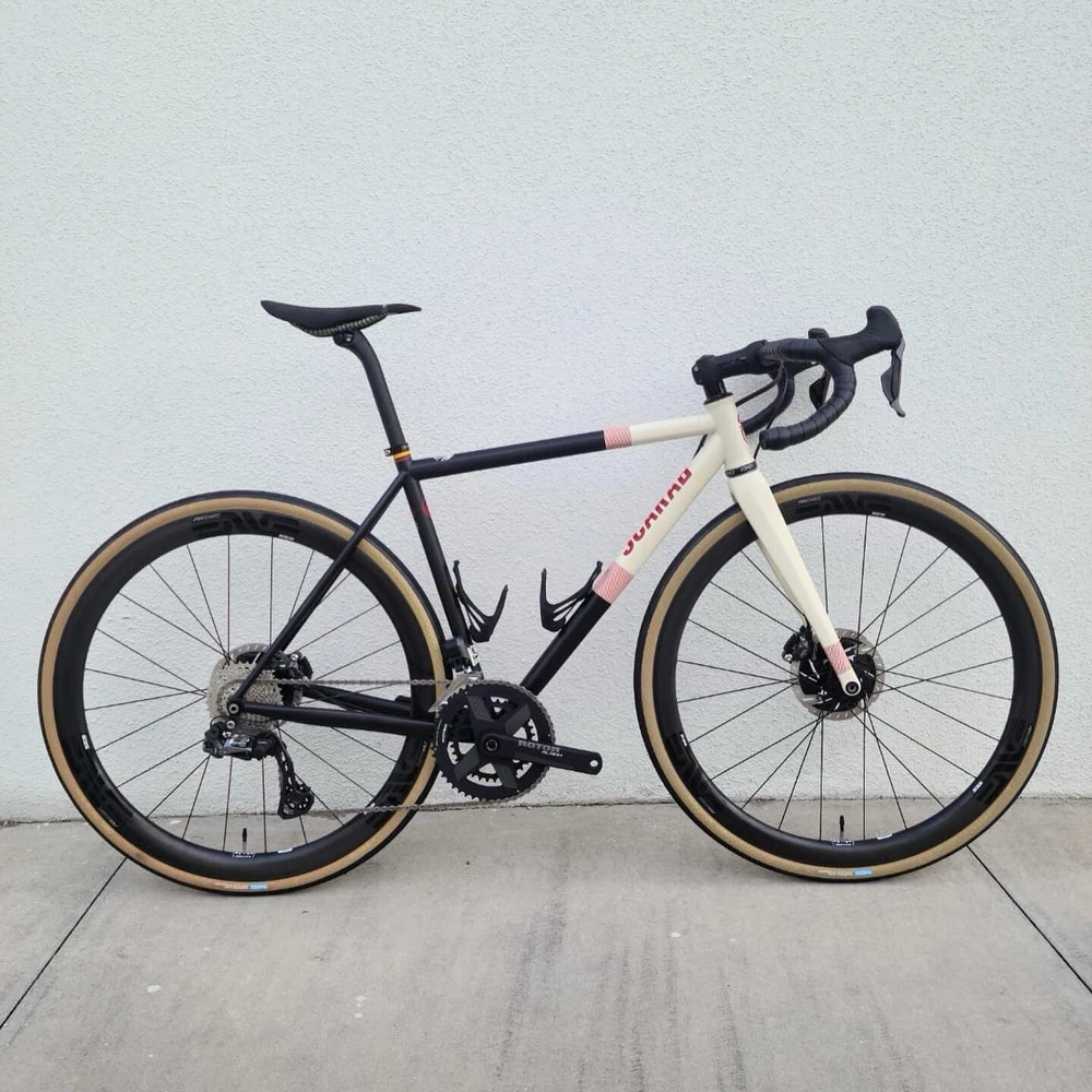 Scarab size 52 Custom bike Columbus steel Frameset Santa Rosa All-road Groupset Shimano di2 x2 GRX Rotor Aldhu Cranks 2x no power meter 170mm cranks Wheelset ENVE SES AR 3.4 (chris king hubs) Tires Enve ses 29 Cockpit ENVE Cockpit Gravel Handlebar 42cm. Pedals Garmin PM Saddle Sworks 3D printed. https://youtu.be/KEjsBLl0Rb0?si=Wb1hYHkx4UFLUteA