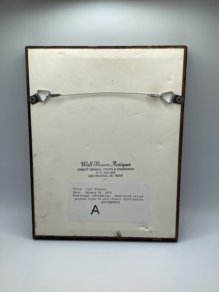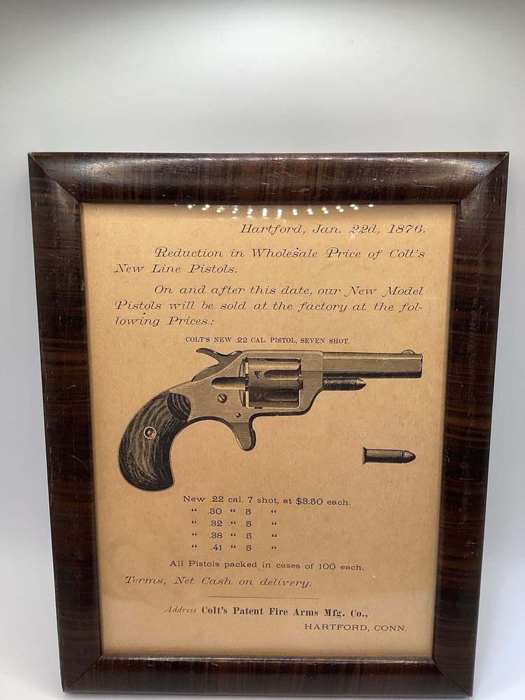 This product is an antique 1876 Colt's New .22 Cal 7 shot Pistol advertisement, featuring a wood block relief printed flyer to Colt pistol distributors. Originally made in the United States. It serves as a collectible advertising piece for Colt firearms enthusiasts and collectors, showcasing the historical significance of the 100th anniversary of Colt's manufacturing. Frame end to frame end measurements are 7 and 3/8th by 9 and 3/8th on the dot This piece states on the Front " Hartford, Jan. 22d; 1876 Reduction in wholesale price of colts new line pistols on and after this date, our new model pistols will be sold at the factory at the fol-lowing prices: Colts new .22 cal pistol, seven shot new .22 cal 7 shot, at $3.50 each All pistols packed in cases of 100 each Terms, Net cash on Delivery Address colts patent fire arms mfg. co., Hartford, Conn. The back of the Framed piece states Wall flowers antiques quality original prints and engravings p.o. box 420 Lost molinos, Ca 96055 Title: Colt Pistols Date: January 22, 1876 Additional information: Wood Block relief printed flyer to colt pistol distributors If you have any questions please shoot me a message i will respond quickly thank you for looking and have a great one!