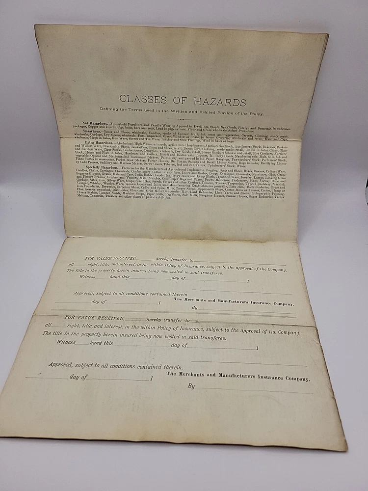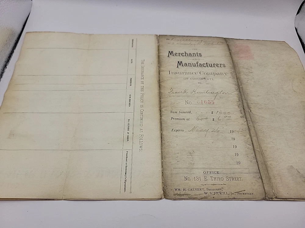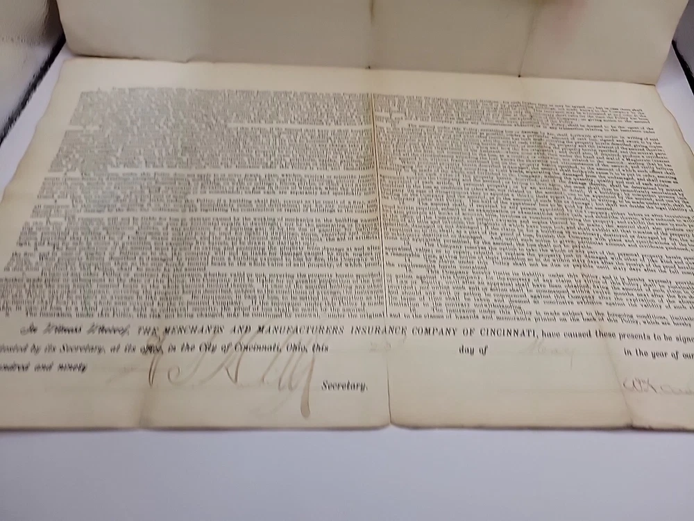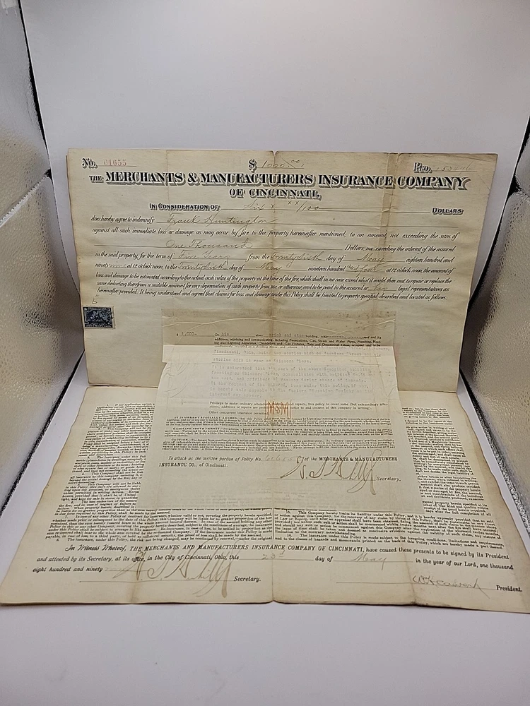Delve into the past with this authentic antique 1899 Merchants Manufacturers Insurance Cincinnati Certificate, a remarkable piece of history from the United States. This document, signed by Blu, is a testament to the era's business practices and offers a unique glimpse into the financial negotiations of the late 19th century. Collectors and enthusiasts of historical memorabilia will appreciate the untouched, original state of this certificate, which has been preserved since its creation. It serves not just as a collectible, but also as a conversation starter and a window into the craftsmanship and commerce of the period.