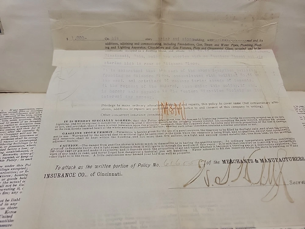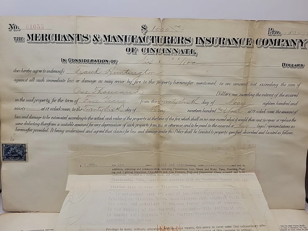 antique 1899 Merchants Manufacturers Insurance Cincinnati Certificate Signed Blu
