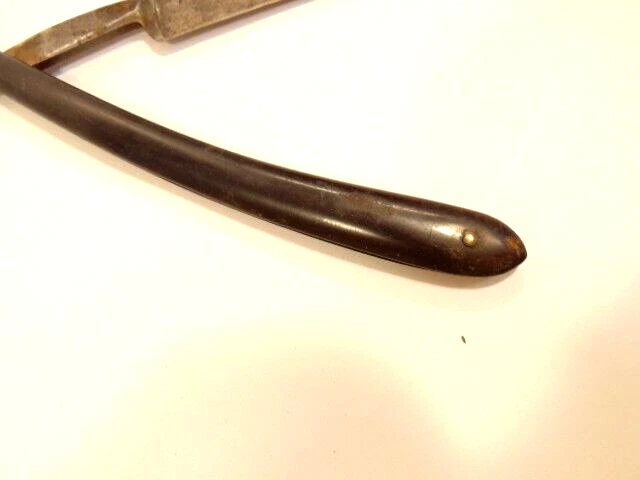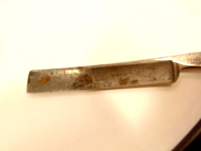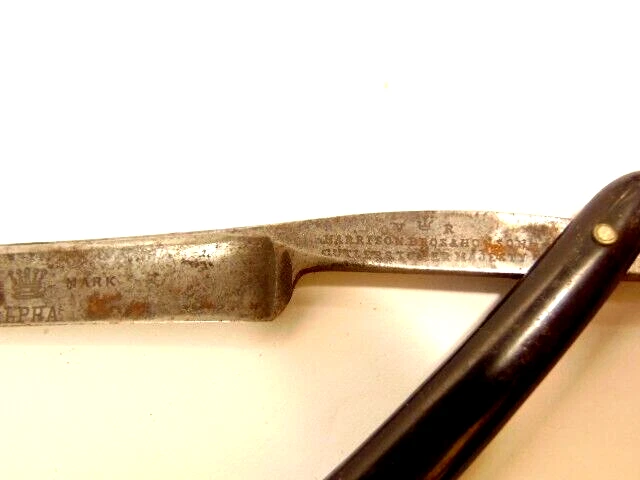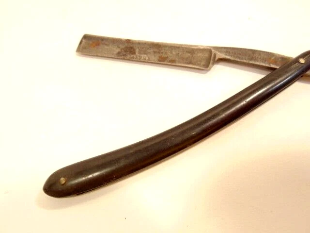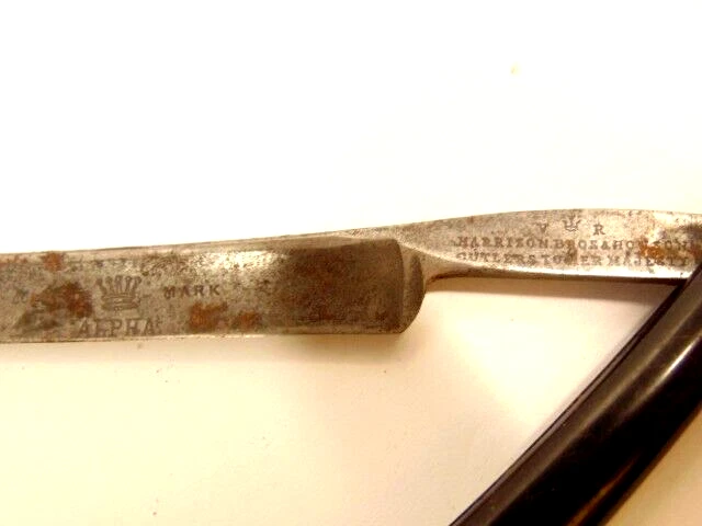 Here is an antique Harrison Bros. & Howson straight razor marked Alpha with a crown emblem on the side of the blade and Cutler to Her Majesty & crown near the rivet. The razor measures about 6 inches long. The blade s small and measures only about 5 1/4 inches long and just 1/2 inches wide. It shows some spots of corrosion, tarnish, dirt and wear from use. Please see the pictures and ask any questions. Thank you for looking. (Inv A24,402)