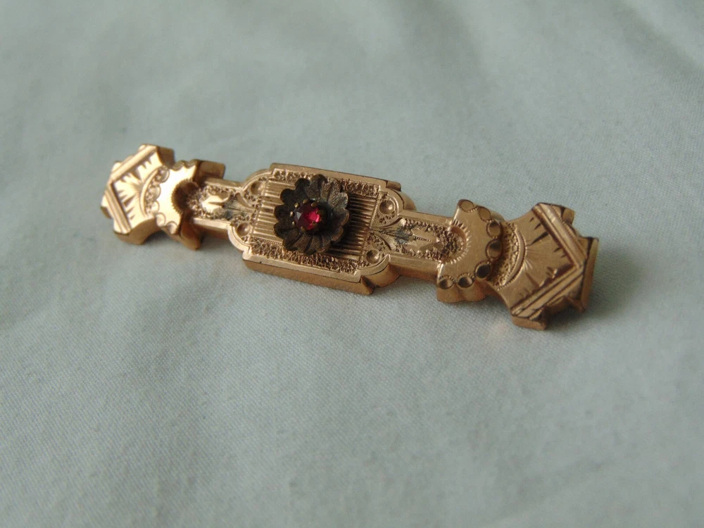 measures 2-1/3 inches across. very ornate Etruscan Revival design and style. genuine Garnet mounted in center of brooch. very collectible.