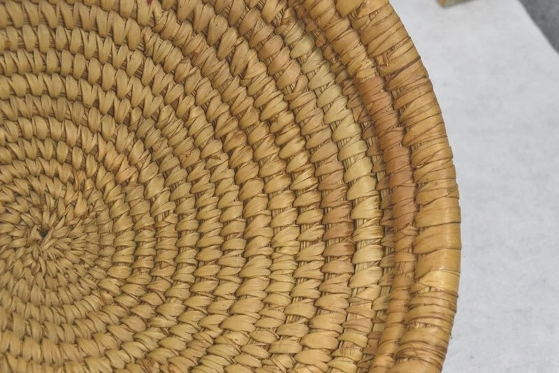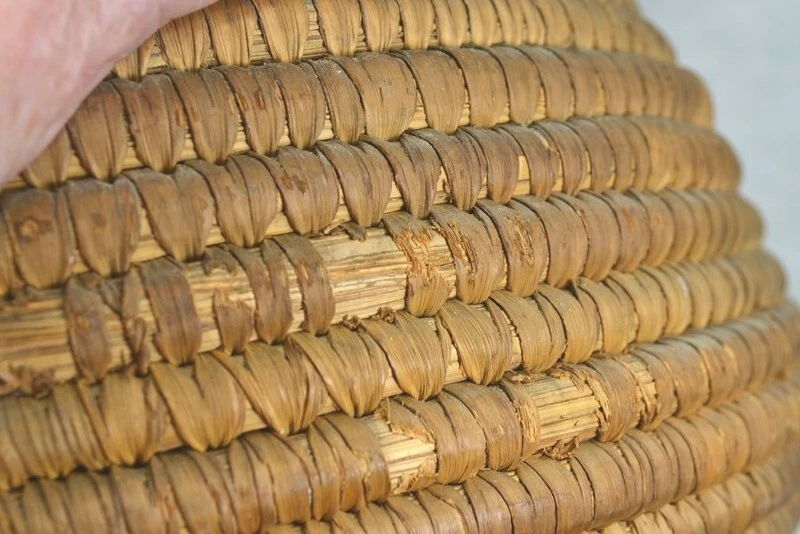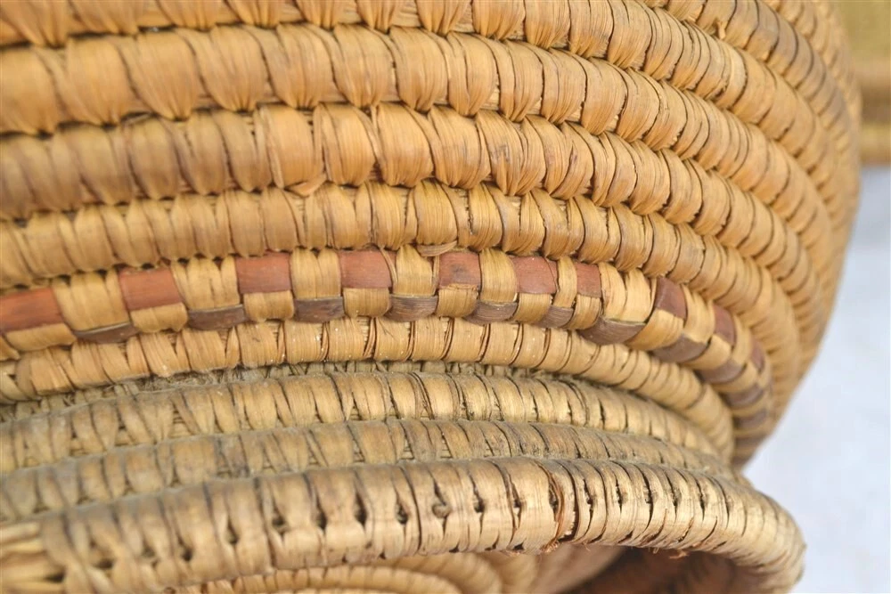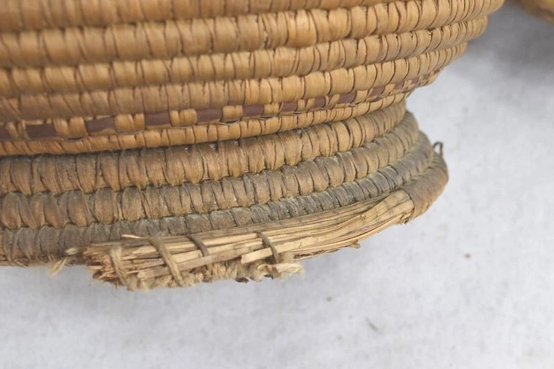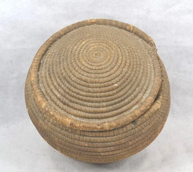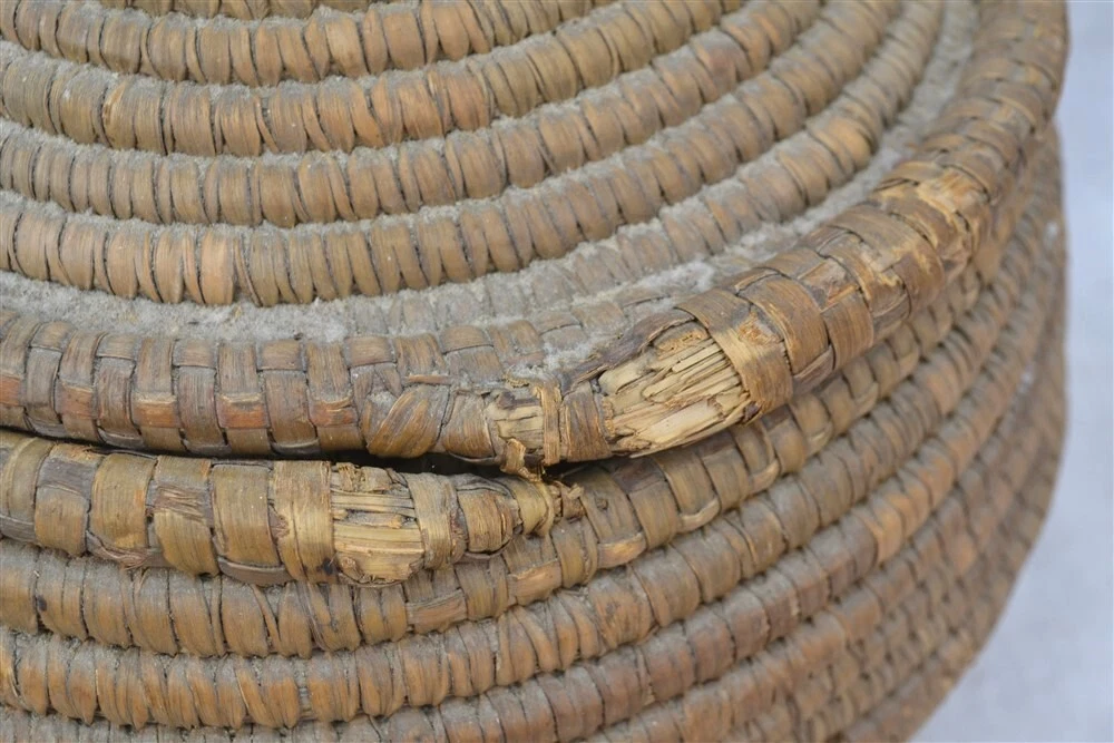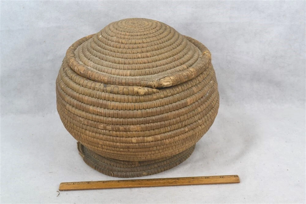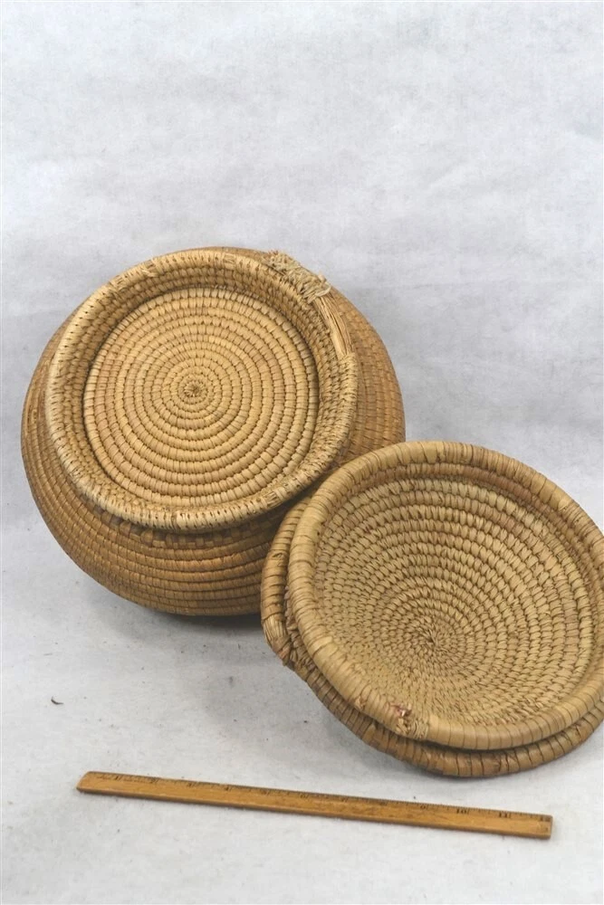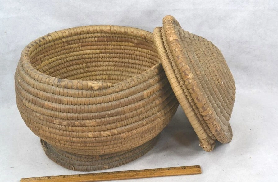 antique early coil basket w/lid Southeast Native American 11.5 across original antique early coil Southeast Native American basket with fitted lid 1. good condition not perfect 2. excellent color 3. dark on the outside from being exposed and used, lite on the inside of the bowl and inside of the lid where not exposed 4. coils are wrapped around many pieces of wide grass, could be rye grass 5. these were made to be water tight, I have not tested this 6. they were also made to hold hot rocks, again I have not tested this 7. very solid and sturdy 8. this has an aroma inside, someone stored something aromatic in it 9. lid fits well, see the flange to hold it in place 10. I have shown the ending ends of the top and top of bowl, see photo 11. ending coil on the bottom has come undone, see photo, this could be fixed, but is does allow you to view the grasses 12. basket is very strong and you can tell by the color that it has age approximate measurements 1. top without the lid on 11.5 in. 2. around the middle 37 in. 3. height to top with lid on 10 in. 4. height to top without the lid 8 in. 5. coils about 3/8 in. across ground advantage or priority shipping and handling in US scroll down for larger photos You may be interested in our other eBay listings . I send a note at the end of the sale with payment information. Payment is expected within 2 days. We ship promptly within 1 day on receipt of payment. All US packages have tracking and are insured. International Buyers We ship international with United States Postal Services. USPS First Class postage and Flat Rate Priority Boxes or Envelopes can now be tracked to some countries . International packages over $100 ship priority or express. Contact us for more information. Import duties, taxes and charges are not included in the item price or shipping charges. These charges are the buyer’s responsibility. Please check with your country’s customs office to determine what these additional costs will be prior to bidding/buying.” . Powered by SixBit's eCommerce Solution