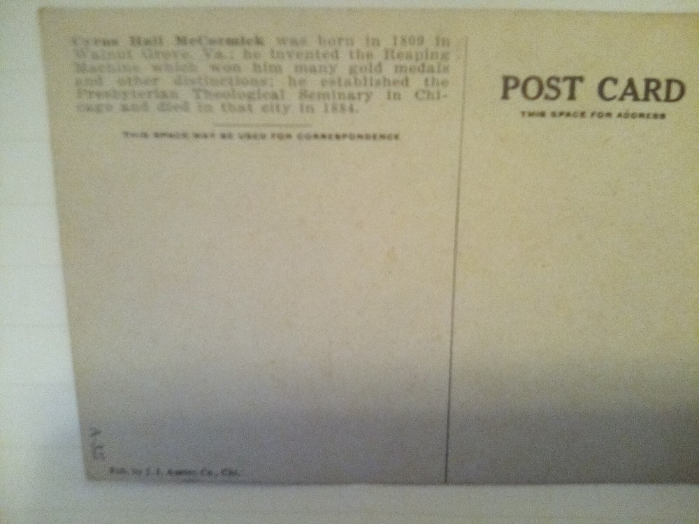 Delve into the history of Walnut Grove with this antique postcard featuring the renowned Cyrus McCormick, an iconic figure celebrated for his contributions. This original lithograph print captures the essence of the famous inventor and is a tribute to his impact, rendered from the distinguished city of Virginia. Proudly manufactured in the United States, this piece of memorabilia is a must-have for enthusiasts of historical Presbyterian Theological Colleges and notable figures. It's a pristine piece, unposted, ensuring its authenticity and making it a valuable addition to any collection of Americana.