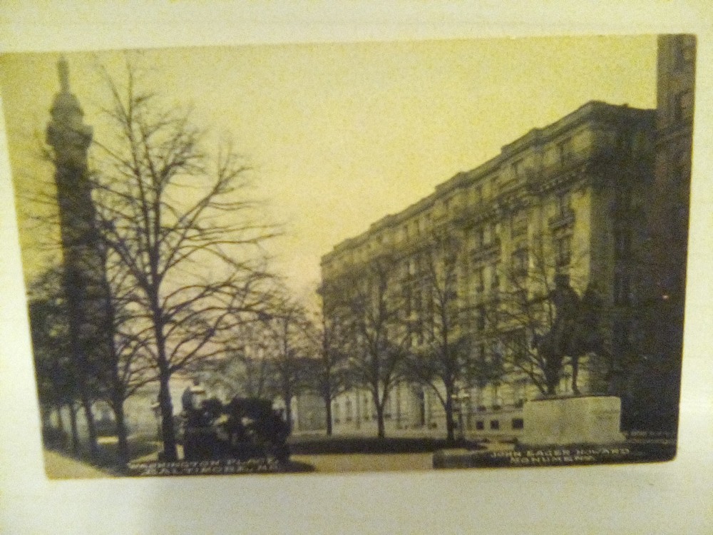 The antique postcard depicts the John Eager Howard Monument at Washington Place in Baltimore, Maryland. This original printed lithograph postcard captures a historical monument in a city theme, highlighting architectural features and landmarks. The postcard is from the Divided Back era (1907-1915) and showcases a standard size of 5.5 x 3.5 inches, typical of postcards from the early 20th century. It is a single unit collectible made of paper, with a white border and posted in the United States.