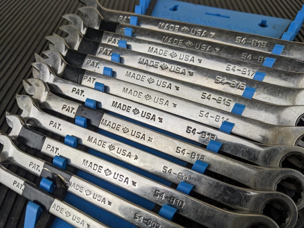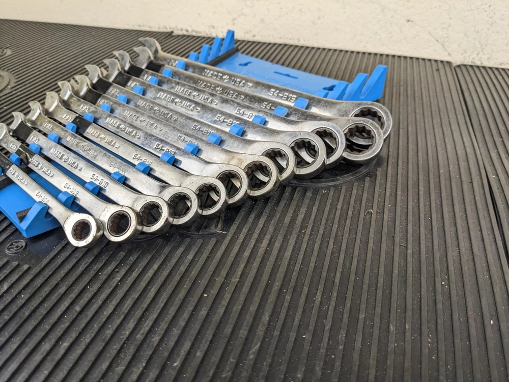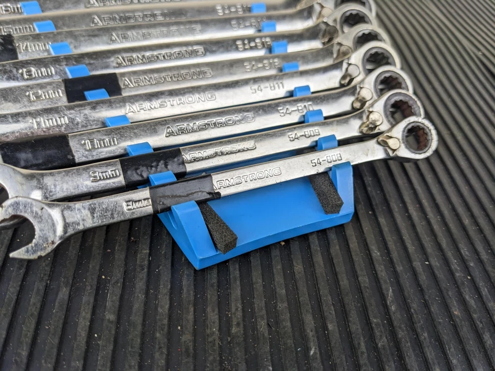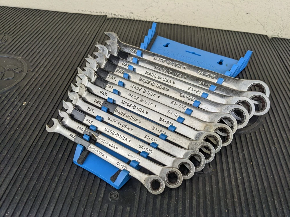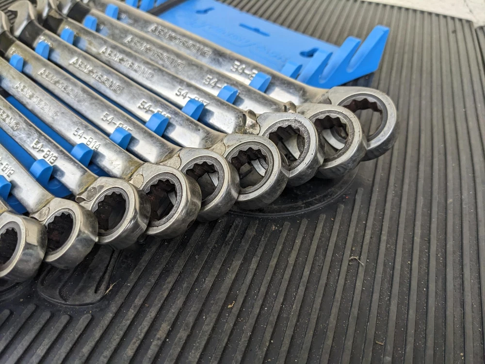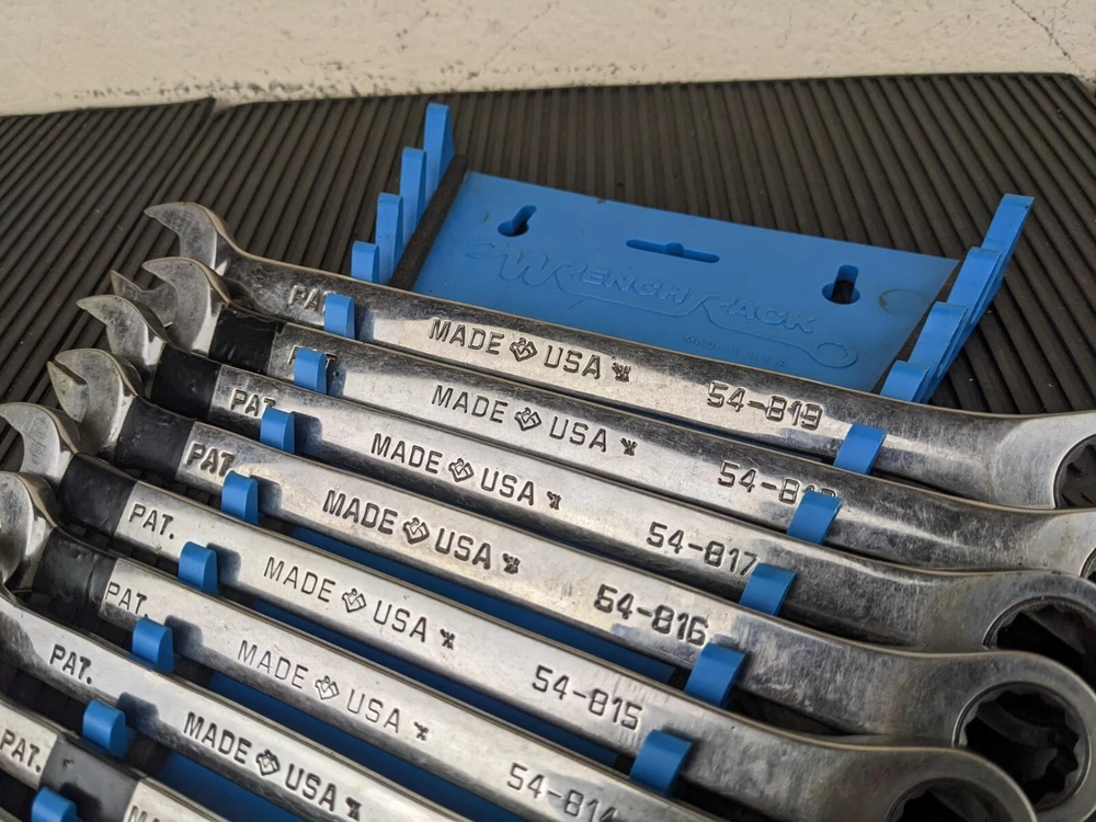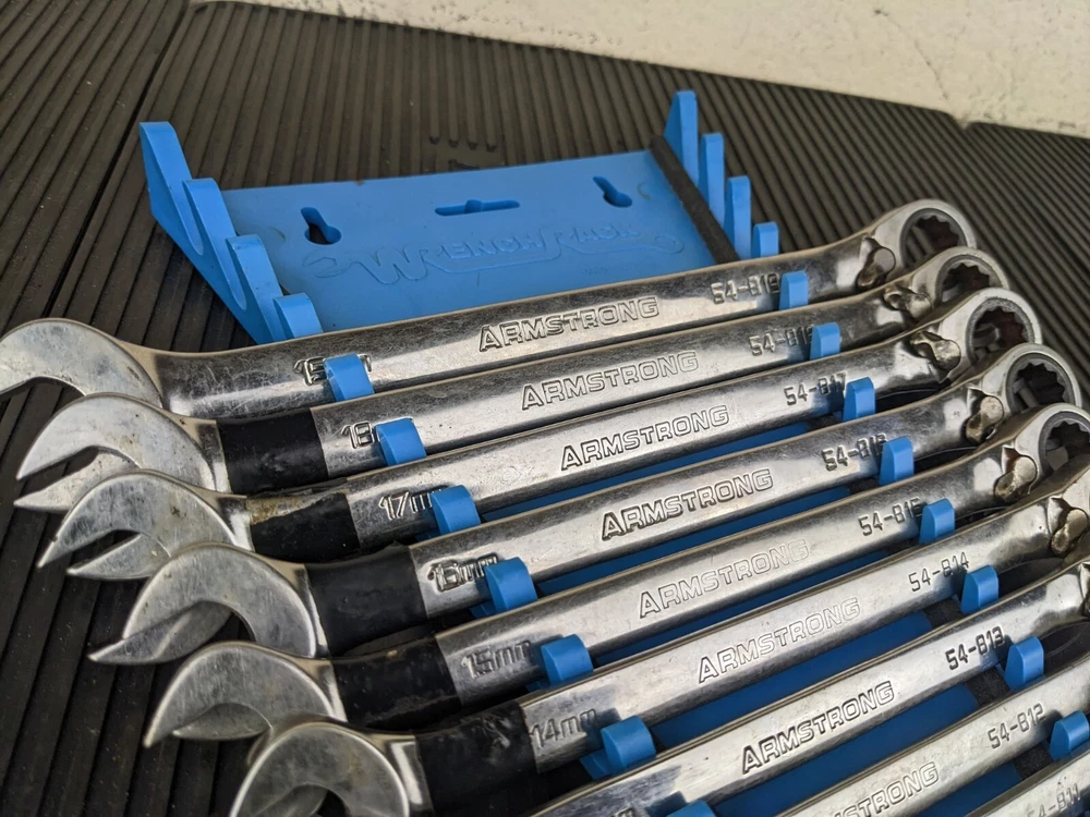 Armstrong Tools USA 12pc Metric Ratcheting Combination Wrench Set 8-19mm Blue wrench rack not included. PLEASE NOTE: This set is a little rough, the 8mm 9mm and 15mm are not ratcheting properly. Additionally, the 10mm and 14mm are difficult to switch between forward and reverse.