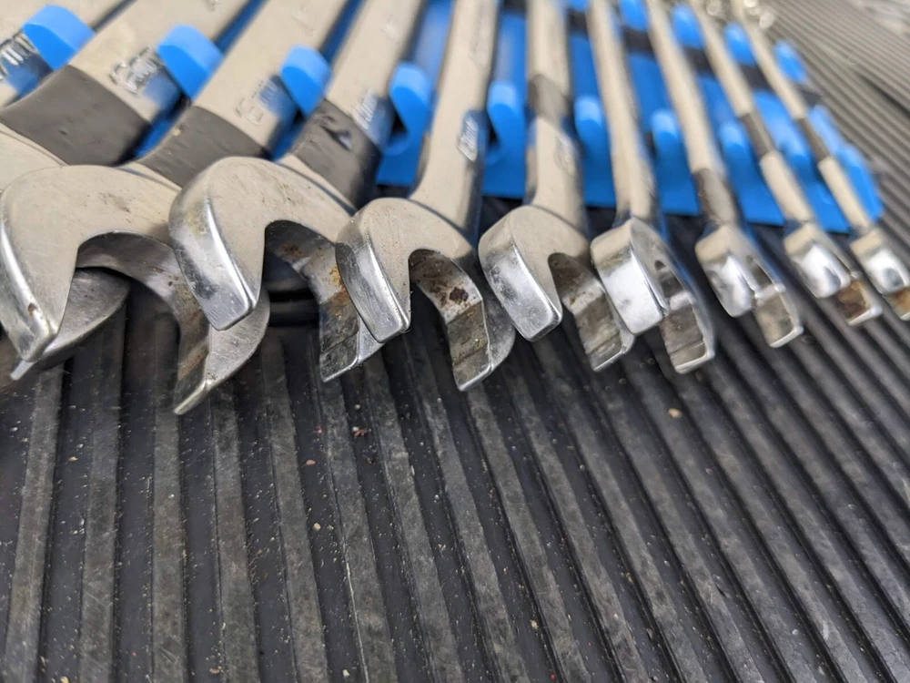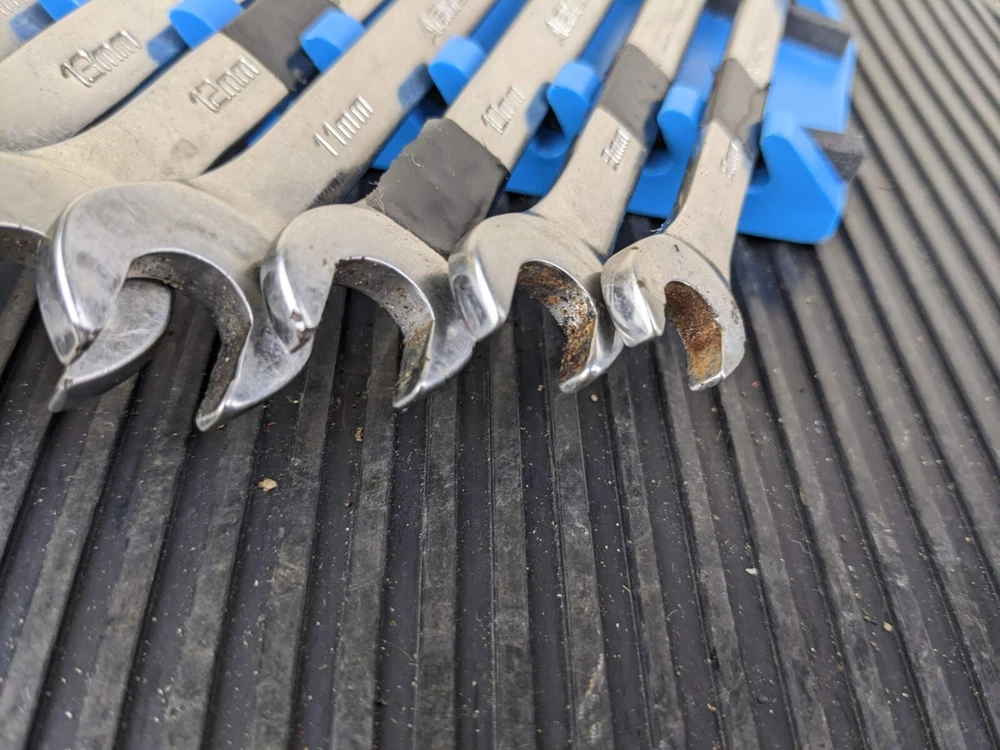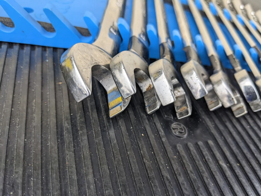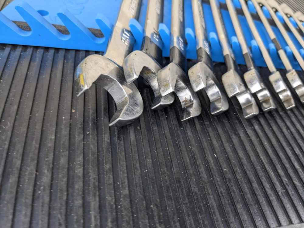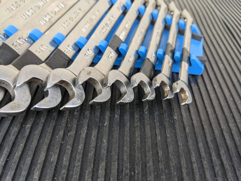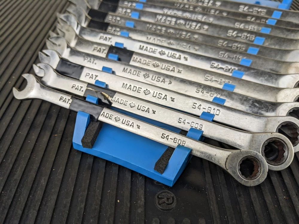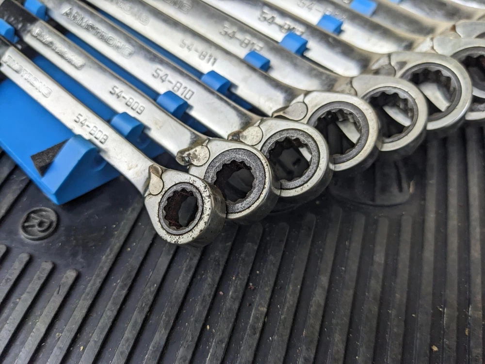 Armstrong Tools USA 12pc Metric Ratcheting Combination Wrench Set 8-19mm Blue wrench rack not included. PLEASE NOTE: This set is a little rough, the 8mm 9mm and 15mm are not ratcheting properly. Additionally, the 10mm and 14mm are difficult to switch between forward and reverse.