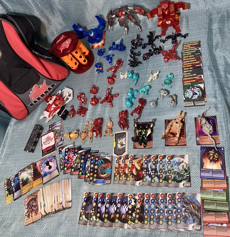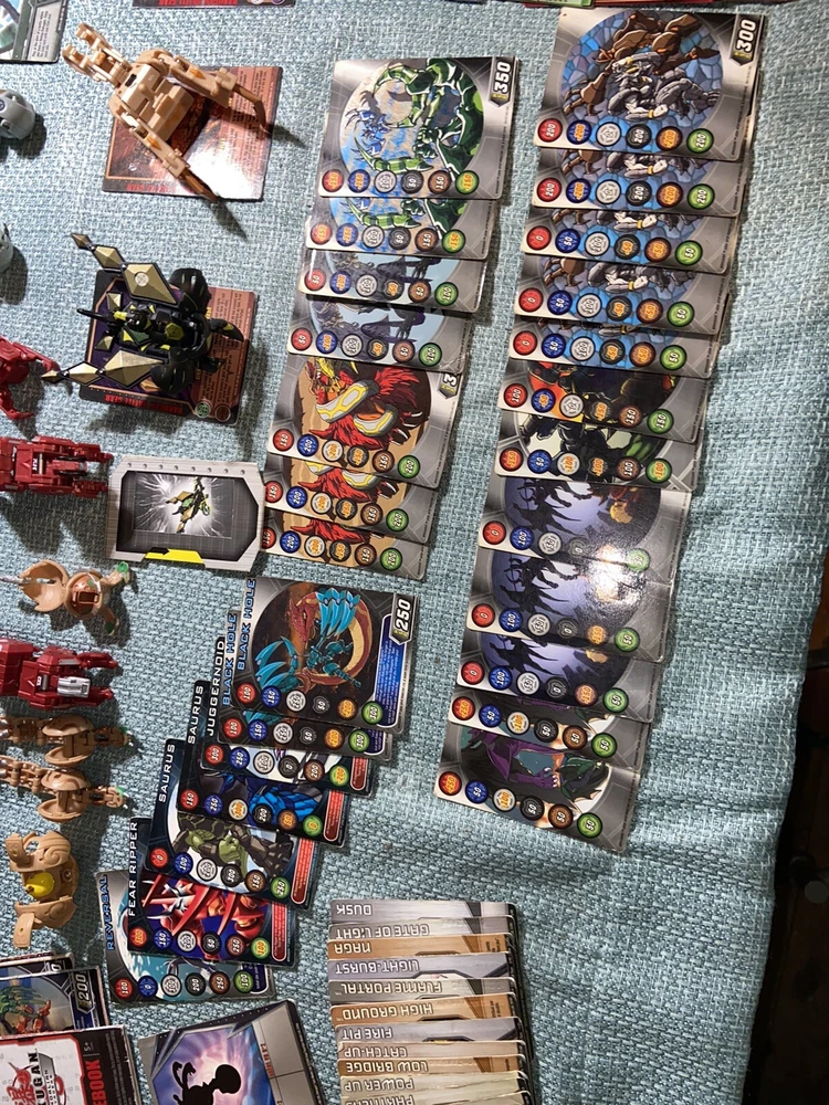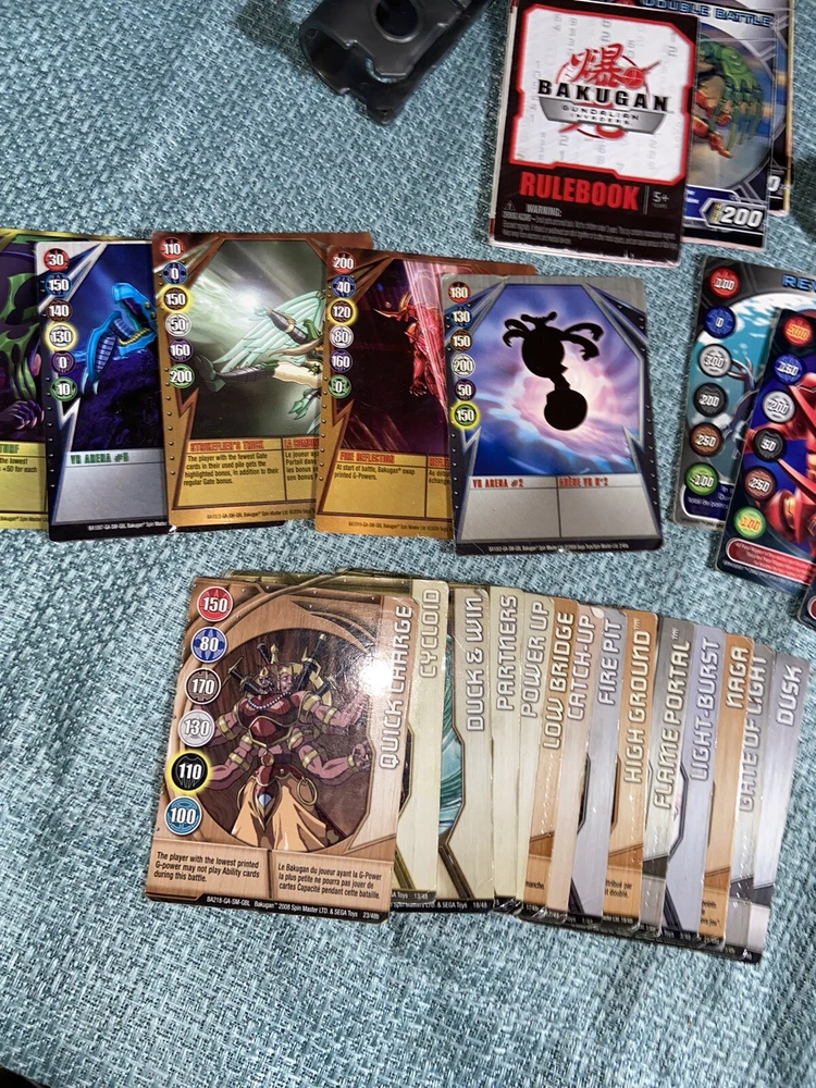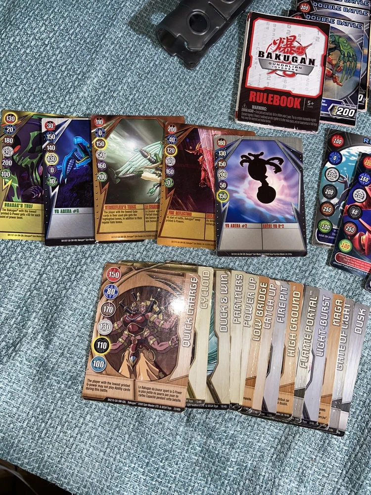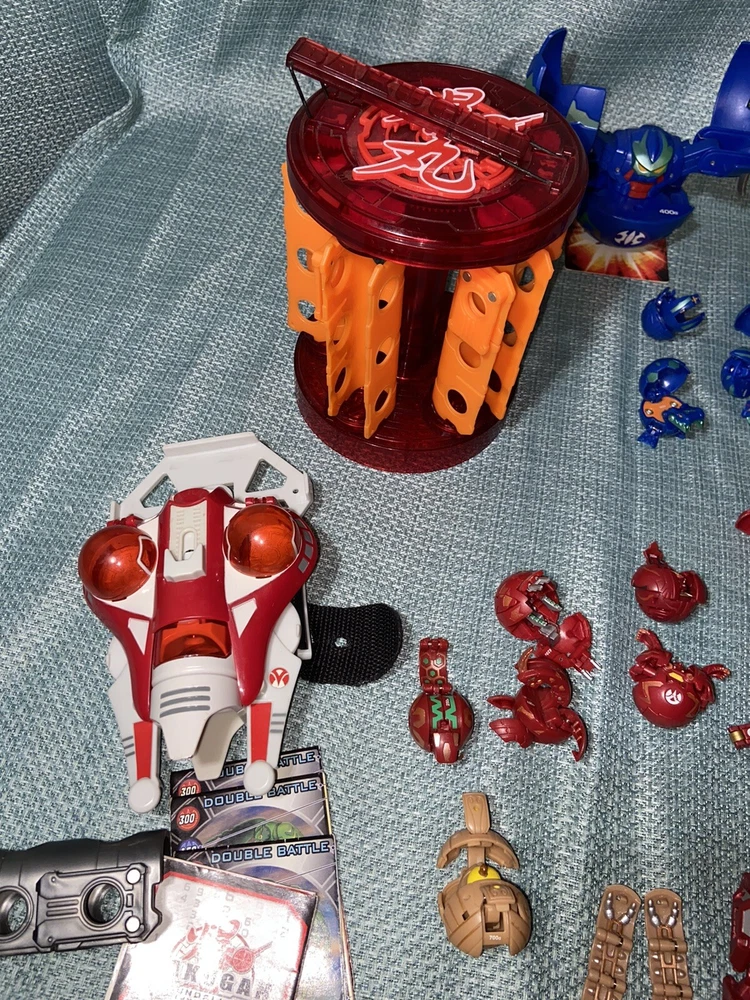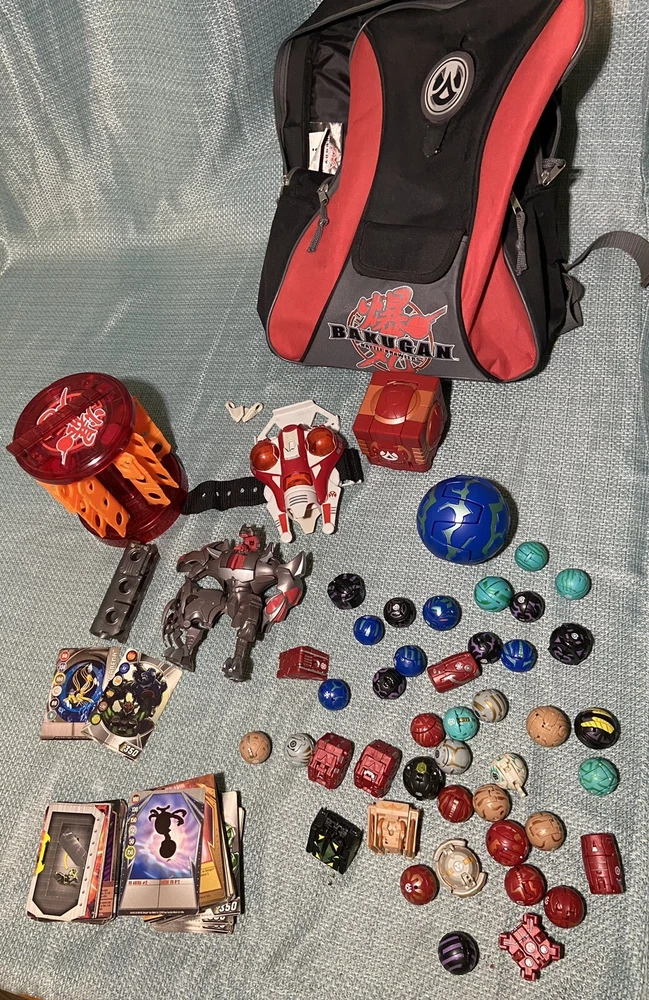 Bulk lot of trading cards, metal cards, backpack, rule books, gear cards and gear, wrist launcher, storage tower, 42 small Bakugan, 3 large Bakugan. Cards and items show wear and use some cards have more wear than others. For best descriptions, items conditions and what is included with purchase, please see photos, cards are not rated and are sold in as is condition.