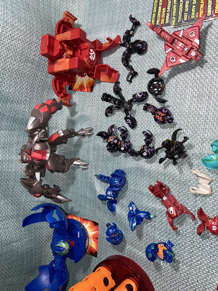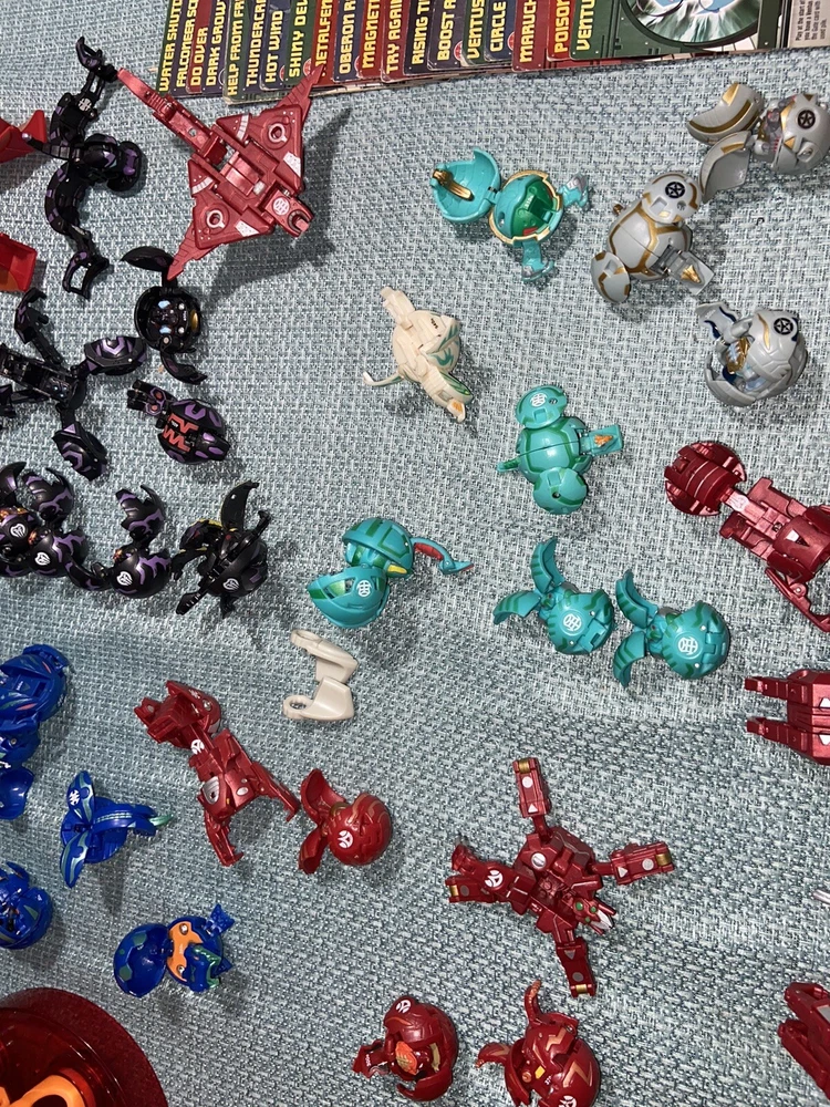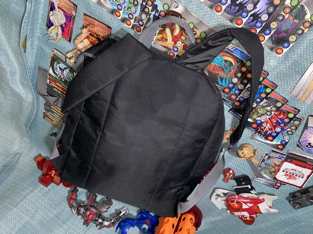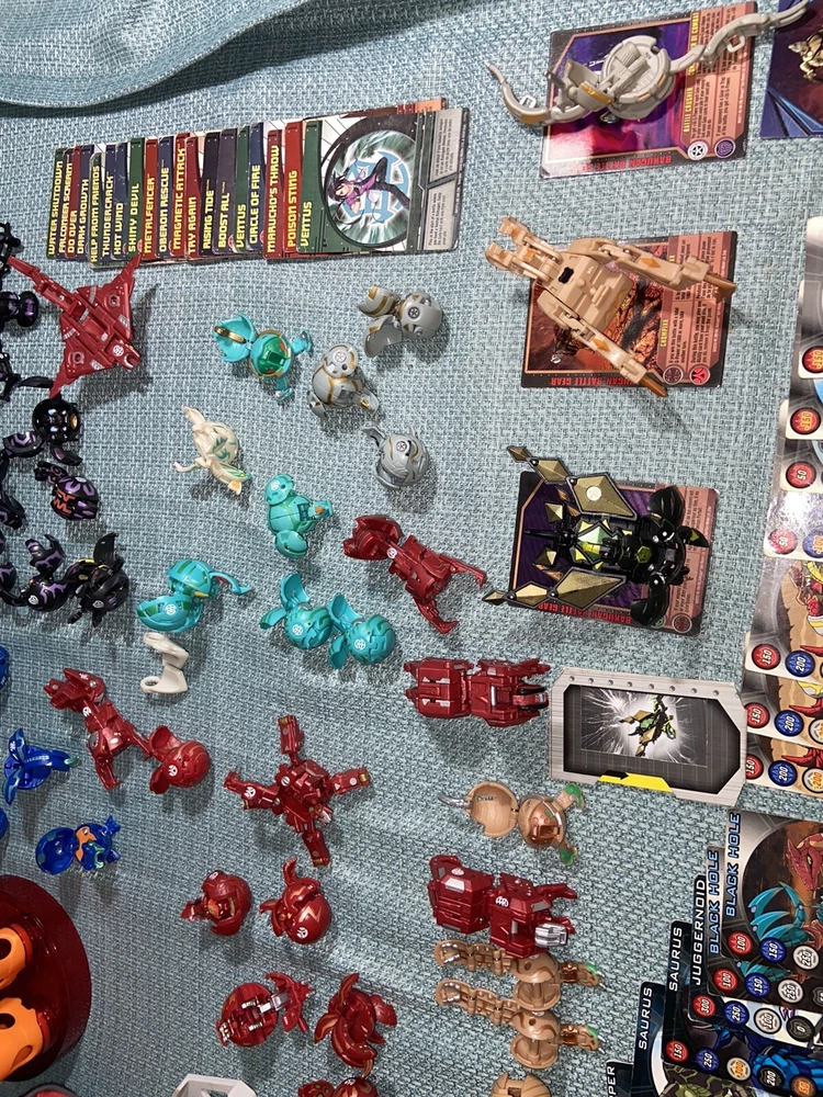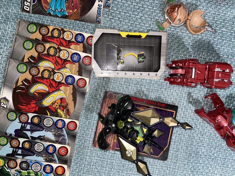 Bulk lot of trading cards, metal cards, backpack, rule books, gear cards and gear, wrist launcher, storage tower, 42 small Bakugan, 3 large Bakugan. Cards and items show wear and use some cards have more wear than others. For best descriptions, items conditions and what is included with purchase, please see photos, cards are not rated and are sold in as is condition.