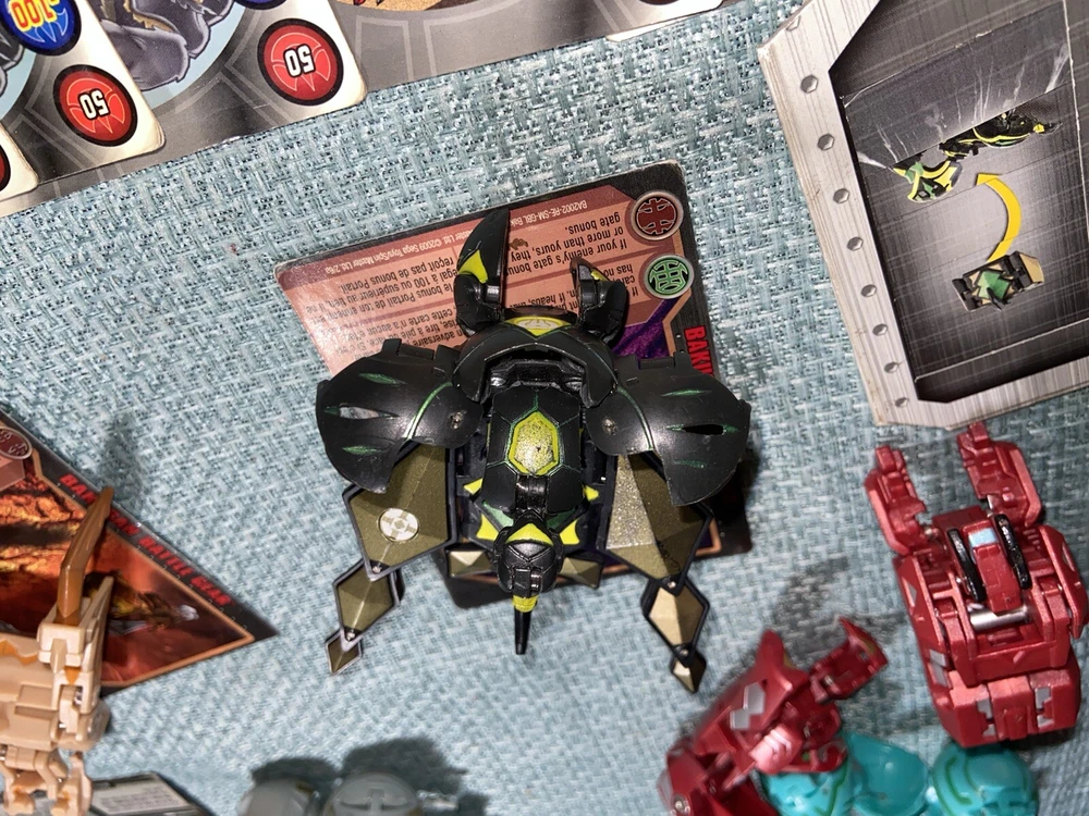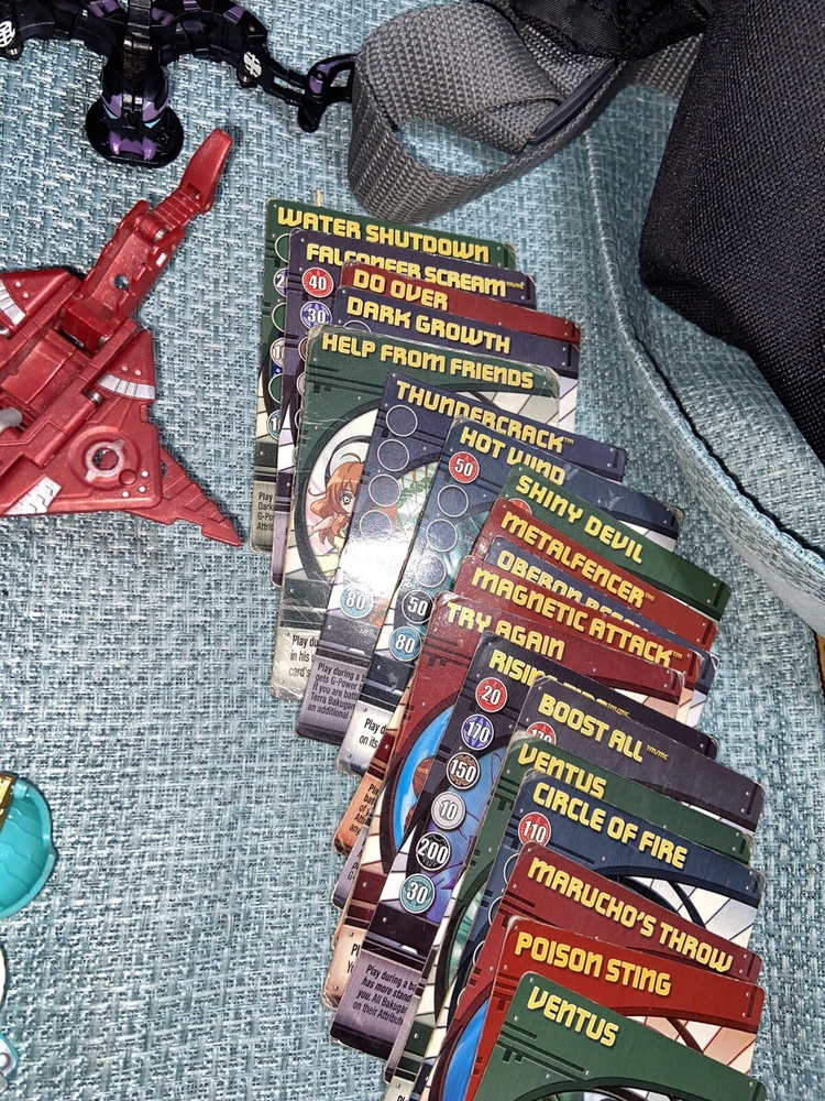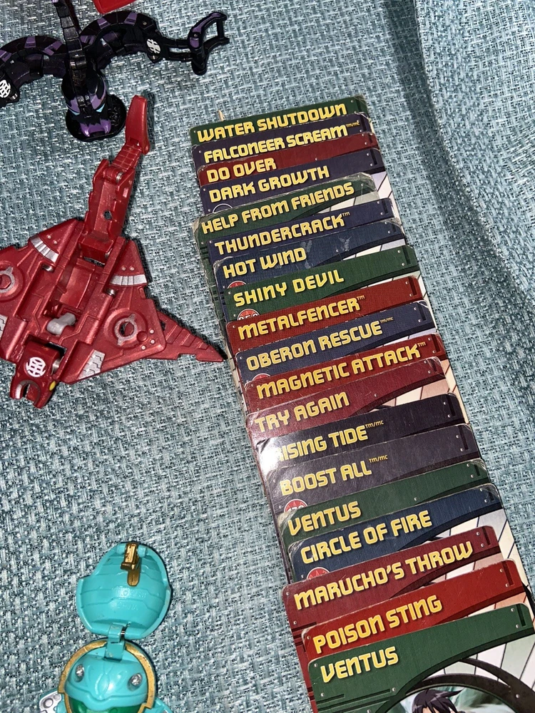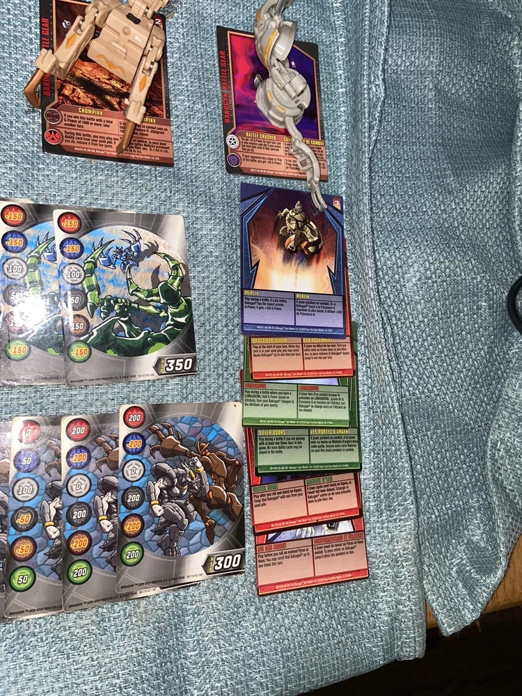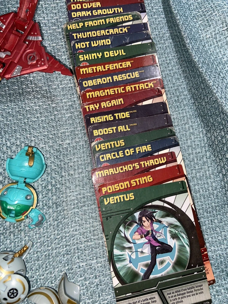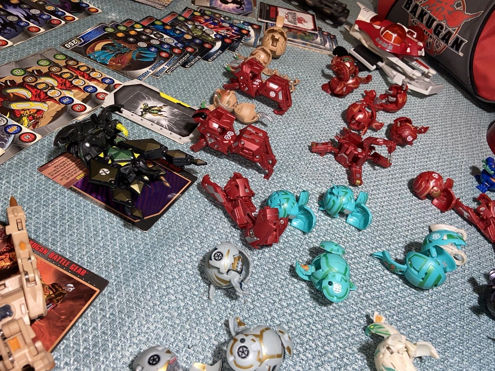 Bulk lot of trading cards, metal cards, backpack, rule books, gear cards and gear, wrist launcher, storage tower, 42 small Bakugan, 3 large Bakugan. Cards and items show wear and use some cards have more wear than others. For best descriptions, items conditions and what is included with purchase, please see photos, cards are not rated and are sold in as is condition.