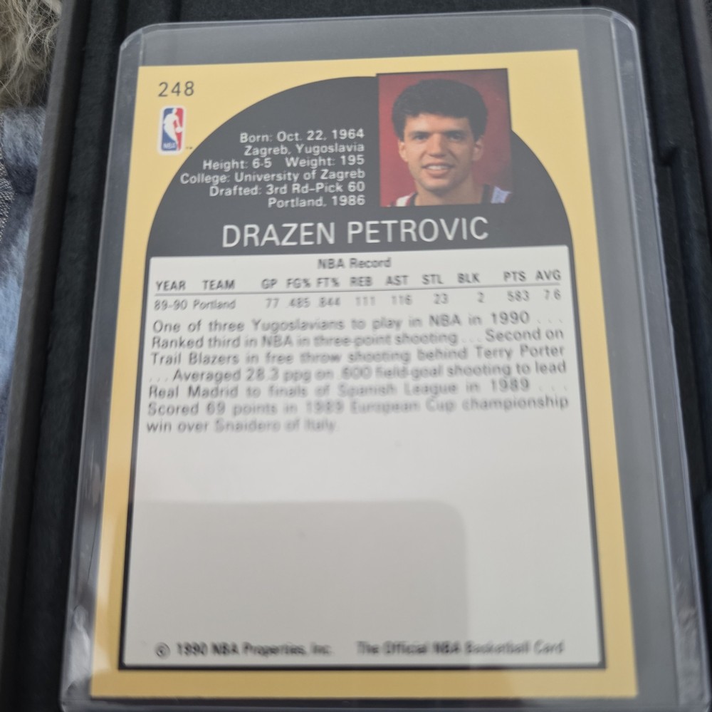 Capture a piece of basketball history with this 1990 NBA Properties sports trading card featuring the talented Drazen Petrovic, card number 248. Ideal for collectors and fans alike, this card celebrates one of the sport's notable athletes and is a valuable addition to any collection. With a focus on quality, this ungraded card is a must-have for those who appreciate the legacy of basketball and the storied careers of its players. Add this card to your lineup and enjoy a tangible connection to the sport's rich heritage.