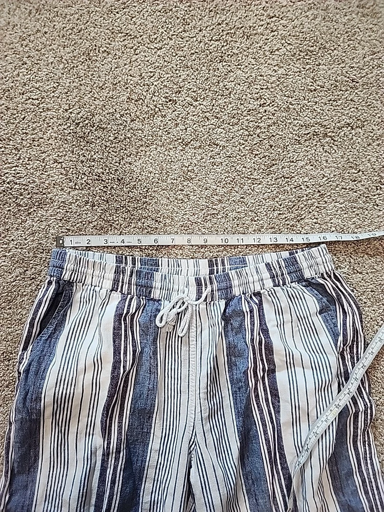 Pants in excellent condition with no rips or stains. Measurements on photos. These Beach Lunch Lounge capri pants are designed in a blue, white, and purple striped pattern, perfect for a casual or travel outfit. Made of a linen blend material, they feature an elastic waist for easy pull-on wear and have a wide-leg silhouette with a 20-inch inseam. The pants also include convenient pockets for added functionality, making them a comfortable and stylish option for beach or bohemian-themed looks.