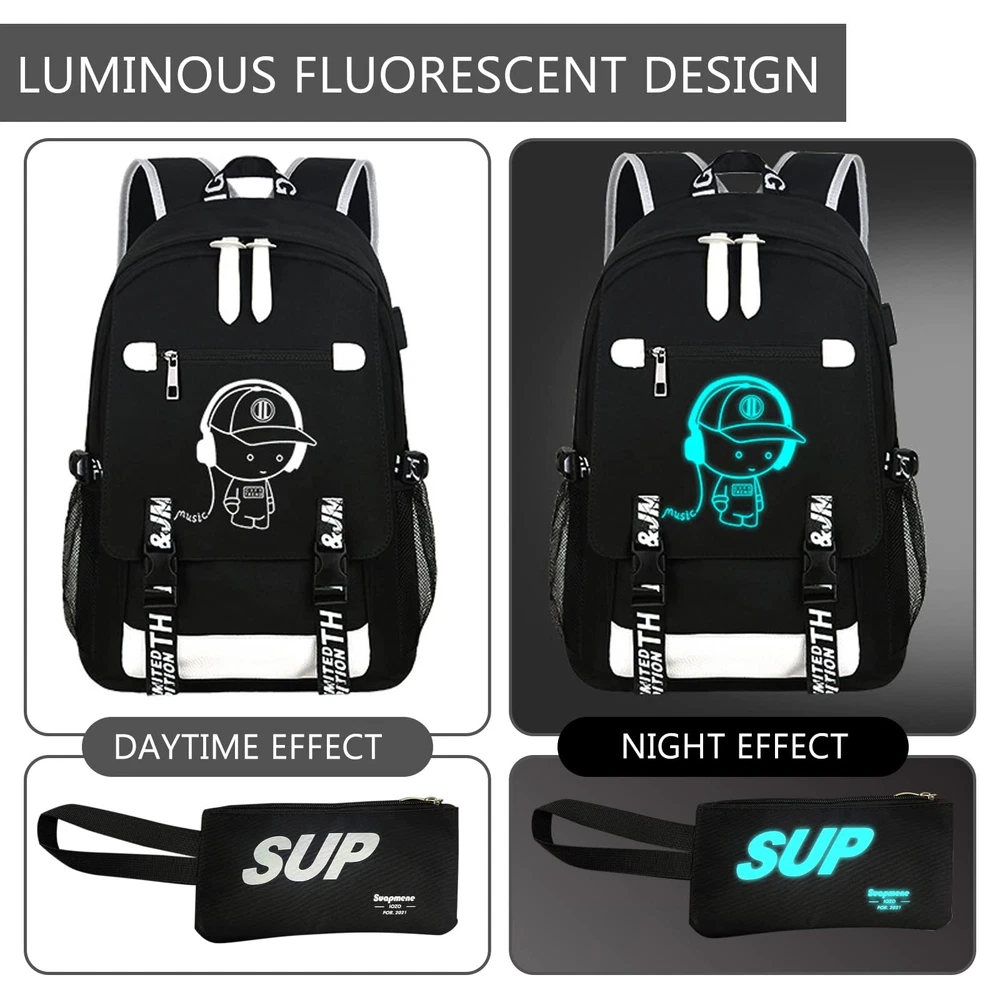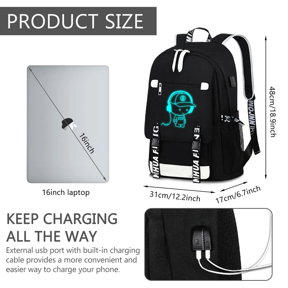 Description " We always pay attention to your use experience, and designed this simple and exquisite laptop backpack to help you store your items, and at the same time bring you a comfortable use experience. Product Name: travel on anti theft backpack Material: waterproof Oxford cloth Color: Black Size: 31*17*48cm Style: fashion, casual, simple Product selling point: 1. There are two compartments inside the large backpack, which can easily store computers and daily items, so that your items are organized and no longer messy. 2. The creative pattern design makes full of personality and more beautiful, making you more unique among the crowd. 3. The shoulder straps and bottom of the computer backpack are reinforced, so you don't have to worry about the backpack breaking during use. 4. The anti theft backpack is very suitable for work, travel, camping, making your travel easier. " MADE OF WATERPROOF OXFORD FABRIC:boy backpack.The travel bag is made of high-density Oxford cloth material,school backpack. which makes the laptop backpack excellent waterproof and wear-resistant, and has a longer service life. The smooth two-way zipper design makes the backpack more beautiful and makes your use more convenient. LARGE-CAPACITY STORAGE SPACE:anti theft backpackThere are multiple compartments inside the luminous backpack for , which can classify and store various items. You can even store a 16-inch laptop in the hiking backpack. anti theft backpack.combination lock to make your use more secure and at ease. USB CHARGING&NIGHT LIGHT FUNCTION:The side of the cute backpack has a USB charging port and a headphone jack,middle school backpack which can be easily charged while walking, completely freeing your hands. The creative cartoon music character design can emit light at night,school backpack boys which makes the travel backpack for full of high-end and more unique. IDE RANGE OF APPLICATION OCCASIONS:anime backpack.The large-capacity design of the mesh backpack has multiple compartments inside, which can store a , making your items more tidy. The laptop backpack for can be widely used in , cool backpack.outing, hiking, camping, party, going to work and other occasions, showing your unique life taste. OUR SERVICE GURANTEE FOR YOU:Everything I do is based on customer satisfaction. If you are not completely satisfied with the purchased product or the product is damaged or broken in transit, please contact us in time. We will solve your problem as quickly as possible!