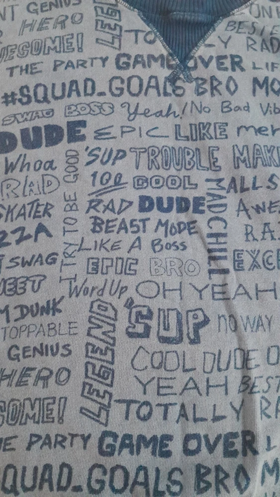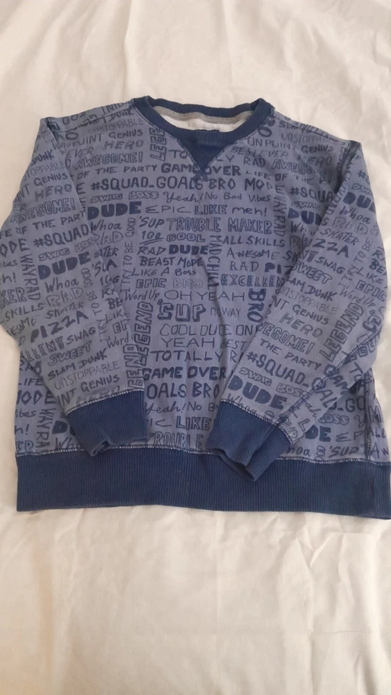 The Children's Place preowned boys pullover, graphic blue sweater. Size 10/12, crew neck with word designs "Goals, Game over", etc.