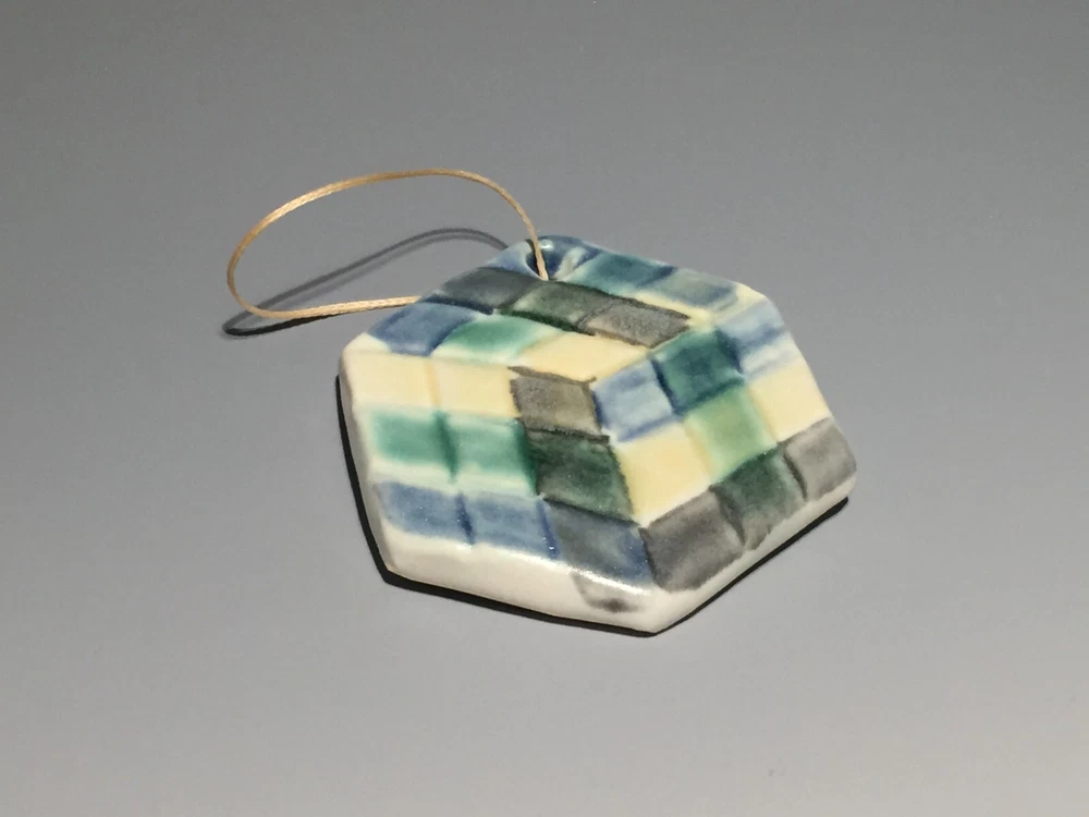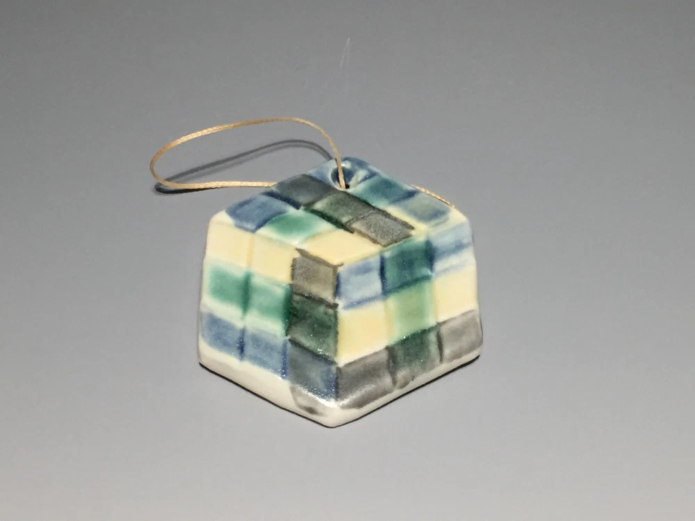 Handmade pottery piece fired to cone 6 with food safe glazes in painterly fashion. This piece was made by me, Curtis Fontaine, an apprentice of Toshiko Takaezu for two years. Most of my work is inspired by time with Toshiko and her spirit towards being an artist. At www.CurtisFontaine.com one can see more of my work. This piece is part of a series of my first cone 6 venture. With lots of experience making these glazes I am finally able to create and combine for new finishes. Unsigned. But can come with signed hand-painted card on request. This cube ornament is 2.75 in. around.