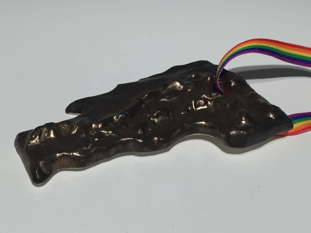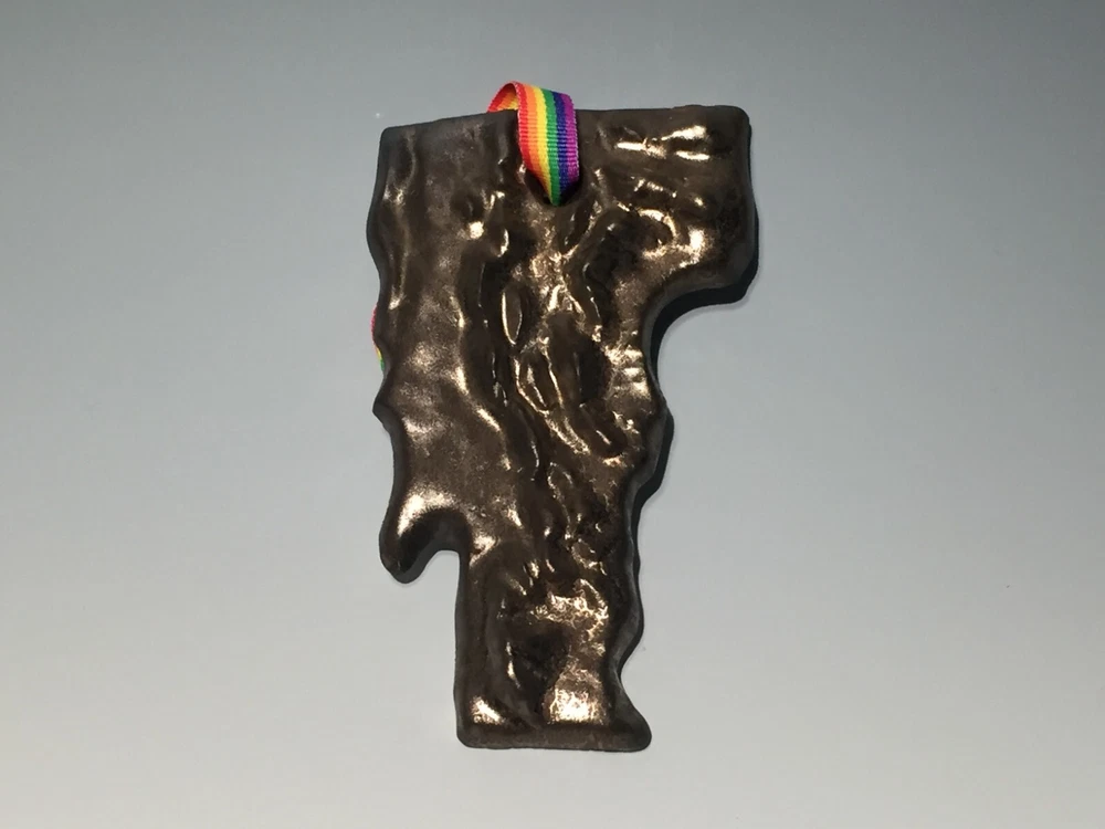 Handmade pottery piece fired to cone 6 with food safe glazes in painterly fashion. This piece was made by me, Curtis Fontaine, an apprentice of Toshiko Takaezu for two years. Most of my work is inspired by time with Toshiko and her spirit towards being an artist. At www.CurtisFontaine.com one can see more of my work. This piece is part of a series of my first cone 6 venture. With lots of experience making these glazes I am finally able to create and combine for new finishes. Unsigned. But can come with signed hand-painted card on request. This metallic Vermont state ornament is 4.5 in. tall.