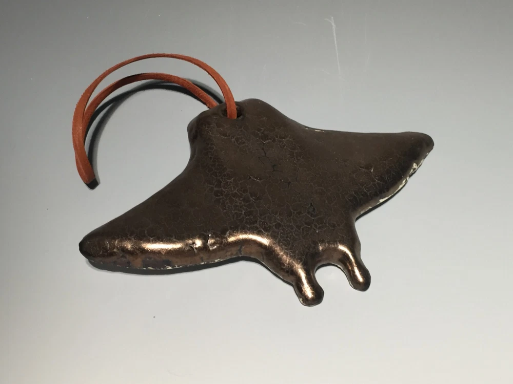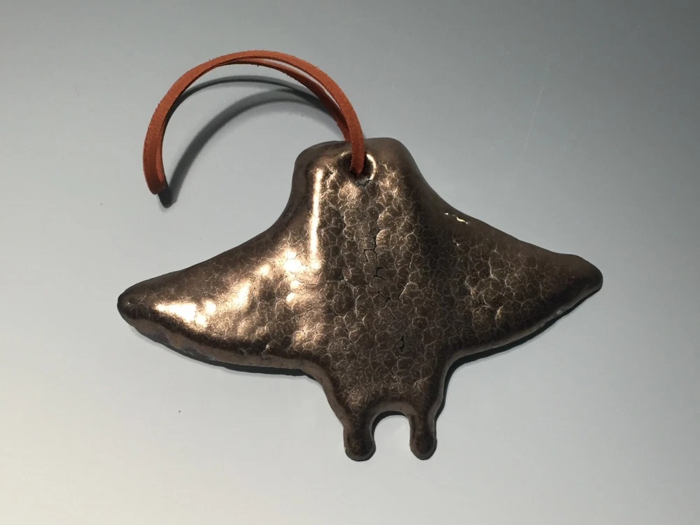 Handmade pottery piece fired to cone 6 with food safe glazes in painterly fashion. This piece was made by me, Curtis Fontaine, an apprentice of Toshiko Takaezu for two years. Most of my work is inspired by time with Toshiko and her spirit towards being an artist. At www.CurtisFontaine.com one can see more of my work. This piece is part of a series of my first cone 6 venture. With lots of experience making these glazes I am finally able to create and combine for new finishes. Unsigned. But can come with signed hand-painted card on request. This metallic manta ray ornament is 5.5 in. wide.