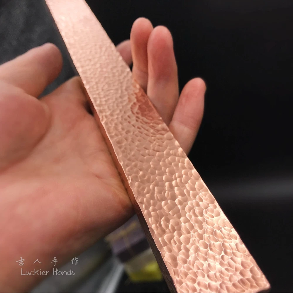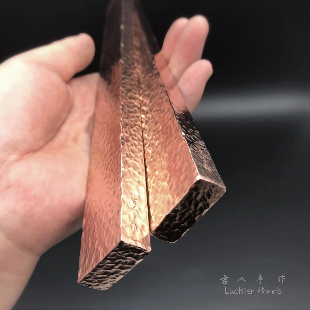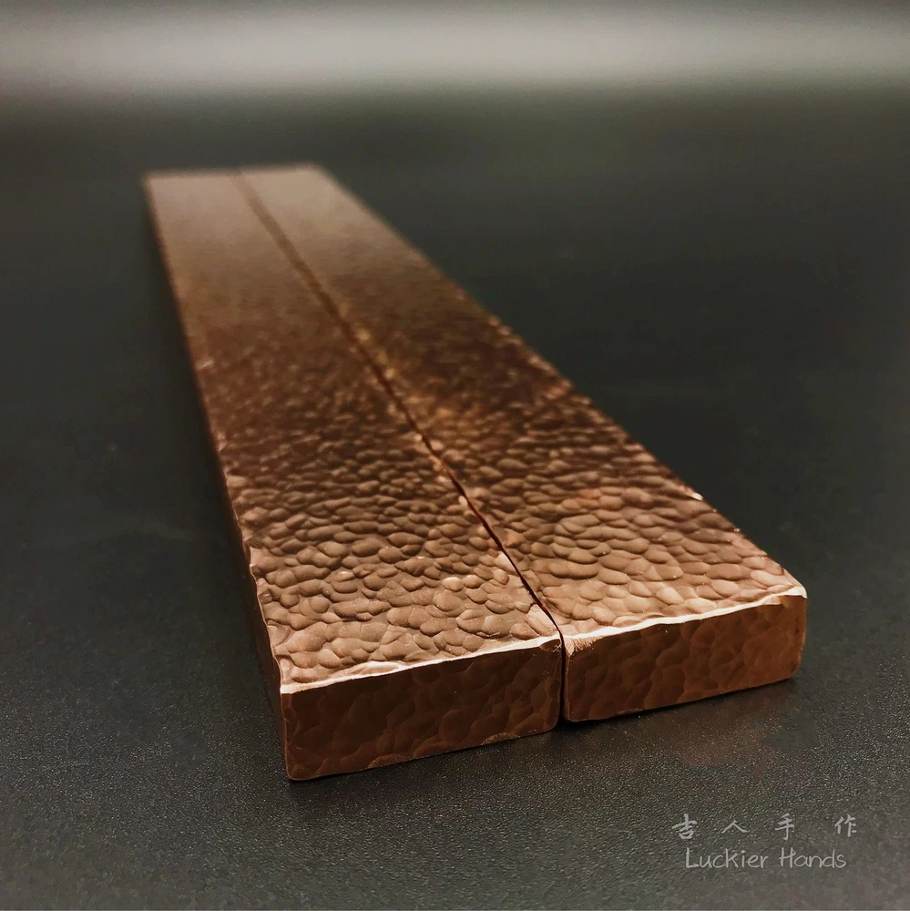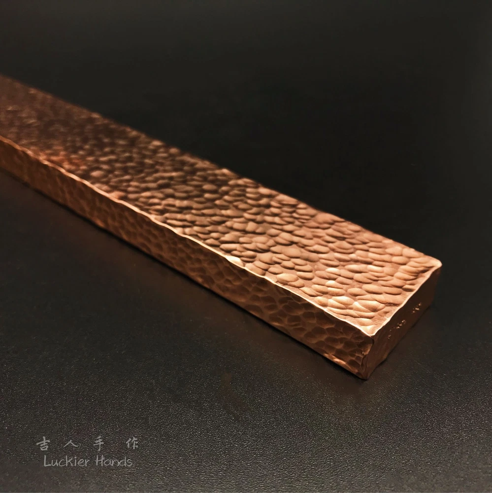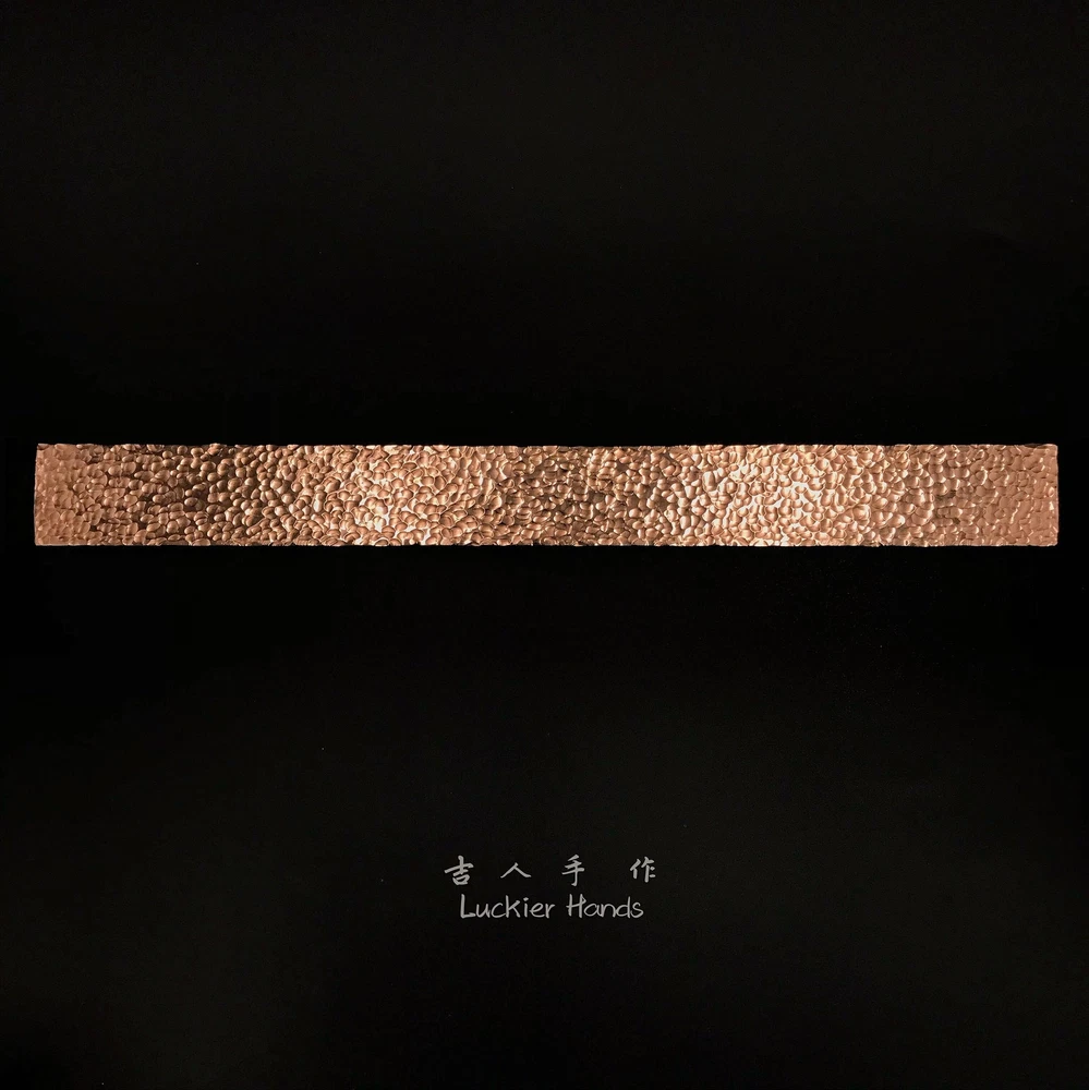 Hammer grain is a common texture on Chinese or Japanese metal objects, especially on copper and silverware with excellent ductility. Texture is a decorative technique between texture and pattern. Although it is hammered by hand, it does not form a specific image. There are many forms of mimicry, such as the barren and cracked land, the waves blown by the breeze, and the cracked bark of old trees. With one hammer and one stroke, you can create ever-changing styles. Specifications: 25×10×250, weight about 555 grams. Six sides are full of hammer patterns. Note that because they are purely handmade, each one will have slight differences and cannot be exactly the same, please know. This is a copper product that can last a lifetime. The surface has been treated to delay oxidation. But as time goes by, its color will slowly change, just like a bottle of fine wine, which gradually becomes more mellow. Of course, it's easy to restore it to its original color. We will provide special polishing materials. The beauty of copper lies here. Friends who are willing to choose auspicious people are all destined people...