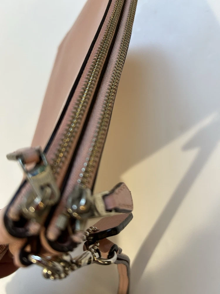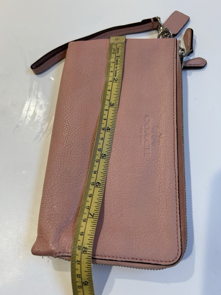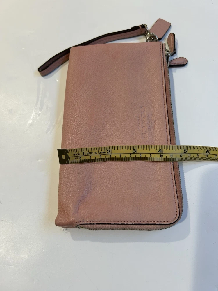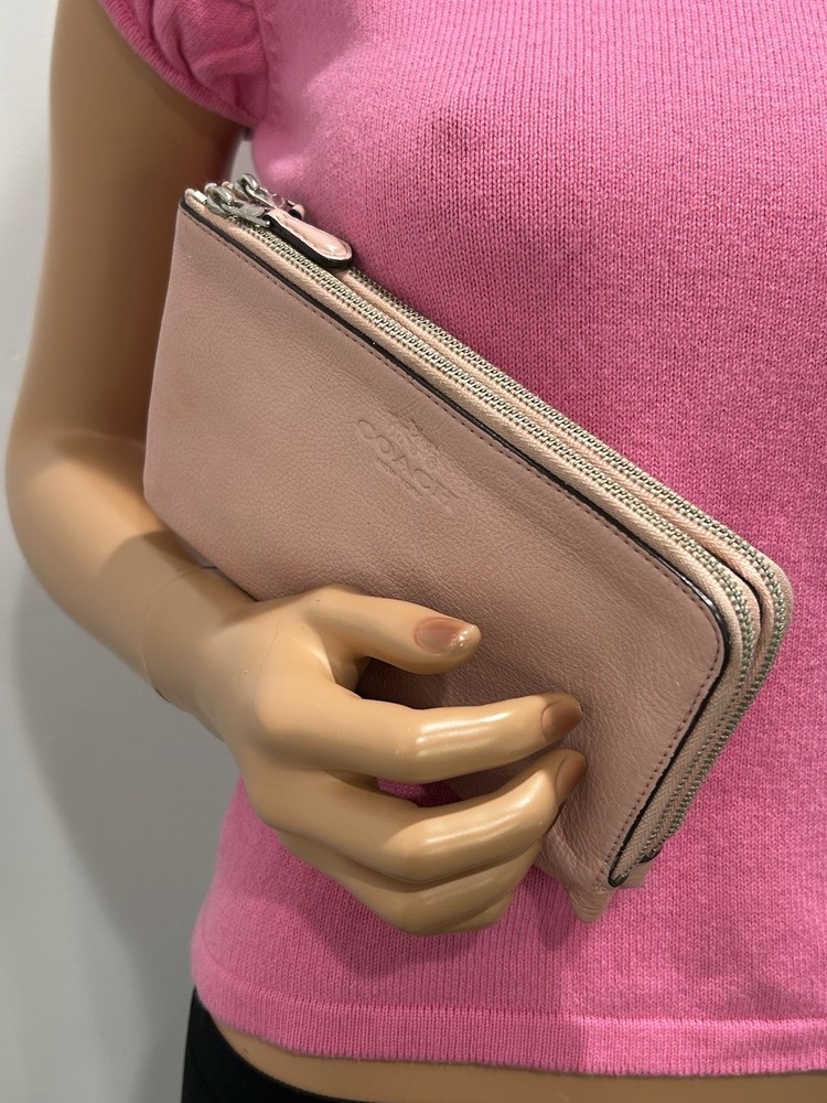 The Coach wristlet wallet double zip is a stylish and practical accessory for women. Made of pink leather with a satin finish, this wallet features a solid pattern and logo accents. With zippered closure and multiple compartments for credit cards, checks, and cash, this one-size wallet is perfect for on-the-go use. The compact size of 8” in length and 4” in width makes it convenient to carry in a bag or as a wristlet.