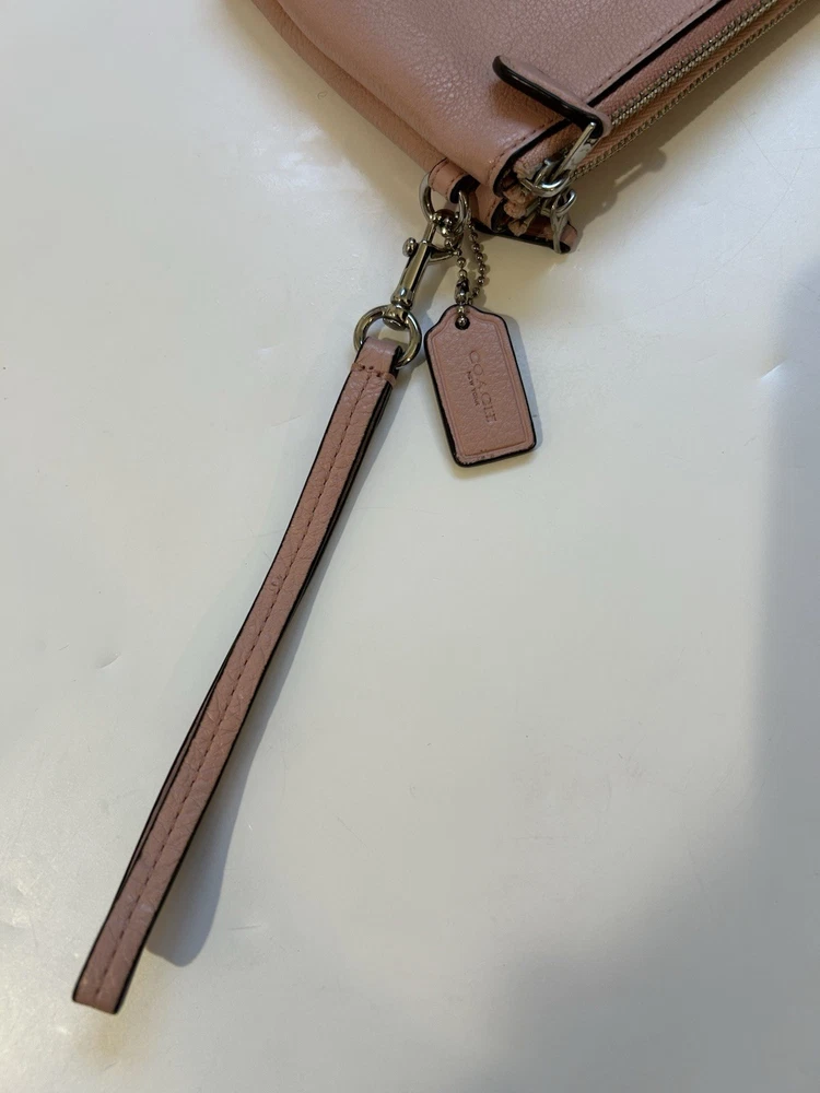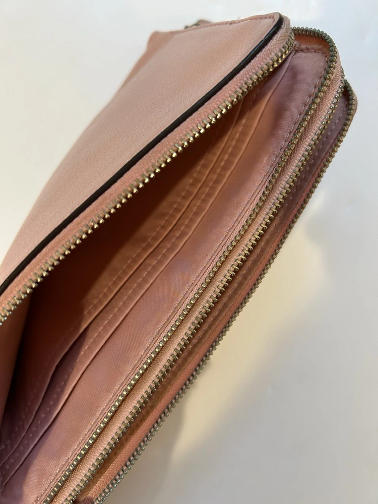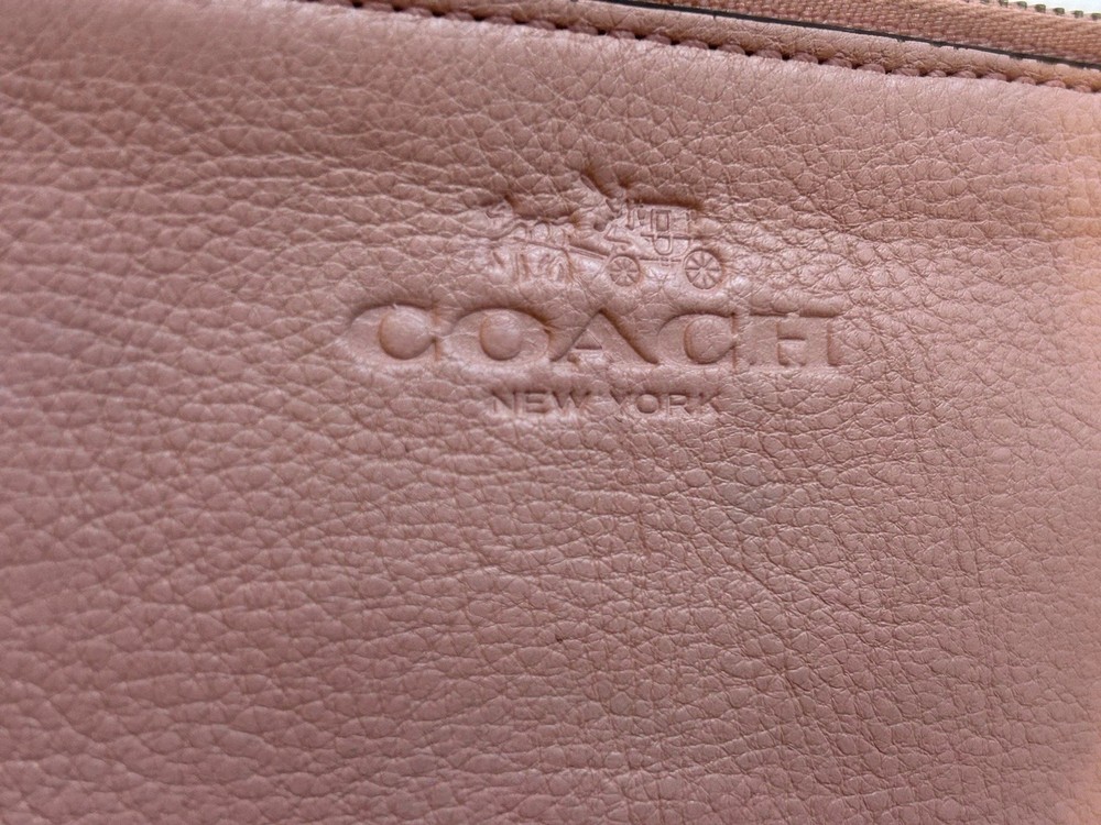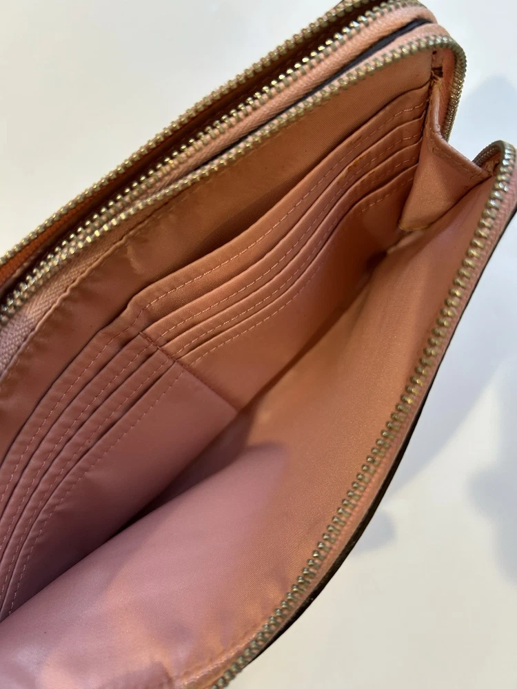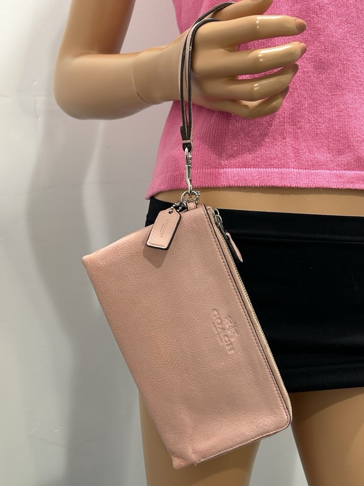 The Coach wristlet wallet double zip is a stylish and practical accessory for women. Made of pink leather with a satin finish, this wallet features a solid pattern and logo accents. With zippered closure and multiple compartments for credit cards, checks, and cash, this one-size wallet is perfect for on-the-go use. The compact size of 8” in length and 4” in width makes it convenient to carry in a bag or as a wristlet.