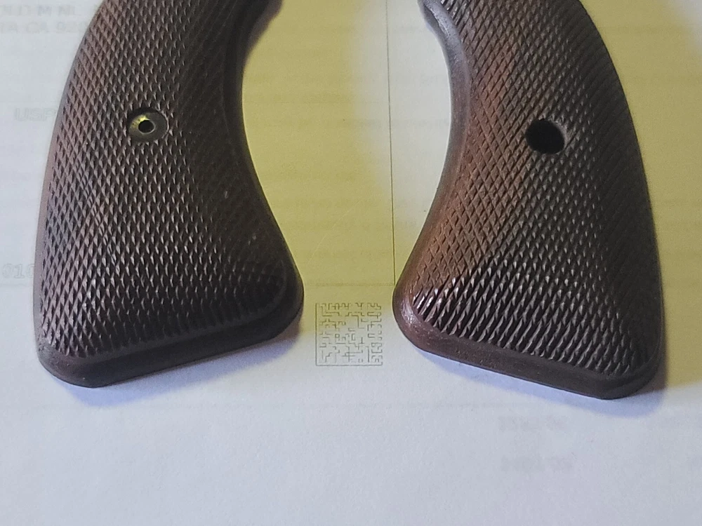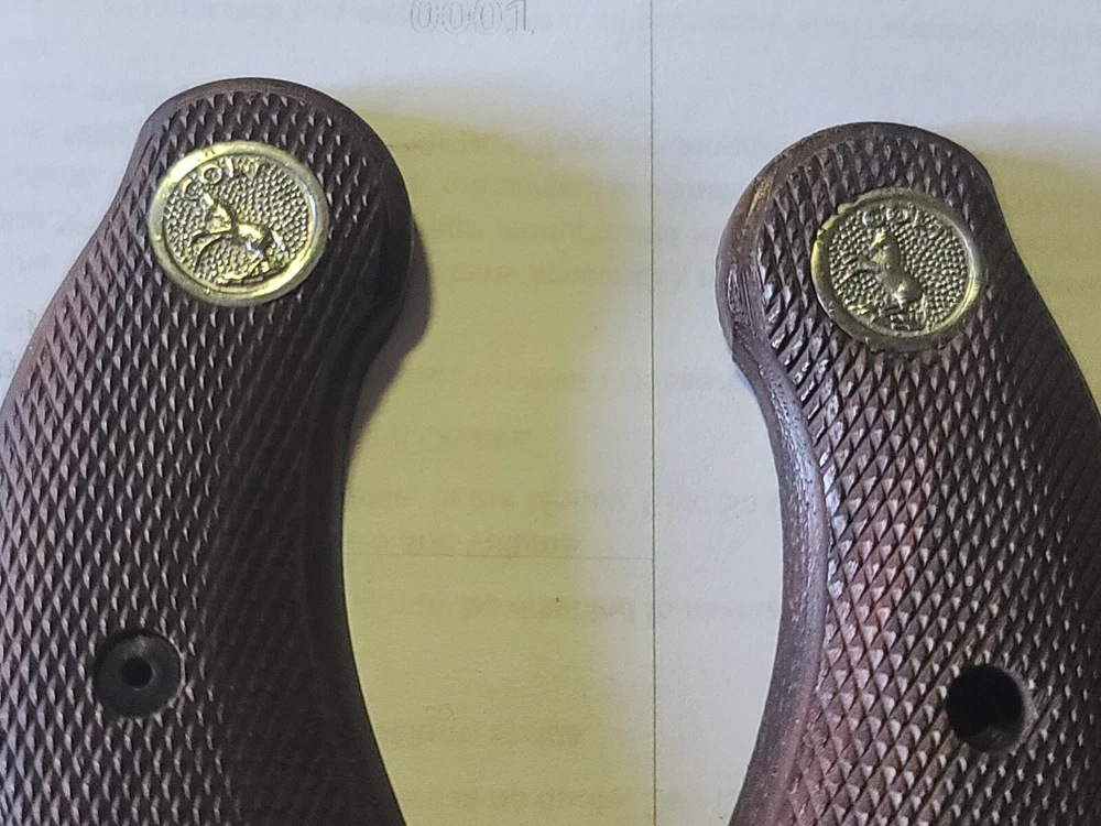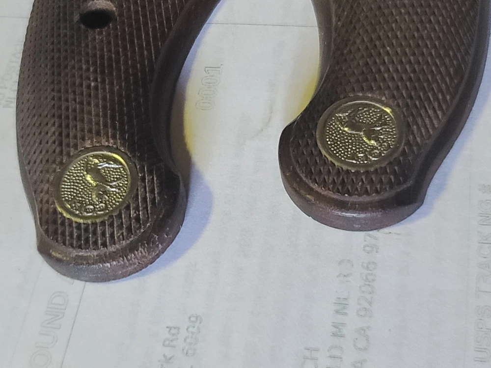 Enhance your Colt handgun's feel and appearance with these authentic Colt Police Positive checker walnut service grips. They are meticulously crafted to fit a range of Colt models, ensuring a snug and secure attachment. The rich brown color of the wood complements the classic design, offering a warm and professional look that's both functional and aesthetically pleasing.These grips are engineered from high-quality walnut, providing a comfortable grip with a classic aesthetic that many shooters appreciate. The distinctive checker pattern adds a layer of texture for a better grip, making them an excellent choice for those who value both form and function in their firearm accessories. Please let me know if you have any questions or concerns. Ship is 9.00 usps ground advantage, ebay will likely add tax.