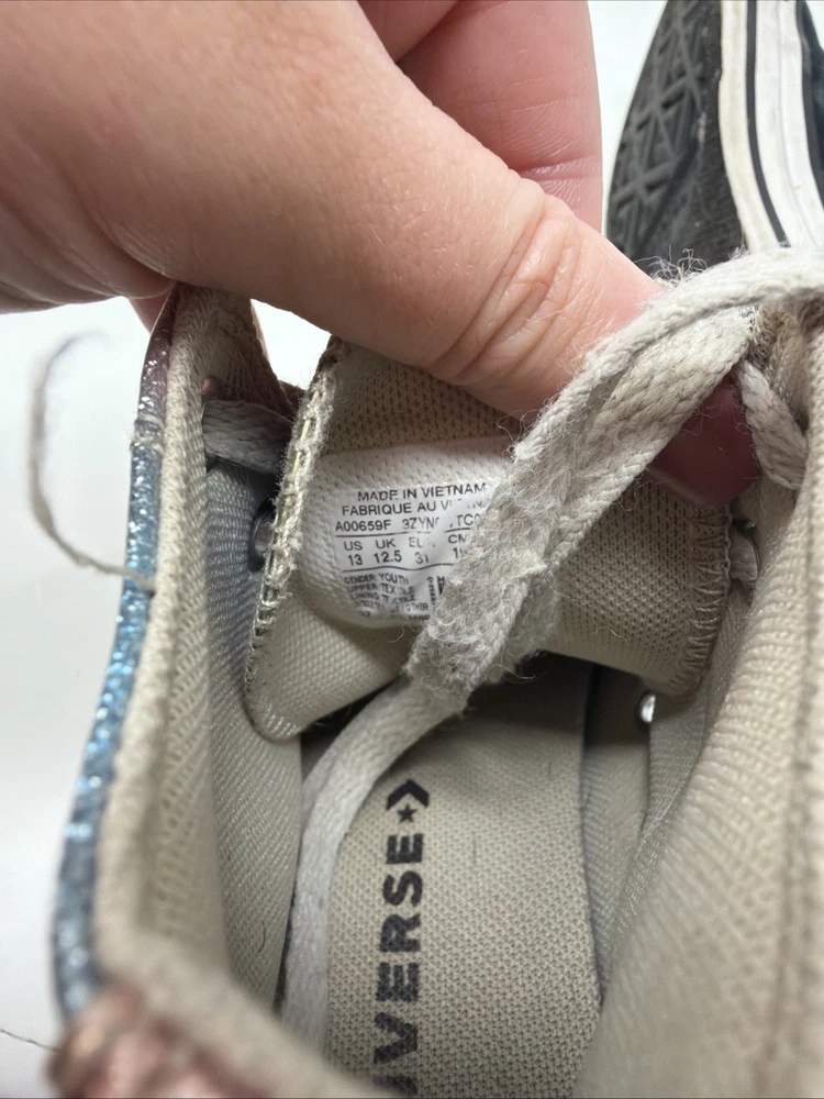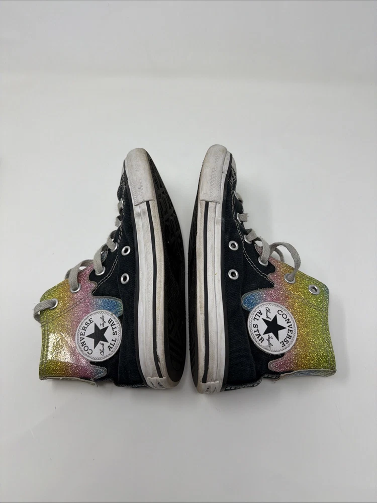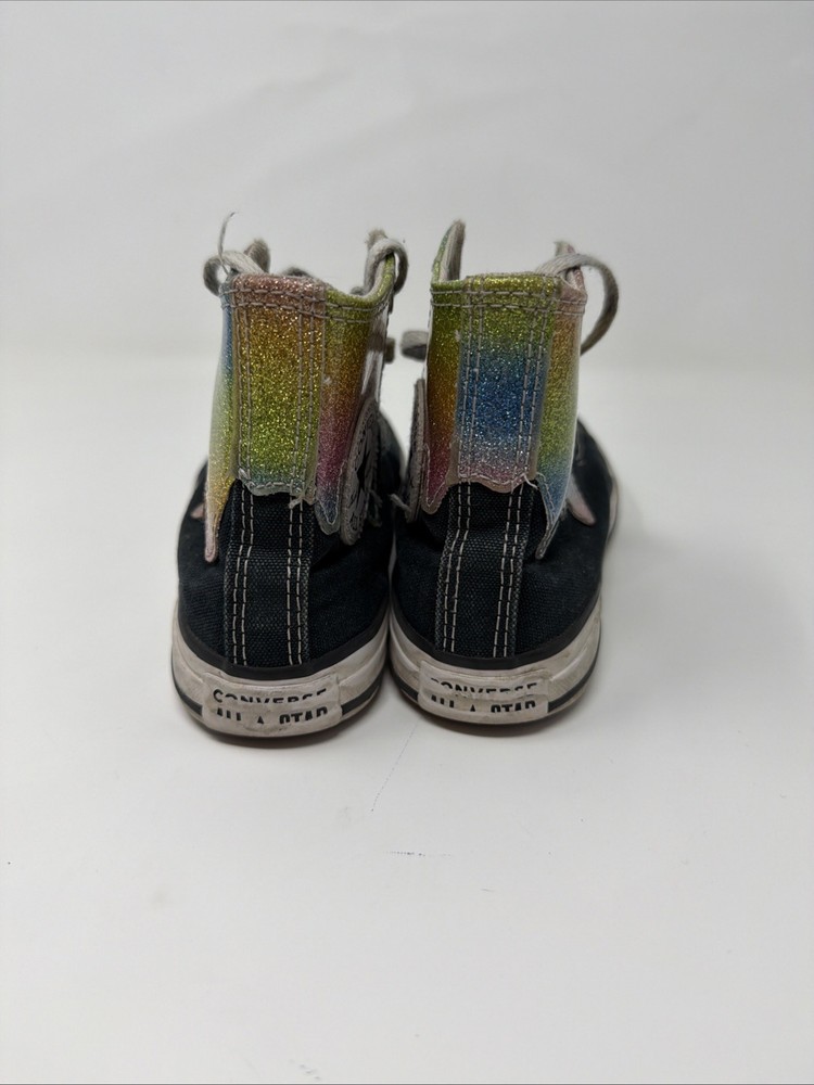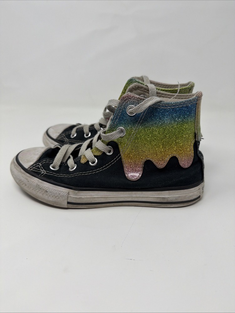 The product is a pair of Converse Chuck Taylor All Star high-top sneakers in black, designed for kids in youth size 13. These iconic shoes feature a round toe shape, lace-up closure, flat heel, and rubber outsole for comfort and durability. Perfect for casual wear in any season, these sneakers also offer minimal cushioning and are adorned with the Converse logo as accents. The unisex design and standard shoe width make them suitable for both boys and girls, while the high-top style adds extra protection and support. Made with canvas fabric and rubber lining, these Converse shoes are a timeless choice for active kids.