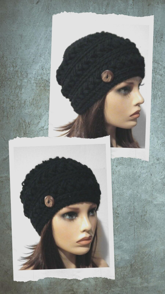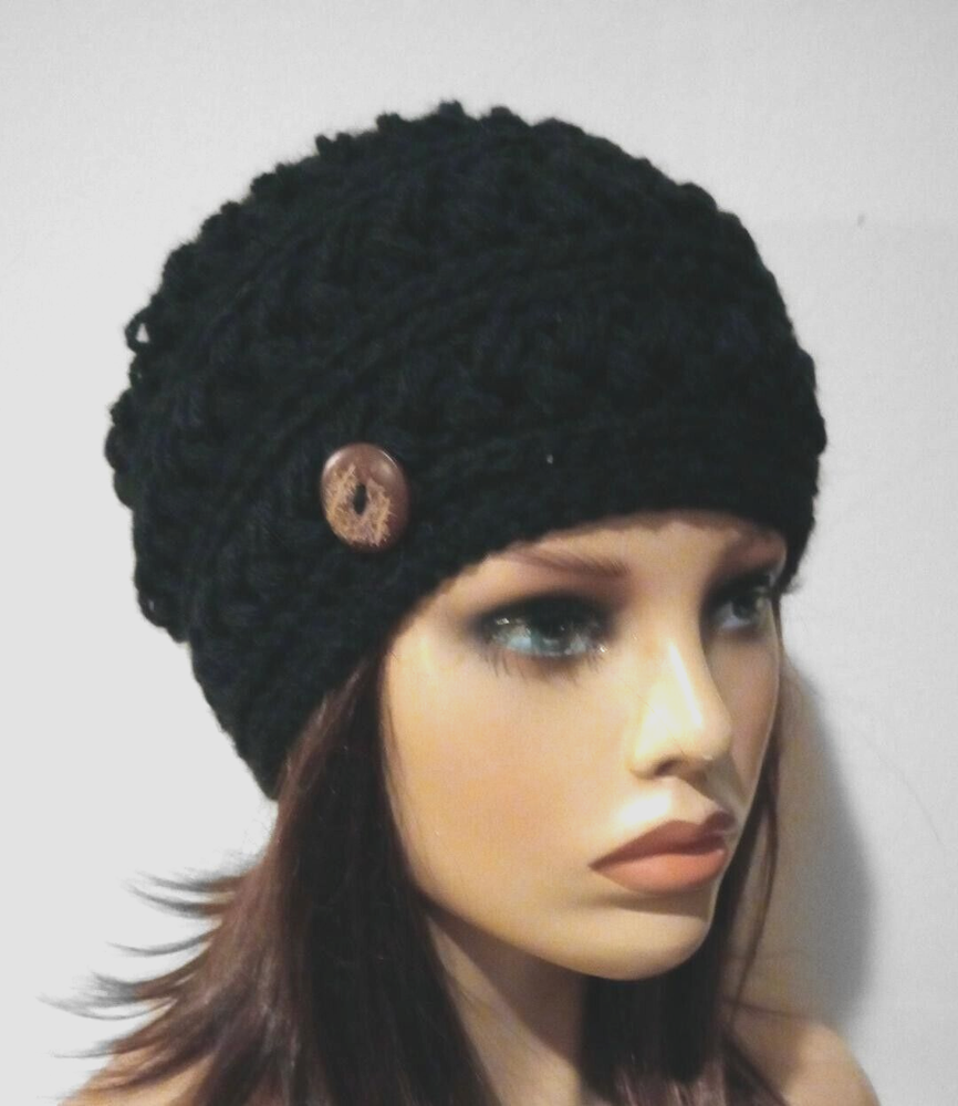 Style: Beanie Model: hat Size: One Size MPN: Does Not Apply Material: Acrylic Handmade: Yes Department: Women gtin13: Does not apply Personalize: No Personalization Instructions: na Country of Origin: United States Features: Crochet Seller Notes: “handmade new” California Prop 65 Warning: na Vintage: No Theme: Boho Brand: Handmade Occasion: Casual UPC: Does not apply Color: Black Character Family: crochet Character: na Accents: Button, Crochet Pattern: Solid Season: Fall, Spring, Winter Fabric Type: Crochet