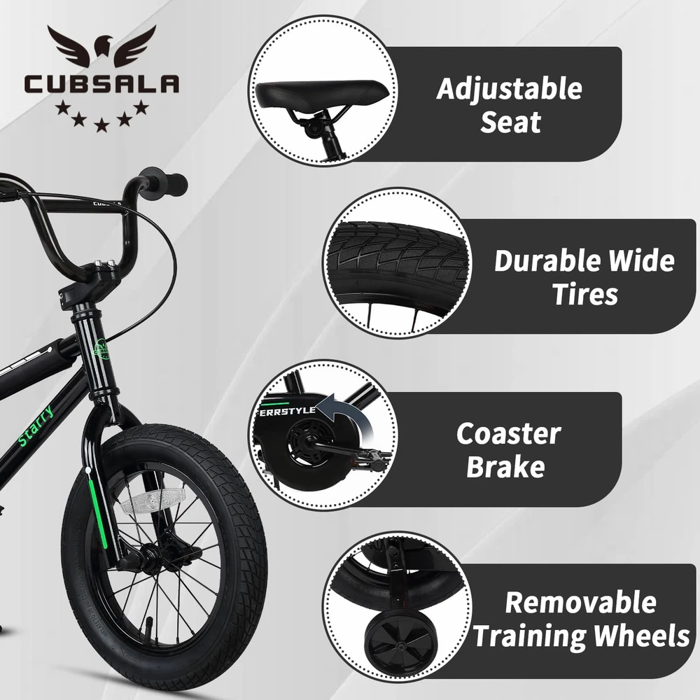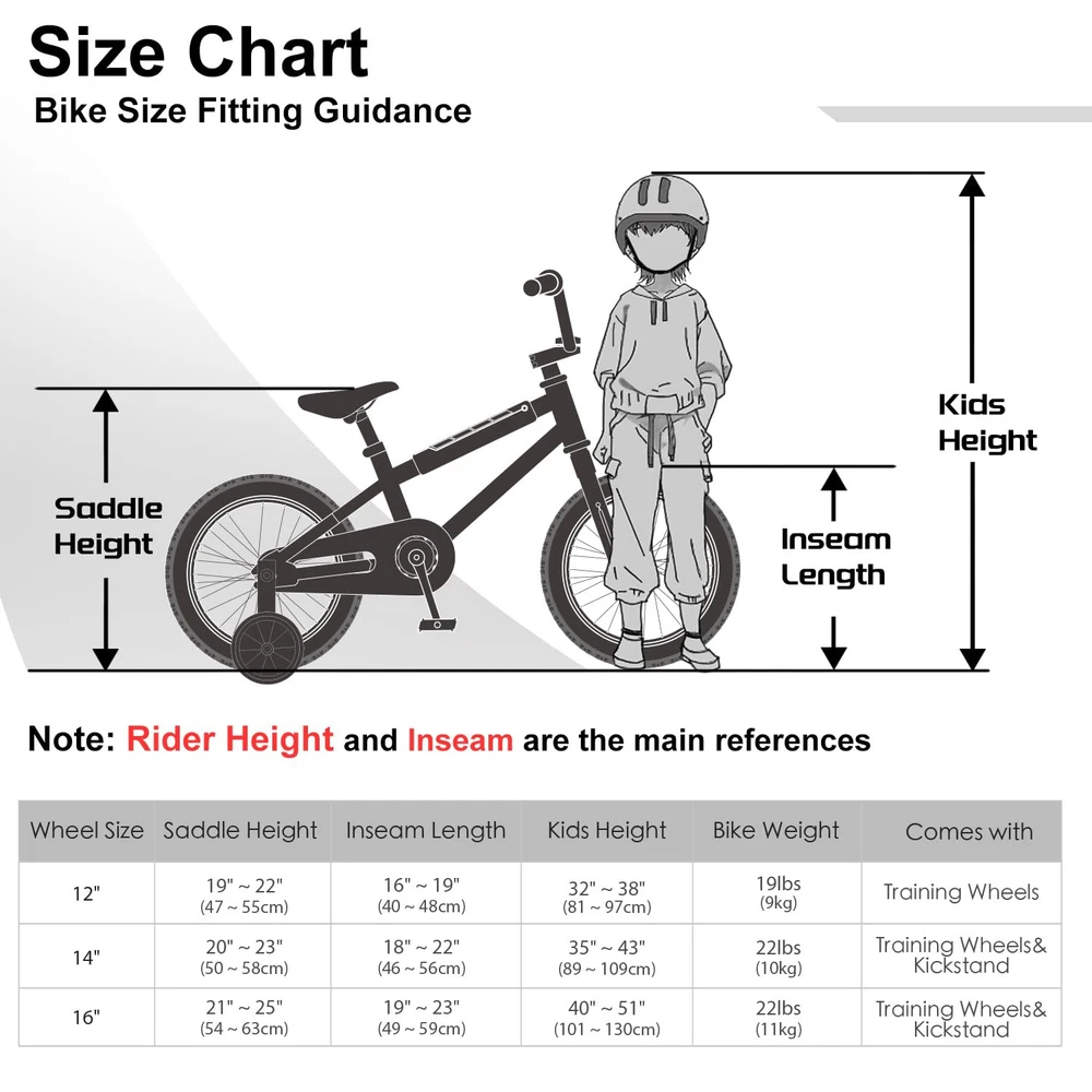 【Designed for Children】 Cubsala Starry kids bicycles are designed specifically for early cyclists who have just learned how to ride bicycles. The accompanying training wheels of corresponding sizes provide stable support for cycling. The height adjustable saddle can perfectly adapt to the growth of children. 【Reliable Quality】 Cubsala Starry kids Bike's frames are made of high-ten carbon steel, which will not bend or break even when riding on bumpy roads. Provide the most basic safety guarantee for your child while cycling. This bicycle has high integrity, simple design, and requires minimal maintenance. We also provide a limited lifetime warranty for this sturdy frame. 【Safe and Durable】 The reliable coaster brake system is more suitable for young riders who may not have enough strength to operate hand brakes. The chain guard protects the chain, prolonging the bike's lifespan and preventing any injuries caused by touching the chain. The 14 x 2.4 inch wide tires provide excellent grip to prevent slipping during rides. 【Easy to Install】 The bike is 85% assembled and comes with the basic assembly tools, only a few parts need to be added to the bike, will take about 20 minutes. 【Check the Size】 The 12-inch bike is designed for children aged 1-4 or 32-38 inches tall. The 14-inch bike is suitable for kids aged 3-5 or 35-43 inches tall. The 16-inch bike is designed for children aged 4-8 or 40-51 inches tall.