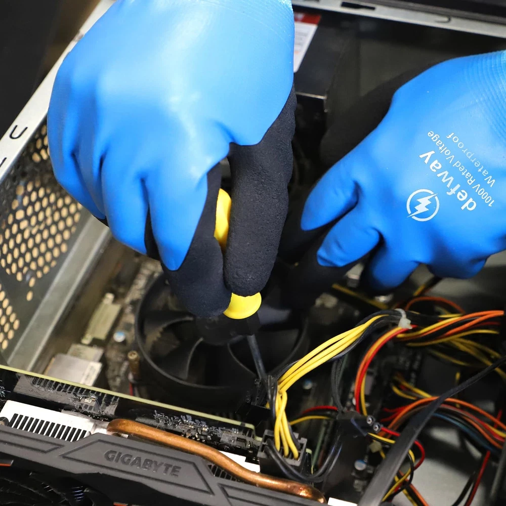 Our insulated work gloves, with excellent insulation, waterproof, non-slip performance, when you complete the electrical work, you can actually feel a high degree of security in the work process. No longer worry about electrocution, slip and fall and other accidents, so that you can devote yourself to work, improve operational efficiency and protect their own safety. High quality performance: Durable and economical: Well-maintained gloves have a long service life and can be reused many times. Compared with disposable protective gear or low-quality gloves that are frequently replaced, it saves you money. At the same time, its stable and reliable performance reduces the trouble of interrupting operations and re-purchasing due to glove failure, which is economical and practical. Waterproof & Anti-slip: Its waterproof performance is excellent, the nylon fabric and rubber part are tightly combined to form a tight waterproof barrier, water droplets contacting the surface of the gloves immediately slide off, ensuring that the hands always stay dry. Even in wet and watery electrical work sites, such as outdoor substations after heavy rainfall or indoor power distribution rooms with high humidity, the insulating effect will not be affected by water infiltration or inconvenience caused by operation. In addition, the well-designed non-slip texture on the palm and fingers is like a firm “grip” on the tool, providing you with a stable and reliable grip in dry or wet environments, effectively preventing the tool from slipping and causing accidents. Maintenance way: Cleaning points: after use, first gently wipe the surface of the gloves with mild soapy water or special cleaner to remove dirt, grease, dust and other impurities. Pay attention to avoid the use of corrosive chemical reagents, so as not to damage the glove material. Be gentle when wiping, especially the rubber parts, to prevent excessive force causing wear and tear. For more difficult to remove stains, can be soaked in warm water for an appropriate period of time before cleaning, but the soaking time should not be too long, generally no more than 15 minutes. Drying tips: After cleaning, place the gloves in a well-ventilated, cool and dry place to dry naturally, do not expose them to the sun or use a dryer to dry them. High temperature will make the nylon material become brittle, rubber aging, seriously affect the performance and service life of the gloves. Gloves can be hung flat on a hanger or clothesline, or laid on a clean flat surface to ensure adequate ventilation and drying of all parts. Storage method: After the gloves are completely dry, they should be stored in a dry, cool and light-proof environment, and avoid storing them together with chemicals and sharp instruments. It is recommended to use a special glove storage box or bag to store the gloves separately to prevent extrusion, deformation or scratches by other items. Take out the gloves regularly (e.g. quarterly) for inspection to check whether there is any moisture, mold or other abnormalities, and deal with any problems promptly. EXCELLENT 1000V INSULATION: These insulated work gloves have been rigorously tested to withstand voltages up to 1000V, providing you with reliable insulation protection when handling electrical equipment, effectively blocking the current and greatly reducing the risk of electric shock, making your operations safer and more secure. And we will also give you an extra roll of insulating tape. HIGH-QUALITY RUBBER PALM&FINGER DESIGN: The palm and fingers of the gloves are made of high-quality rubber material, which not only has excellent flexibility and allows you to operate all kinds of tools and equipment with ease, but also the insulating property of rubber further enhances the safety of the hand when it comes into contact with electrically-charged objects, ensuring that every action you take in the course of your work can be carried out accurately and safely. GOOD ANTI-SLIP PERFORMANCE: The rubber material on the palm and finger area has been specially treated with anti-slip texture, which can provide you with stable and reliable gripping power in both dry and wet environments, effectively preventing tools from slipping off, greatly improving the working efficiency and operational safety, and allowing you to be more at ease when working. WATERPROOF AND DURABLE NILON MATERIAL: The body of the gloves is made of nylon material with excellent waterproof performance, which can effectively resist water penetration and keep your hands dry, and can be used normally even in a wet working environment. Nylon is also abrasion-resistant and durable, ensuring that the gloves can withstand long periods of use and complex conditions, saving you money and providing long-lasting protection. MULTIPURPOSE WIDELY APPLIED: These 1000V insulated work gloves men are suitable for a variety of electrical work scenarios, such as installation and maintenance of electrical equipment, electrical line maintenance, substation work and so on. Whether you are a professional electrician or a person involved in electrical operations in the industrial field, you can rely on it to complete your work tasks efficiently and safely, which is an indispensable safety protection tool for you.