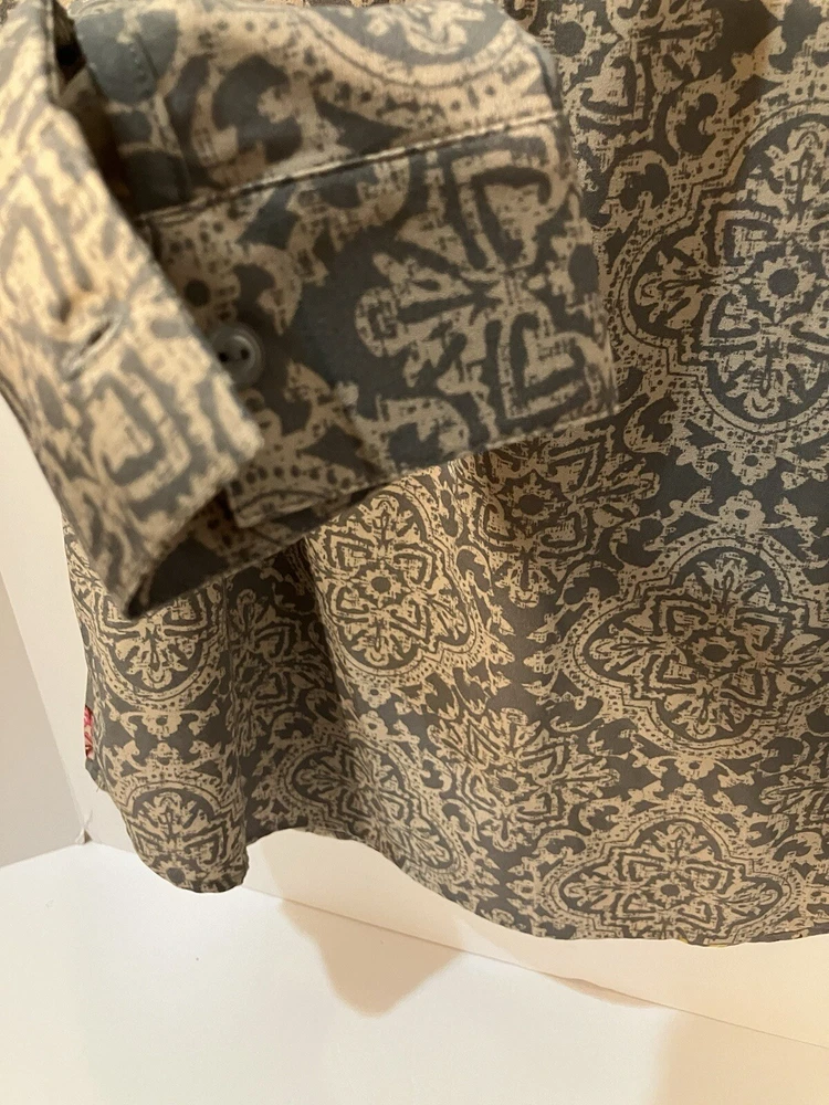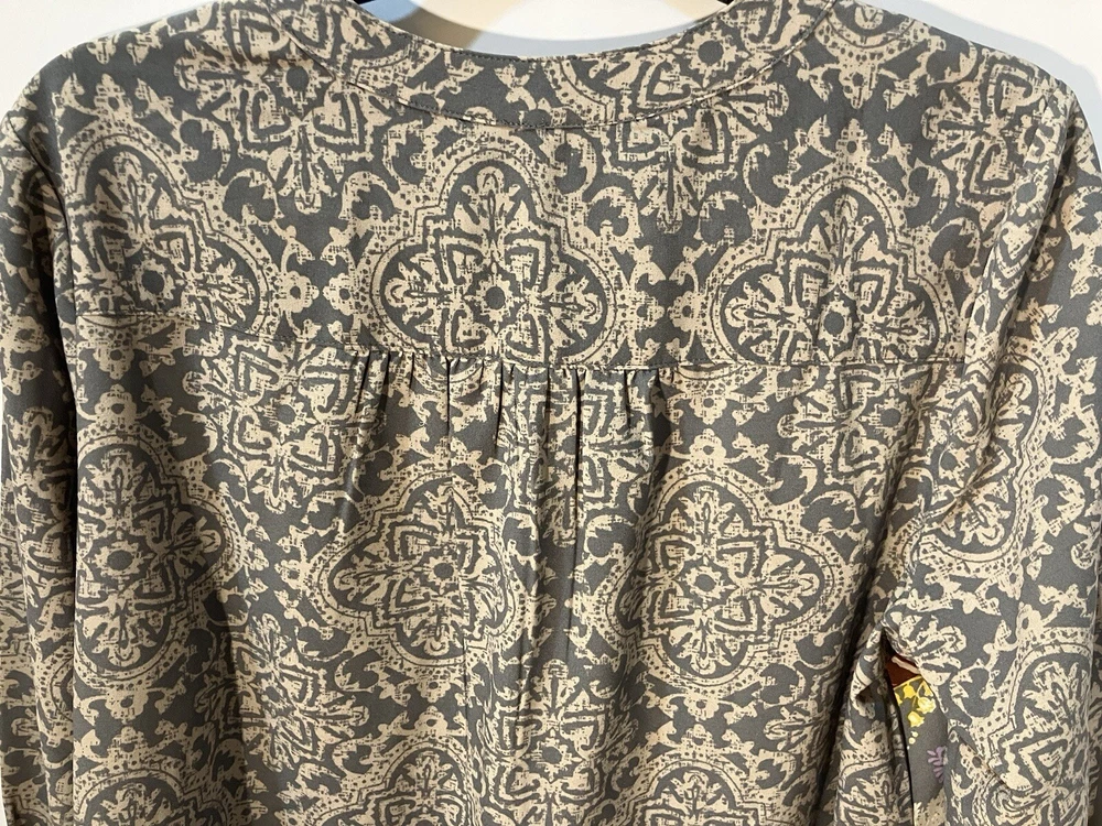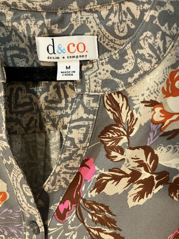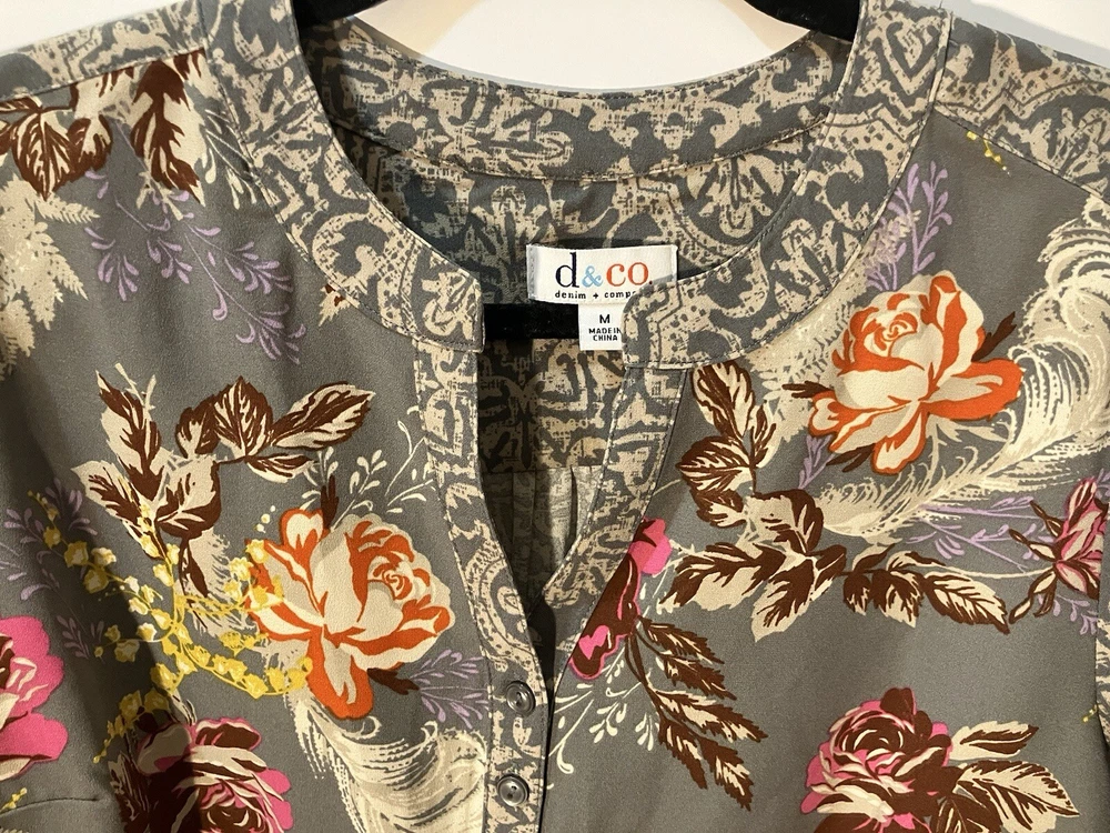 denim & company two pattern blouse front with gorgeous flowers and back has a fun classic geometric design v neck with 4 buttons pull over size M button sleeves 90% polyester 10%spandex Made in China machine wash cold separately gentle cycle, only non chlorine bleach when needed tumble dry low warm iron when needed lightly used but wholly loved!-- see photos for condition details, feel free to request additional photos if needed! **be sure to check out my other clothing listings for similar styles and sizes! many BNWT! any pre owned items may show normal signs of use-- if see any stains, rips, etc., I will do my best to provide photos. please do not hesitate to ask for more if needed! feel free to combine orders to save on shipping!