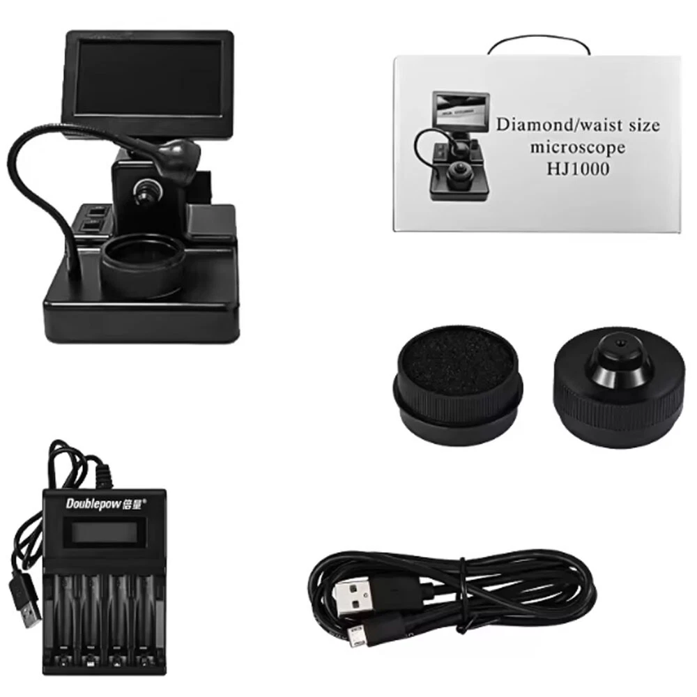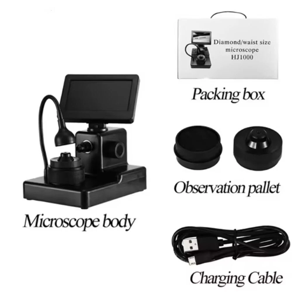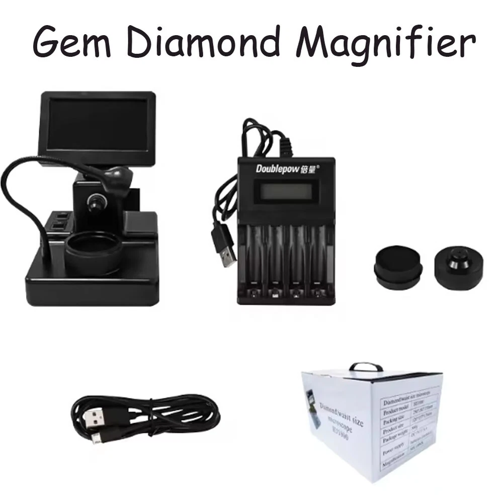 50X-1000X Digital Microscope Gem Diamond Magnifier Jewelry Inspection Magnifying Description: Diamond microscope use the latest technology, that can display laser inscription on a diamond girdle on a monitor, and let the stores and customers easy to confirm the properties of a diamond. With its streamlined shape and compact design,it is easy to display the diamond number and it's easy to carry. Specifications Type: Digital Microscope Gem Diamond Magnifier Magnification Ratio: 50X~1000X Power supply: 3*AA batteries (not included) LCD display: 4.3 inch Light source:LED light (white) Diamond type: Loose Diamond Product size: 120*157*176mm Packing size: 250*180*150mm Packing weight: 0.86kg What's in Package: 1x Gem Diamond Magnifier
