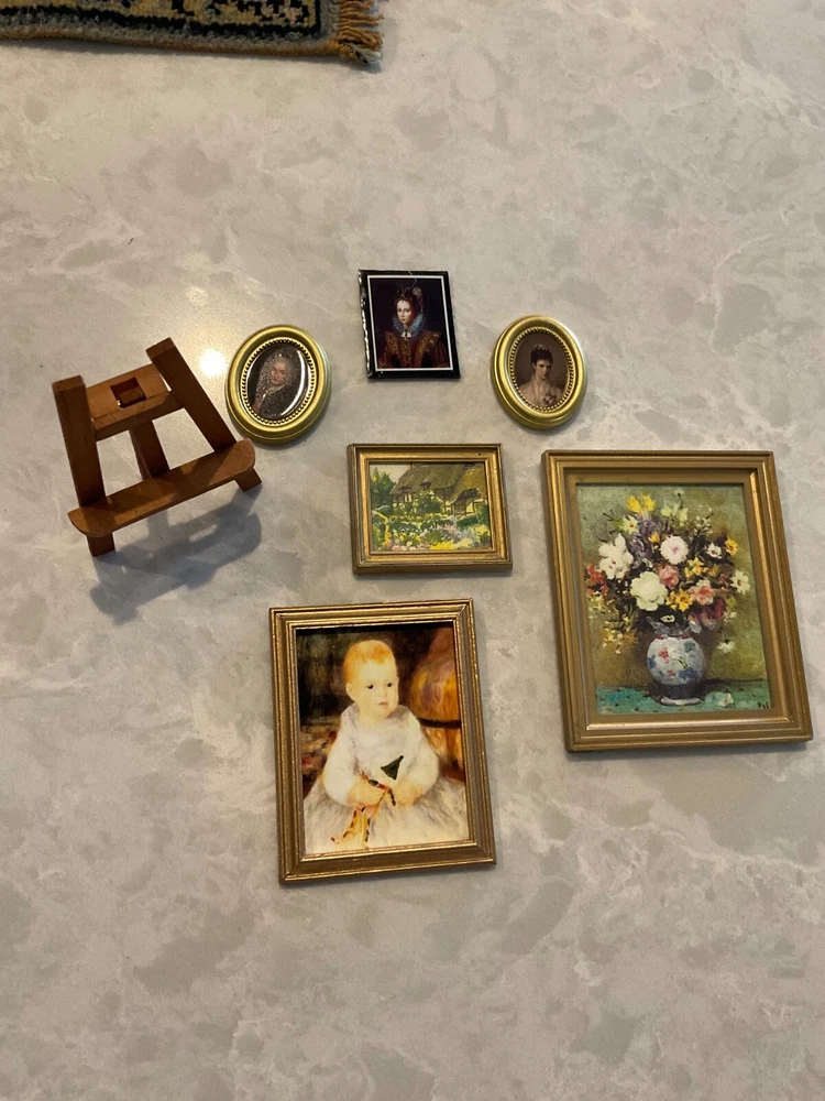 This dollhouse miniatures set includes assorted pillows, clocks, and a rug in a 1:12 scale. Perfect for adding realistic detail and charm to your dollhouse décor. The rug measures 9” by 13”. The little German style clock was handmade my me.