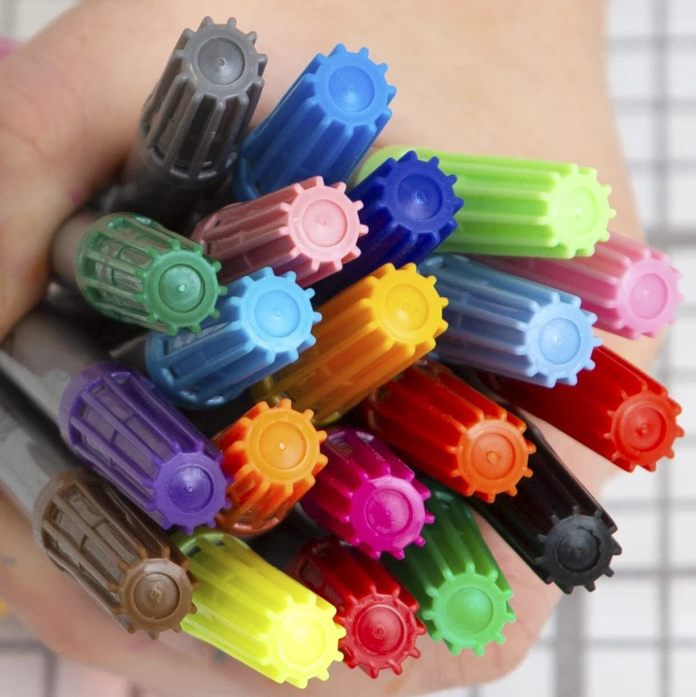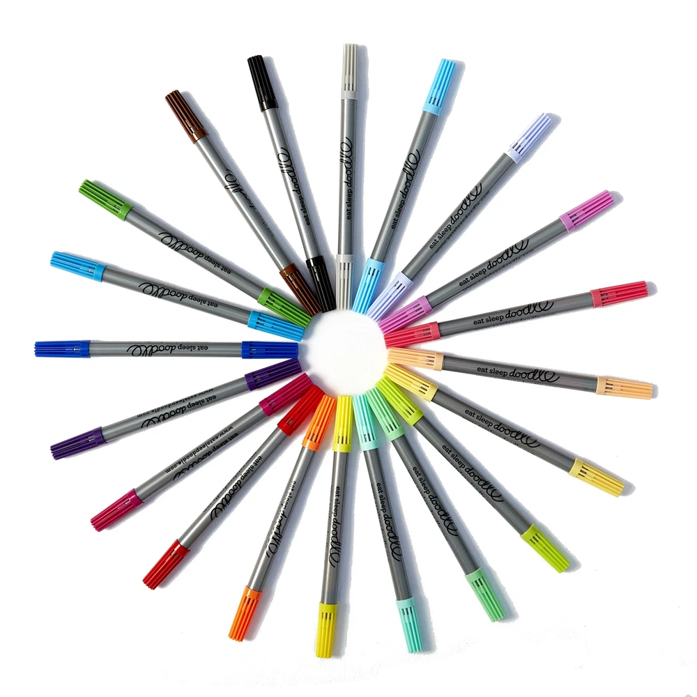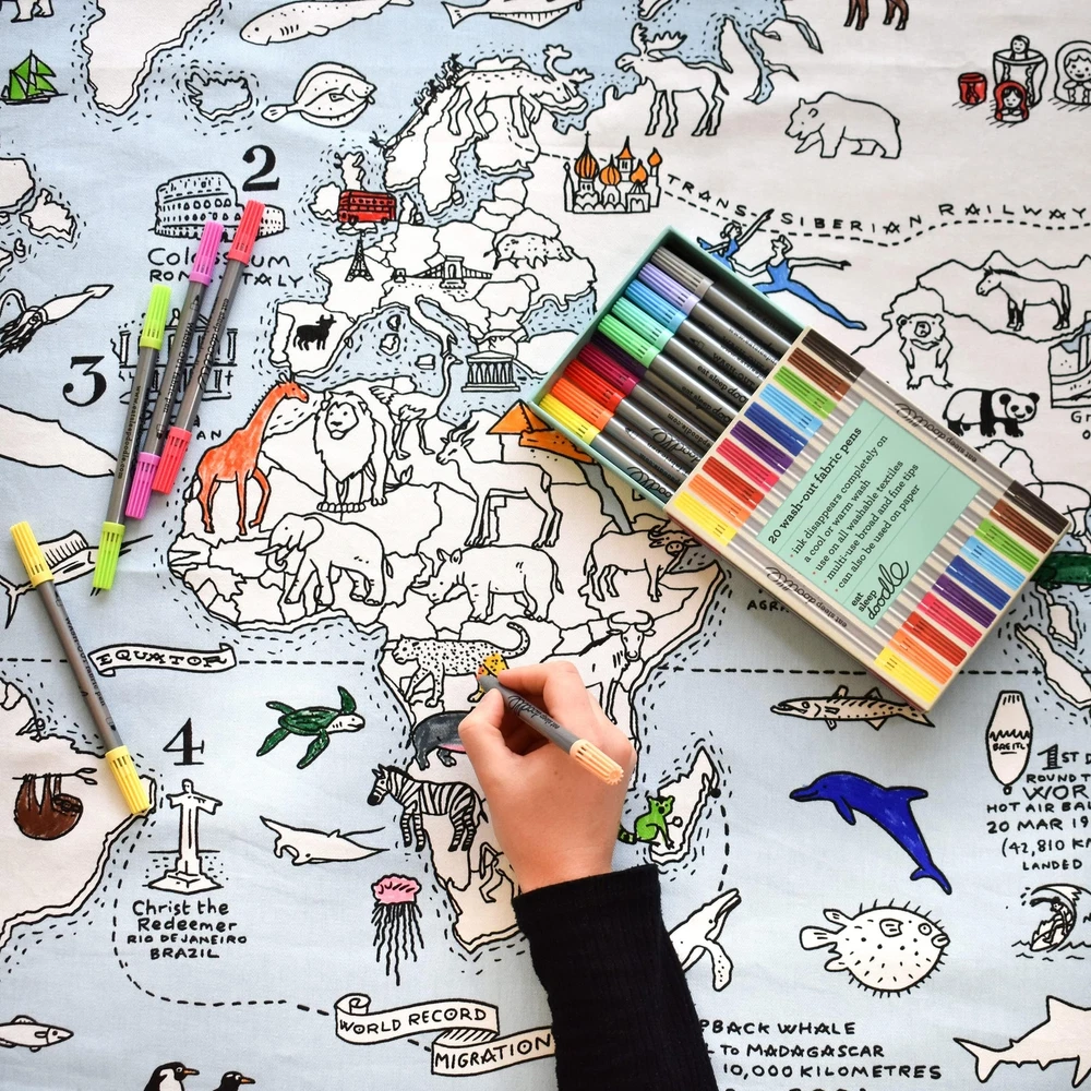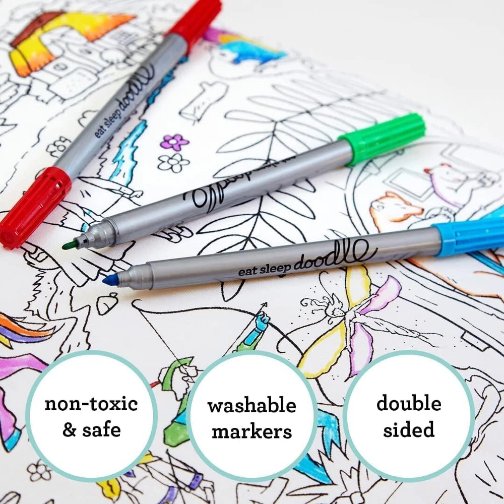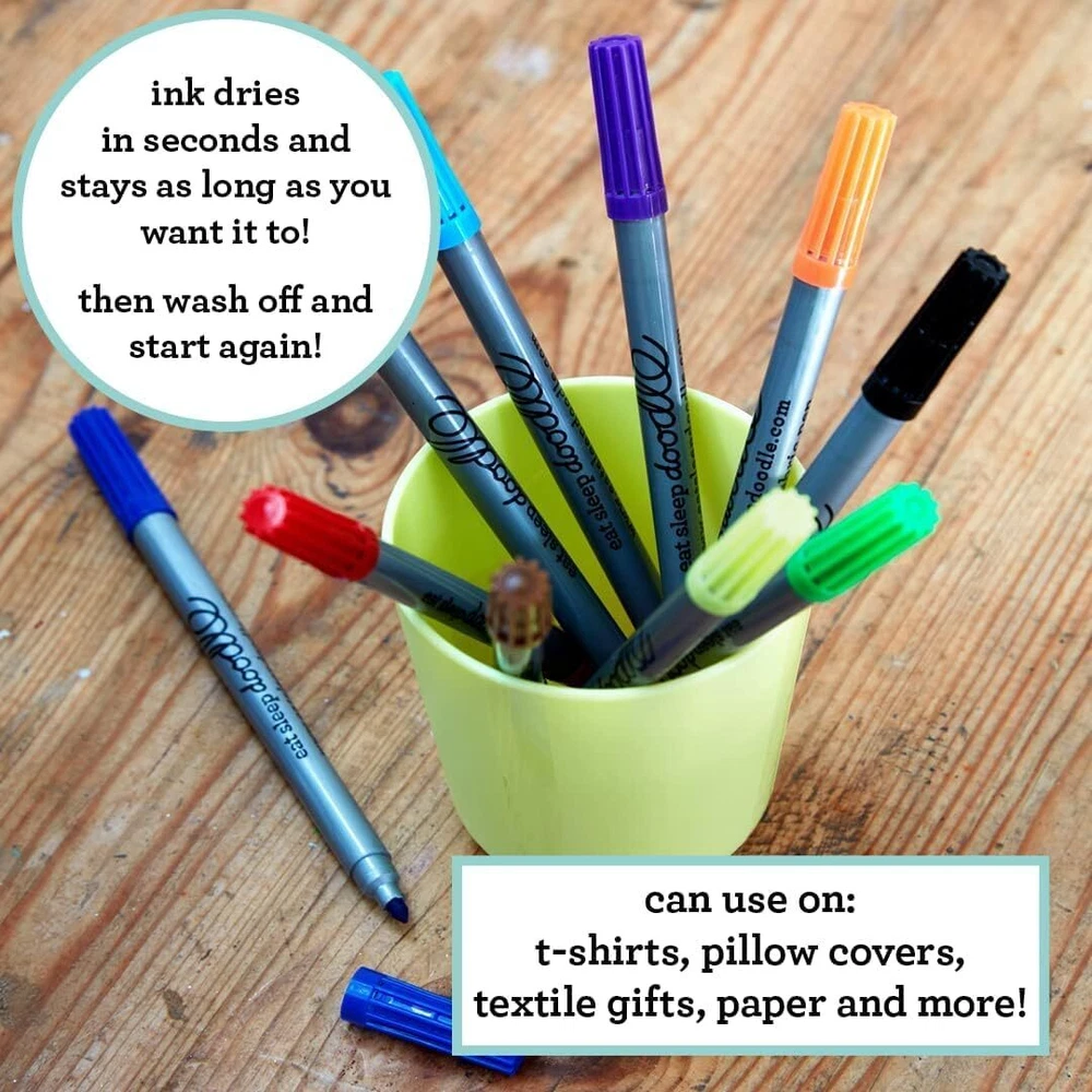 Artist set of 20 wash-out fabric markers with broad and fine tips. Perfect for extra creative types who love coloring and drawing. These also work well on paper and come in a cool, handy storage tube! Ink comes out of all washable textiles on a warm machine wash. Still More Colors - Our 20 double-ended wash-out marker set (one thin end, one thicker) features all the colors of the rainbow for still more design inspiration! Multi-Purpose - Like all our double-ended washout markers, this colorful rainbow palette of markers is designed for use on eatsleepdoodle textile gifts, but work equally well on any washable fabric and can be used like regular felt tip markers on paper, too. Eco-Friendly, Sustainable and Practical - Our eatsleepdoodle washable fabric markers use an environmentally friendly ink which disappears completely after a warm machine wash - ideal for use as fabric sewing markers and quilting marking pens. Child Friendly, Mess-free coloring - Doodle wash-out fabric markers with felt tips are great for children. Ink completely disappears from any washable textile. Drawing accidents can easily be removed! Each felt tip marker has been safety tested to Toy Standards. Includes plastic lid and measures 6.5in long. Creative Development - Double-ended nibs (one thin end, one thicker) give children more design possibilities and helps teach them about mark making and using different line weights.