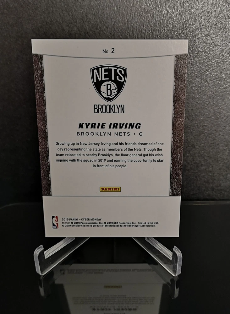 This is a rare and highly sought-after Kyrie Irving basketball trading card from the 2019 Panini Cyber Monday collection. The card features a stunning silver design with an embossed and serial numbered frame. It also has a unique laser and prism refractor finish that adds to its overall value and appeal. The card is a short print and is part of the Future Frames insert set. It showcases Kyrie Irving in his Cleveland Cavaliers, Boston Celtics, Duke Blue Devils, and Brooklyn Nets jerseys, making it a must-have for any fan or collector. Don't miss your chance to own this limited edition, original Panini card.