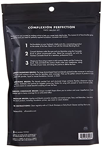 What it is: The complexion perfection brush kit is your secret weapon to a flawless face. This deluxe kit includes; ultimate blending brush; contouring brush; flawless concealer brush; and concealer brush. Why you'll love it: All e.l.f. Professional Makeup Brushes have been designed and tested by our professional team of makeup artists. Each brush is made with synthetic, animal hair-free bristles and is ergonomically designed to fit perfectly into your hand and facilitate an impeccable finish with every application. Ingredients may change or vary from time to time. Please refer to the packaging of the product received for the list of ingredients in your particular product. All e.l.f. products are proud to be 100% vegan, cruelty-free, and Leaping Bunny Certified. Because kindness is chic. BLEND & CONTOUR: This 4-piece face brush kit gives you all the tools to create flawless looks step-by-step. Use these brushes to apply foundation and concealer with ease. WHAT'S INCLUDED: This 4-piece brush set includes an Ultimate Blending Brush, Contouring Brush, Flawless Concealer Brush and Concealer Brush. MADE WITH SYNTHETIC BRISTLES: Made with 100% synthetic, cruelty-free bristles. SKIN-LOVING INGREDIENTS: All e.l.f. products are made from skin-loving ingredients you want, minus the toxins you don’t—all at good-for-you prices. All e.l.f. products are 100% cruelty-free and vegan. VEGAN & CRUELTY-FREE: 100% vegan, e.l.f. is double-certified cruelty-free by Leaping Bunny & PETA.